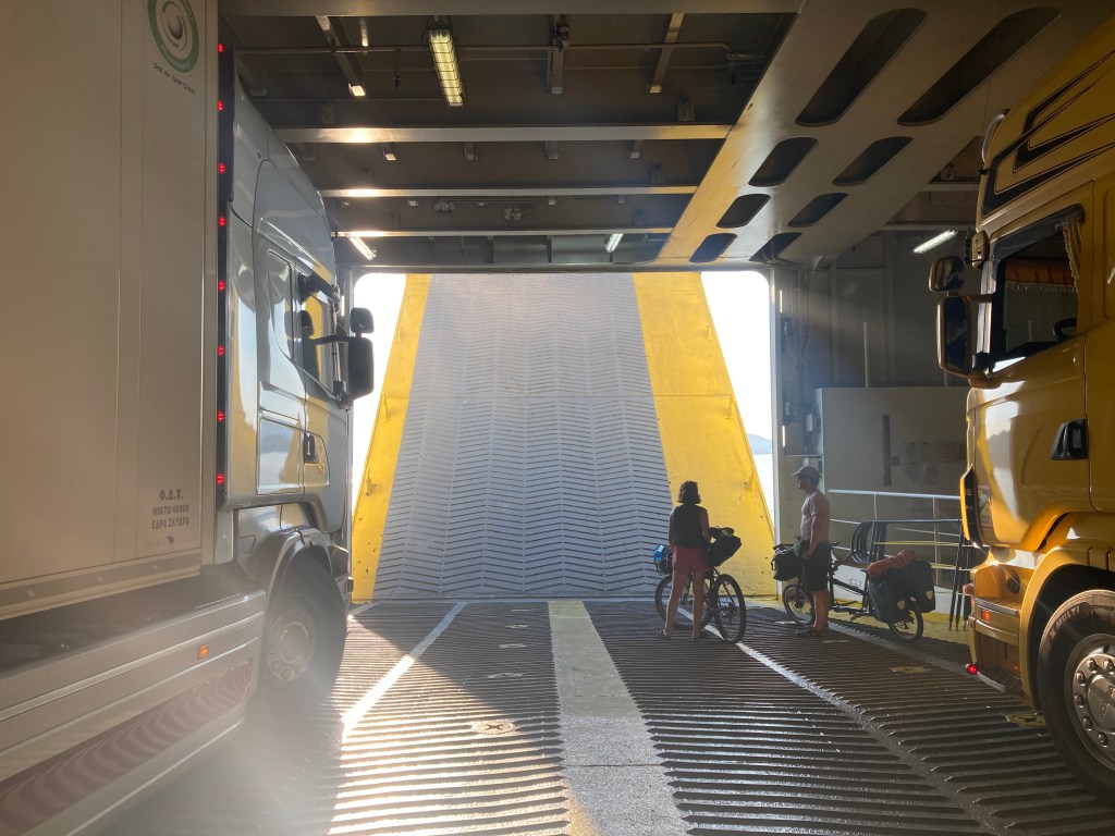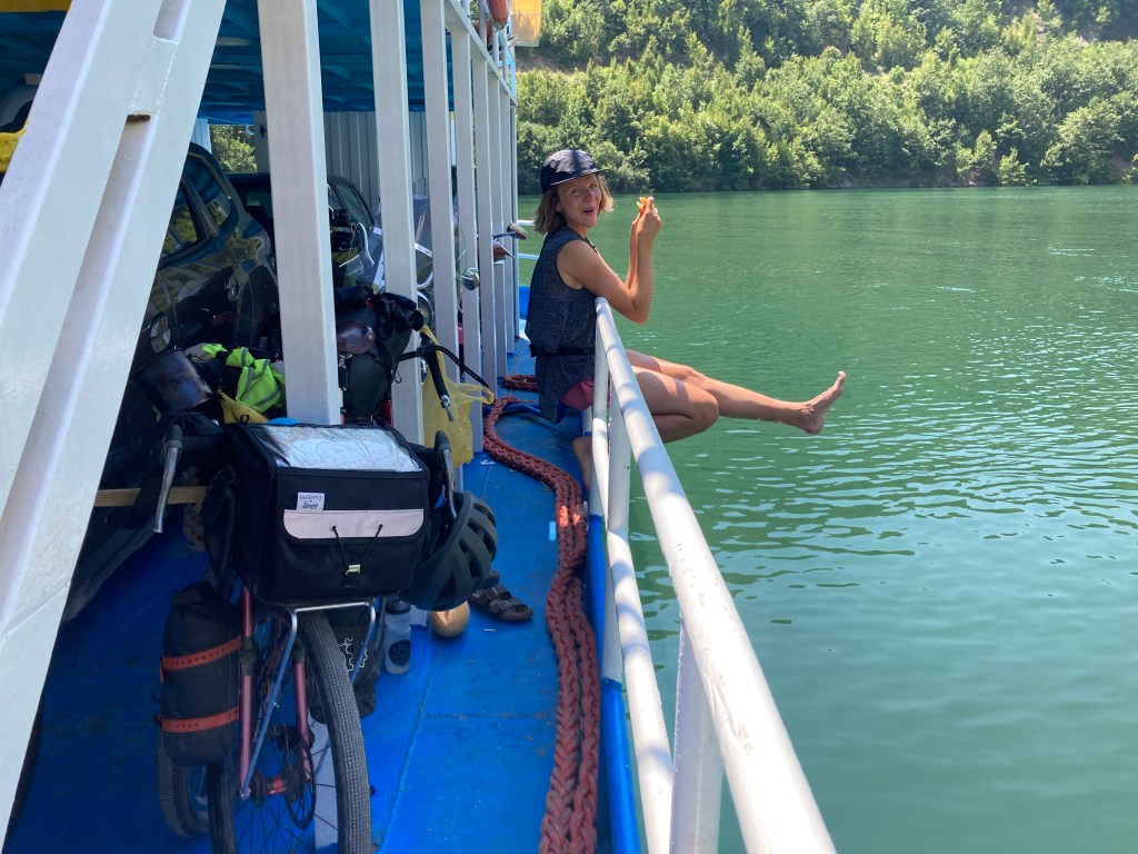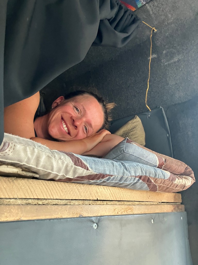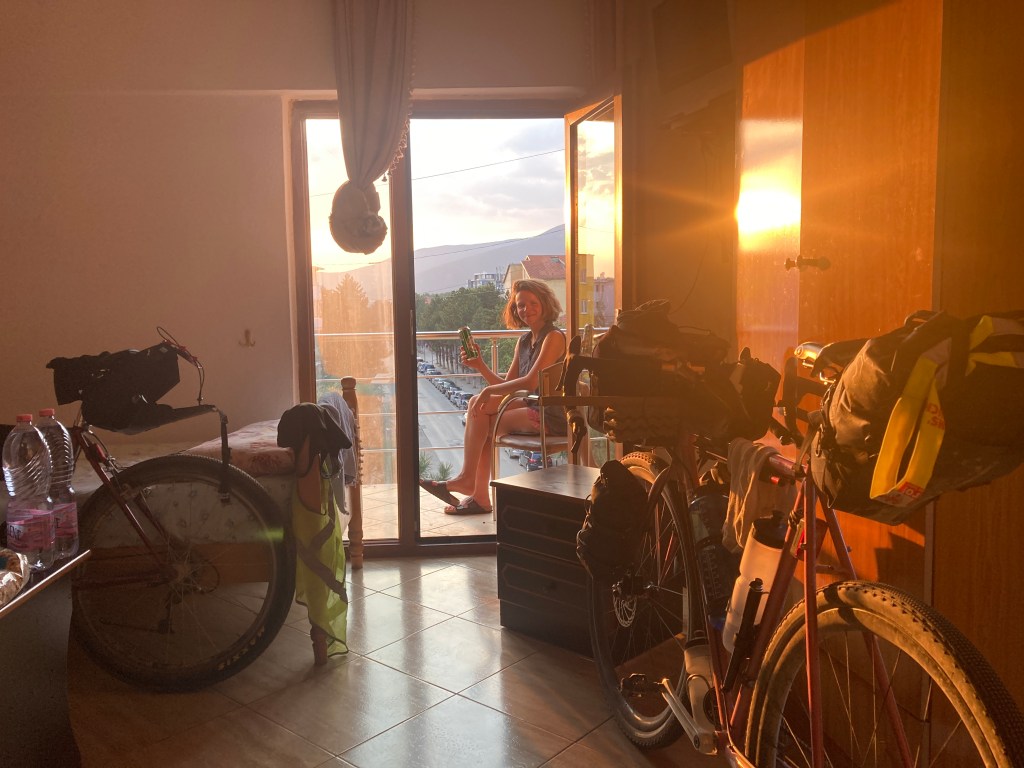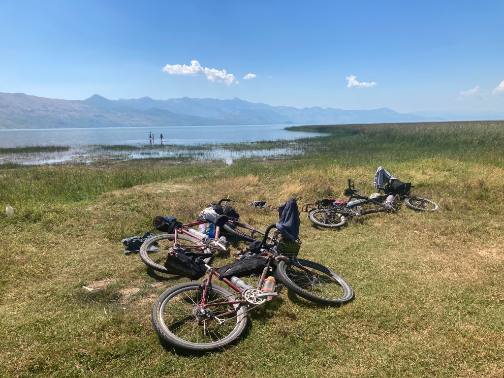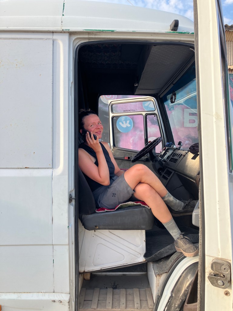 Heute frühstücken wir in einem sehr schicken und schönen Restaurant. Ehrlich gesagt haben wir noch keinen genauen Plan, wie wir weiterfahren wollen – beziehungsweise haben wir zu viele Pläne und können uns nicht so recht entscheiden. Ein entspannter Vormittag, um alle Möglichkeiten zu evaluieren, wird uns hoffentlich zu einem Ziel führen. Schließlich entscheiden wir uns, noch heute über eine weitere große Überlandstraße weiter Richtung Osten zu fahren, um dort eine einsame Runde nach Enilchek zu drehen. Der Wetterbericht ist nicht perfekt, daher halten wir uns die Möglichkeit offen, nur auf den ersten Pass hinaufzufahren und gegebenenfalls wieder umzudrehen. Wir nutzen die reichhaltigen Supermärkte der Stadt, laden Verpflegung auf und starten in Richtung Osten. Nach wenigen Kilometern wird uns bewusst, dass der Verkehr auf der Straße erneut extrem gefährlich ist und absolut keinen Spaß macht. Wir fackeln nicht lange und kehren wieder in die Stadt zurück. Auf dem Weg schmieden wir einen neuen Plan. Ich muss dazu noch erwähnen, dass wir nie vorhatten, die gesamte Reise als große Rundtour zu fahren und zurück nach Bischkek zu radeln. Stattdessen war von Anfang an der Plan, irgendwo am Yssykköl in einen Bus zu steigen, um damit wieder zum Ausgangspunkt unserer Reise zu gelangen. In einem Geistesblitz überlegen wir nun, weiter entlang des Sees zu trampen und am nördlichen Ufer wieder in die Berge abzubiegen, um anschließend zurück nach Bischkek zu radeln. Am Nordrand von Karakol angekommen, versuchen wir erneut unser Glück. Nach nur 15 Minuten haben wir eine Mitfahrgelegenheit für uns und unsere Räder gefunden: ein Sprinter-Pritschenwagen mit Doppelkabine – ein Fahrzeugtyp, der in Kirgistan zu Tausenden unterwegs ist, oft aus Jahrgängen und in fragwürdigen Zustand, die bei uns schon lange keinen TÜV mehr bekommen würden. Der Fahrer rast wie ein Wahnsinniger. Wir werden zweimal von der Polizei angehalten. Lachend erklärt er uns, dass sie bei Pkws die Versicherung kontrollieren, er aber einen Lkw fährt – und Lkws bräuchten in Kirgistan keine Versicherung. Selbstverständlich hat er auch keine. Die Straße ist extrem holprig, und er fordert dem alten Auto einiges ab! Wir wundern uns, dass wir kein Rad verlieren oder einen Platten haben. Irgendwann wird die Straße besser – dabei dröhnt lautstark russischer Techno aus den Lautsprechern. Wieder einmal ein köstliches Erlebnis. Wir werden bis zur Mitte des Nordufers des Yssykköl mitgenommen. Dort beginnt der Kok-Ayrzk Pass in Richtung Norden, den wir am nächsten Tag fahren möchten. Wir suchen uns schnell eine eher mittelmäßige, aber immerhin interessante Unterkunft und radeln anschließend an den See. Endlich schwimmen! Darauf freut sich Wiebke schon den ganzen Urlaub. Der Tag klingt langsam aus … später kochen wir in der Unterkunft.
