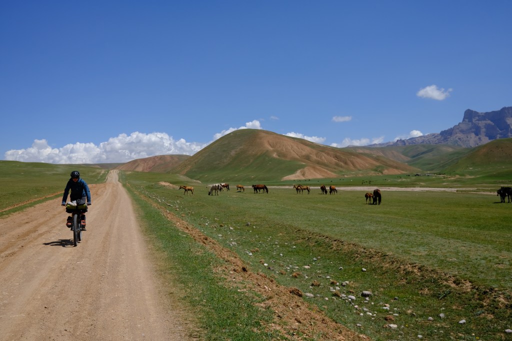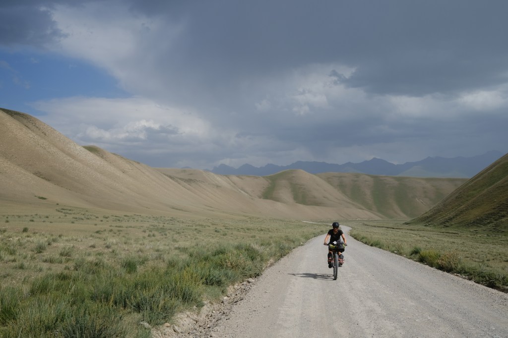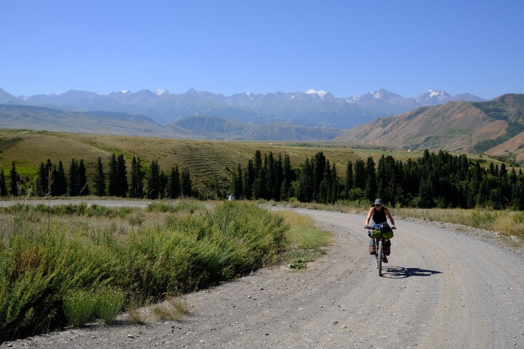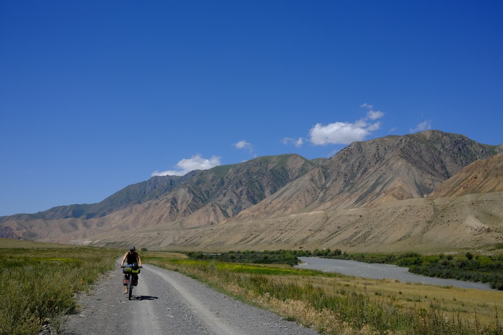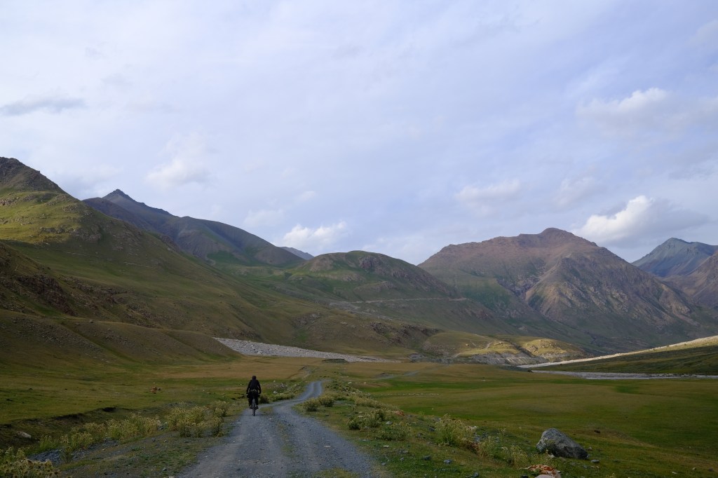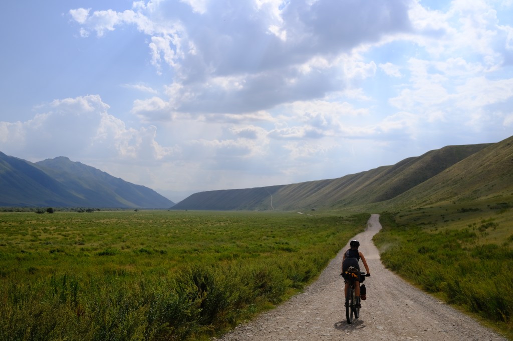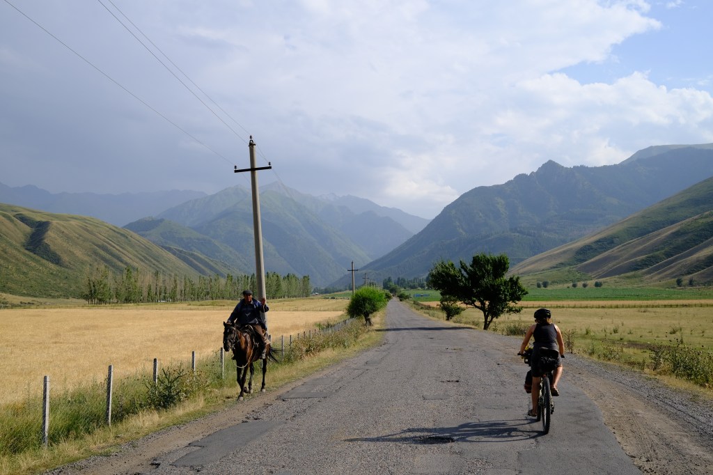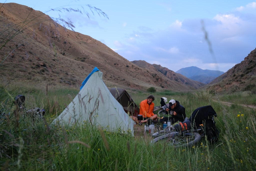Es geht weiter bergab, doch davor tausche ich die Hörnchen an meinem Lenker noch mit Wiebkes Hörnchen – in der Hoffnung, dass sie ihre tauben Finger und schmerzenden Handgelenke in den Griff bekommt. Leider stellen sich ihre Hörnchen als nicht ergonomisch genug für ihr Problem heraus – da haben wir zuvor nicht ausreichend getestet. Es geht durch einen wunderbaren Canyon, wir fahren immer weiter hinunter und passieren dabei verschiedene Vegetationszonen. Unglaublich schön! Es ist beeindruckend, wie vielfältig die Landschaft auf unserer Reise bis zu diesem Punkt bereits ist. Unterwegs halten wir in zwei kleinen Ortschaften. Im ersten Ort, Kyzyl-Oi, trinken wir einen wässrigen Kaffee. In Kirchin Village machen wir Mittagspause. Es gibt frisch gebackenes Fladenbrot, leckeren Saft, Snickers und Nüsse. Das kleine Geschäft mit seinem bunten Blumengarten taucht einfach wie aus dem Nichts am Straßenrand auf. Später gelangen wir auf eine Asphaltstraße, die uns Richtung Osten zum Songköl bringen soll. Nach drei Tagen auf Schotterpisten pumpe ich unsere Reifen auf, damit die bevorstehenden 60 km auf Asphalt zügiger vergehen. In der nächsten größeren Stadt, Chaek, treffen wir weitere Radreisende. Dann die große Überraschung: Ich erspähe das Fahrrad meines Freundes Marin! Marin ist mit dem Rad auf dem Weg zum Start des Silkroad-Rennens – wohlgemerkt auf dem Landweg. Ich wusste von seinem Plan, hätte aber nie geglaubt, ihn zufällig zu treffen. Wir kennen uns vom Transcontinental- und Transpyrenees-Race vor ein paar Jahren. Das Wiedersehen ist rührend. Marin hat keinen Stress und entscheidet spontan, uns in die Richtung zu begleiten, aus der er gerade gekommen ist, um den Abend mit uns zu verbringen. Kurz vor der Abzweigung von der Hauptstraße in Kuyruchuk laden wir noch einmal unsere Räder mit Wasser und Lebensmitteln auf und biegen dann auf eine Schotterpiste ab – Richtung Süden, Richtung Berge, Richtung Songköl. Beim Überqueren einer Hochebene flüchten wir mit Vollgas vor einem Gewitter, während Marin mir erzählt, wie das Long-Distance-Racing immer professioneller wird und mittlerweile jeder Topfahrer und jede Topfahrerin mit einem Coach und einem strukturierten Trainingsplan arbeitet. Wiebke hält tapfer durch und bleibt an unseren Hinterrädern. Wir flüchten in einen Canyon und suchen dort, direkt an einem kleinen Wasserlauf, einen schönen Lagerplatz neben der Straße. Es gibt Pasta, Chips und Fisch aus der Dose. Wir reden lange, bevor wir schließlich in unseren Zelten in einen wohlverdienten Schlaf fallen.