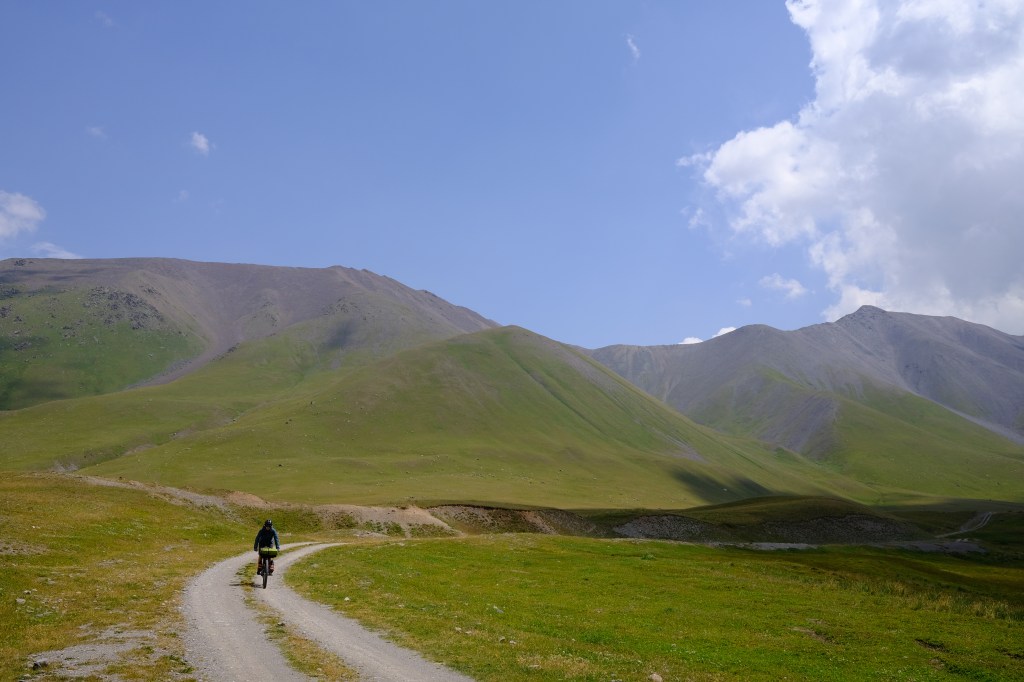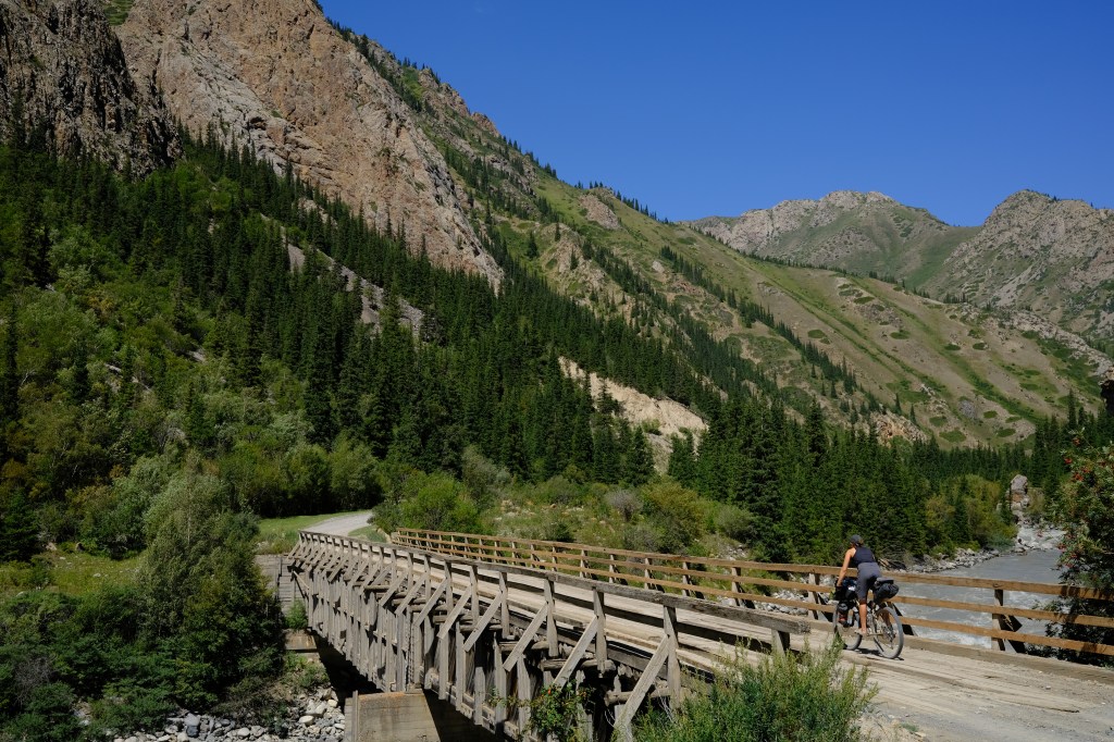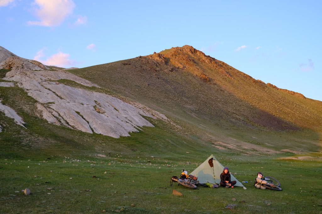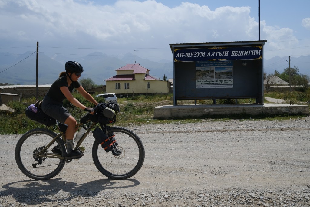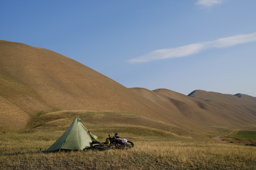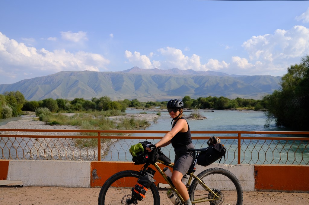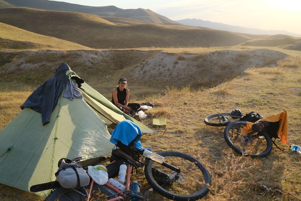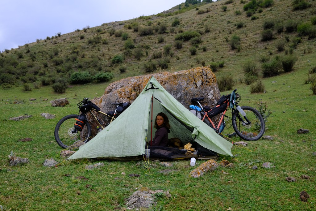 Es geht weiter bergab, doch davor tausche ich die Hörnchen an meinem Lenker noch mit Wiebkes Hörnchen – in der Hoffnung, dass sie ihre tauben Finger und schmerzenden Handgelenke in den Griff bekommt. Leider stellen sich ihre Hörnchen als nicht ergonomisch genug für ihr Problem heraus – da haben wir zuvor nicht ausreichend getestet. Es geht durch einen wunderbaren Canyon, wir fahren immer weiter hinunter und passieren dabei verschiedene Vegetationszonen. Unglaublich schön! Es ist beeindruckend, wie vielfältig die Landschaft auf unserer Reise bis zu diesem Punkt bereits ist. Unterwegs halten wir in zwei kleinen Ortschaften. Im ersten Ort, Kyzyl-Oi, trinken wir einen wässrigen Kaffee. In Kirchin Village machen wir Mittagspause. Es gibt frisch gebackenes Fladenbrot, leckeren Saft, Snickers und Nüsse. Das kleine Geschäft mit seinem bunten Blumengarten taucht einfach wie aus dem Nichts am Straßenrand auf. Später gelangen wir auf eine Asphaltstraße, die uns Richtung Osten zum Songköl bringen soll. Nach drei Tagen auf Schotterpisten pumpe ich unsere Reifen auf, damit die bevorstehenden 60 km auf Asphalt zügiger vergehen. In der nächsten größeren Stadt, Chaek, treffen wir weitere Radreisende. Dann die große Überraschung: Ich erspähe das Fahrrad meines Freundes Marin! Marin ist mit dem Rad auf dem Weg zum Start des Silkroad-Rennens – wohlgemerkt auf dem Landweg. Ich wusste von seinem Plan, hätte aber nie geglaubt, ihn zufällig zu treffen. Wir kennen uns vom Transcontinental- und Transpyrenees-Race vor ein paar Jahren. Das Wiedersehen ist rührend. Marin hat keinen Stress und entscheidet spontan, uns in die Richtung zu begleiten, aus der er gerade gekommen ist, um den Abend mit uns zu verbringen. Kurz vor der Abzweigung von der Hauptstraße in Kuyruchuk laden wir noch einmal unsere Räder mit Wasser und Lebensmitteln auf und biegen dann auf eine Schotterpiste ab – Richtung Süden, Richtung Berge, Richtung Songköl. Beim Überqueren einer Hochebene flüchten wir mit Vollgas vor einem Gewitter, während Marin mir erzählt, wie das Long-Distance-Racing immer professioneller wird und mittlerweile jeder Topfahrer und jede Topfahrerin mit einem Coach und einem strukturierten Trainingsplan arbeitet. Wiebke hält tapfer durch und bleibt an unseren Hinterrädern. Wir flüchten in einen Canyon und suchen dort, direkt an einem kleinen Wasserlauf, einen schönen Lagerplatz neben der Straße. Es gibt Pasta, Chips und Fisch aus der Dose. Wir reden lange, bevor wir schließlich in unseren Zelten in einen wohlverdienten Schlaf fallen.