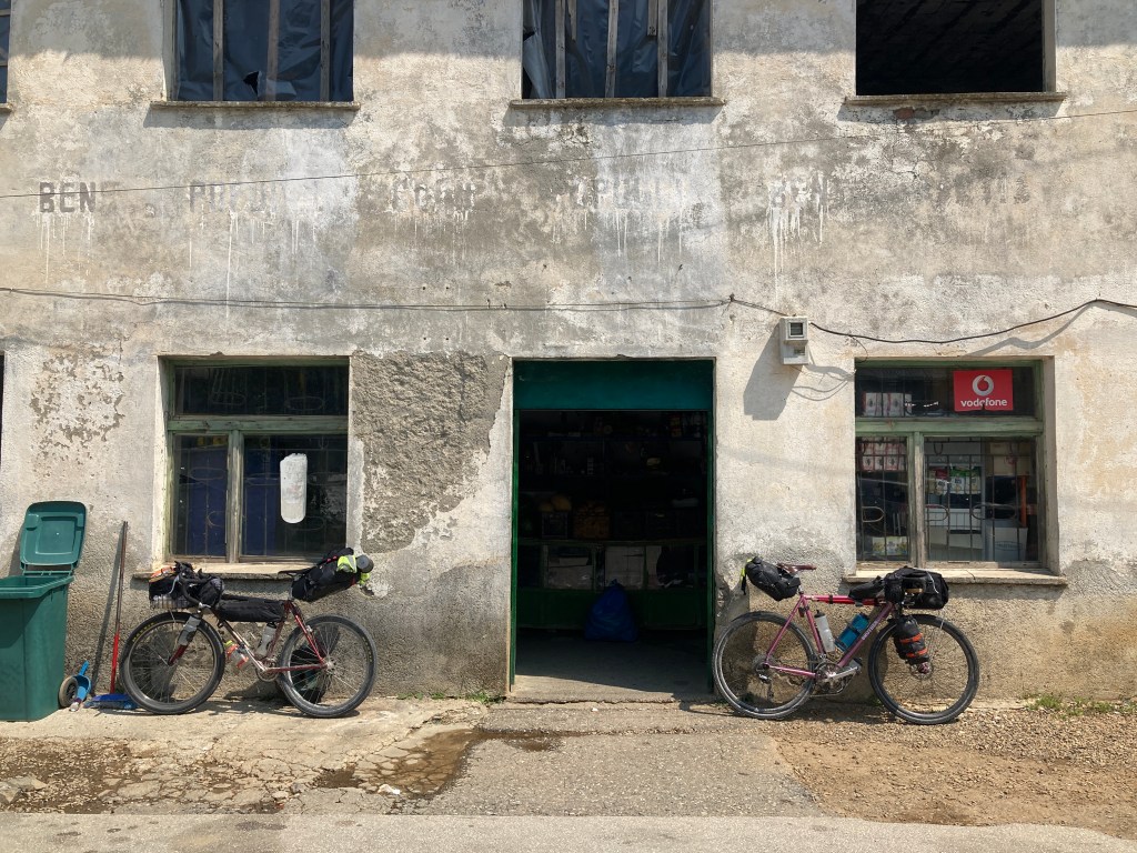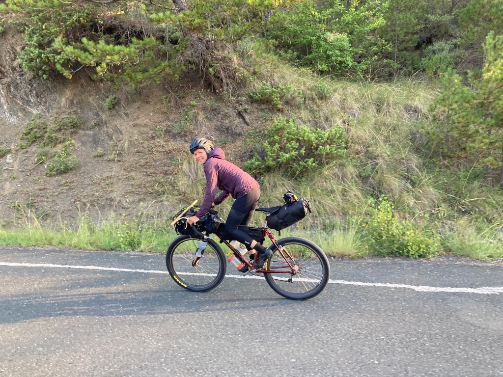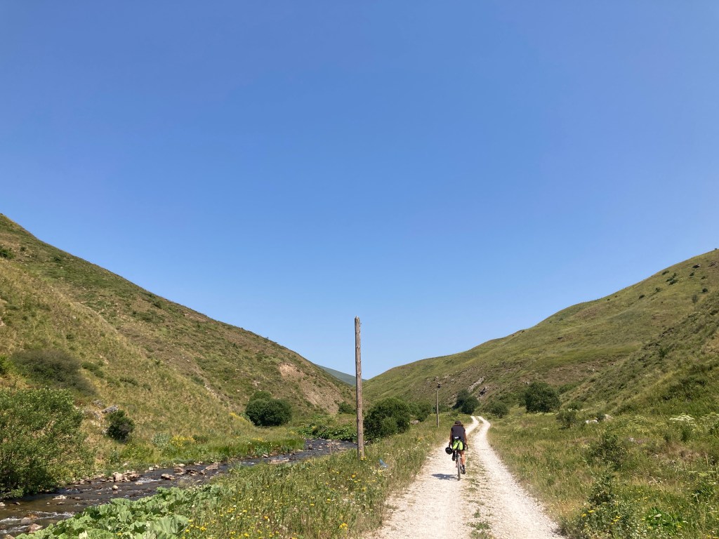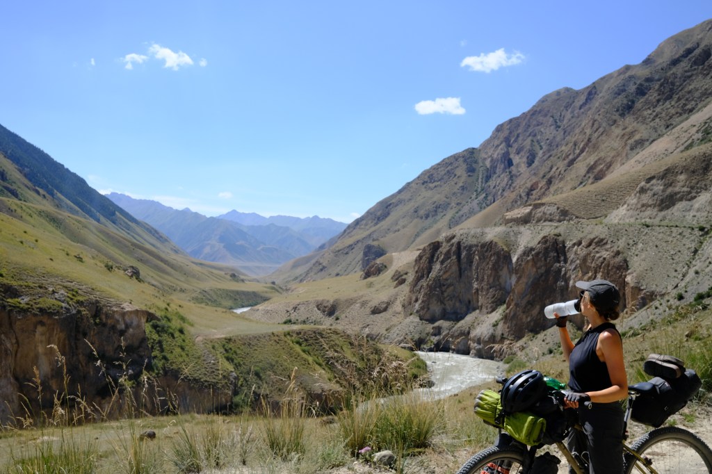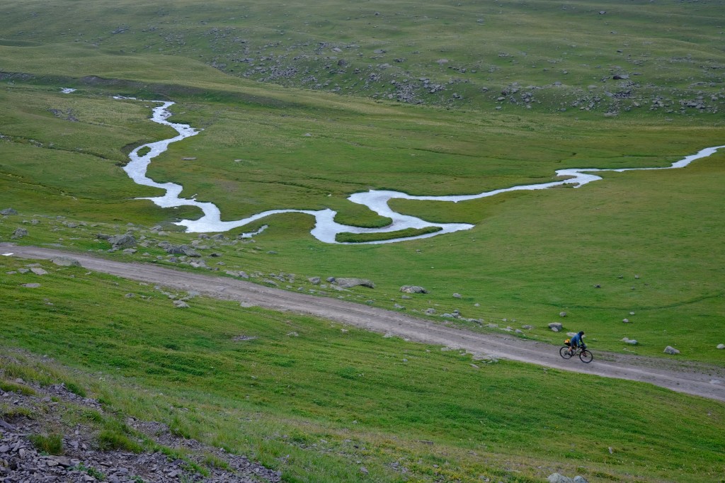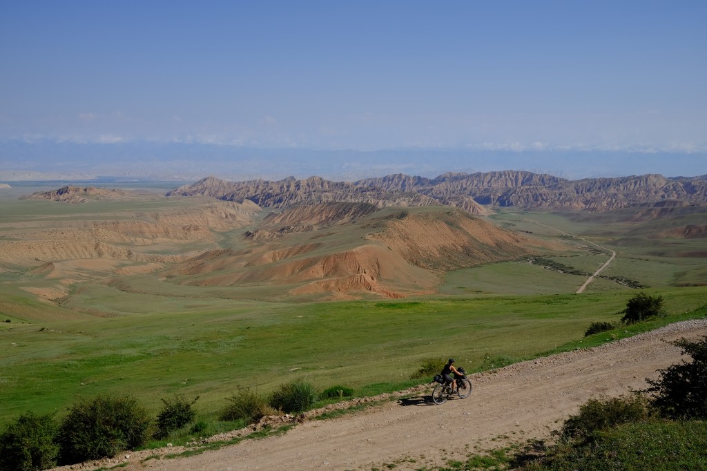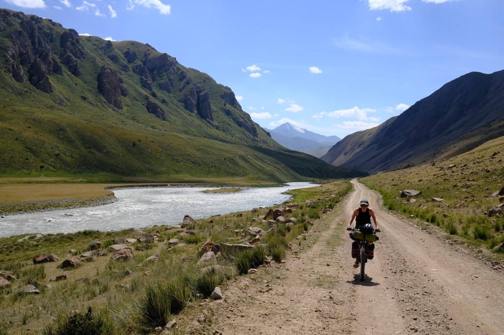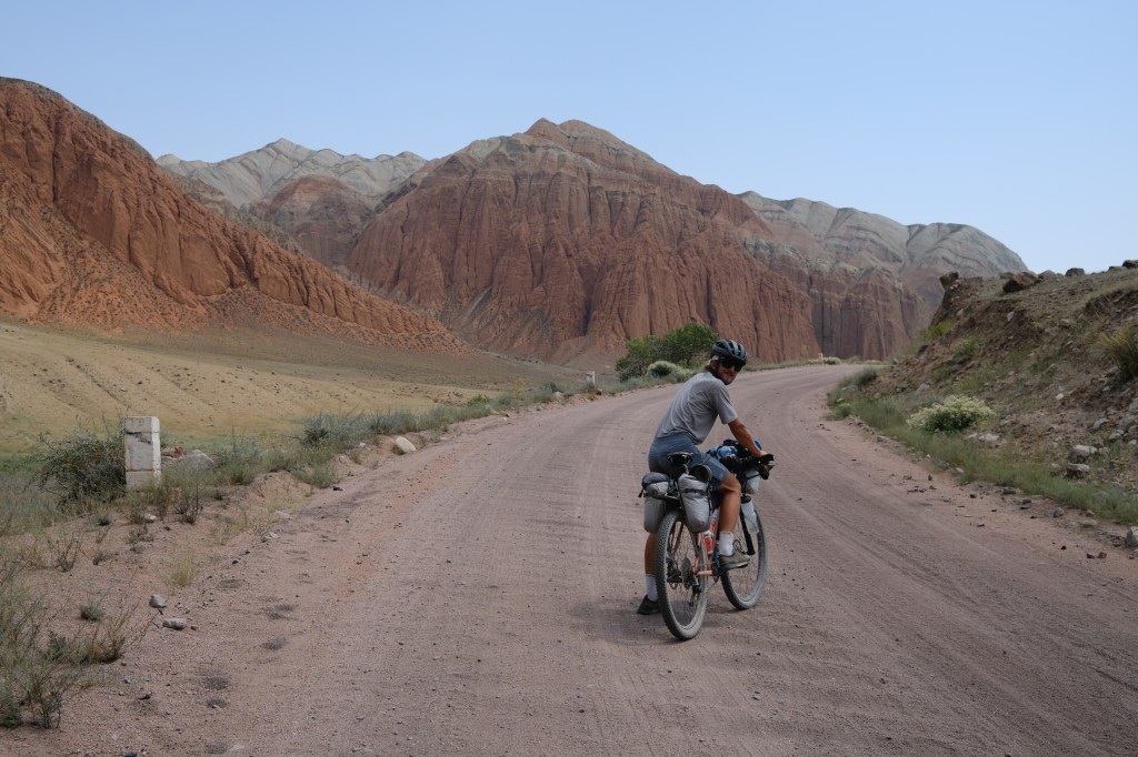 Es geht weiter bergab, doch davor tausche ich die Hörnchen an meinem Lenker noch mit Wiebkes Hörnchen – in der Hoffnung, dass sie ihre tauben Finger und schmerzenden Handgelenke in den Griff bekommt. Leider stellen sich ihre Hörnchen als nicht ergonomisch genug für ihr Problem heraus – da haben wir zuvor nicht ausreichend getestet. Es geht durch einen wunderbaren Canyon, wir fahren immer weiter hinunter und passieren dabei verschiedene Vegetationszonen. Unglaublich schön! Es ist beeindruckend, wie vielfältig die Landschaft auf unserer Reise bis zu diesem Punkt bereits ist. Unterwegs halten wir in zwei kleinen Ortschaften. Im ersten Ort, Kyzyl-Oi, trinken wir einen wässrigen Kaffee. In Kirchin Village machen wir Mittagspause. Es gibt frisch gebackenes Fladenbrot, leckeren Saft, Snickers und Nüsse. Das kleine Geschäft mit seinem bunten Blumengarten taucht einfach wie aus dem Nichts am Straßenrand auf. Später gelangen wir auf eine Asphaltstraße, die uns Richtung Osten zum Songköl bringen soll. Nach drei Tagen auf Schotterpisten pumpe ich unsere Reifen auf, damit die bevorstehenden 60 km auf Asphalt zügiger vergehen. In der nächsten größeren Stadt, Chaek, treffen wir weitere Radreisende. Dann die große Überraschung: Ich erspähe das Fahrrad meines Freundes Marin! Marin ist mit dem Rad auf dem Weg zum Start des Silkroad-Rennens – wohlgemerkt auf dem Landweg. Ich wusste von seinem Plan, hätte aber nie geglaubt, ihn zufällig zu treffen. Wir kennen uns vom Transcontinental- und Transpyrenees-Race vor ein paar Jahren. Das Wiedersehen ist rührend. Marin hat keinen Stress und entscheidet spontan, uns in die Richtung zu begleiten, aus der er gerade gekommen ist, um den Abend mit uns zu verbringen. Kurz vor der Abzweigung von der Hauptstraße in Kuyruchuk laden wir noch einmal unsere Räder mit Wasser und Lebensmitteln auf und biegen dann auf eine Schotterpiste ab – Richtung Süden, Richtung Berge, Richtung Songköl. Beim Überqueren einer Hochebene flüchten wir mit Vollgas vor einem Gewitter, während Marin mir erzählt, wie das Long-Distance-Racing immer professioneller wird und mittlerweile jeder Topfahrer und jede Topfahrerin mit einem Coach und einem strukturierten Trainingsplan arbeitet. Wiebke hält tapfer durch und bleibt an unseren Hinterrädern. Wir flüchten in einen Canyon und suchen dort, direkt an einem kleinen Wasserlauf, einen schönen Lagerplatz neben der Straße. Es gibt Pasta, Chips und Fisch aus der Dose. Wir reden lange, bevor wir schließlich in unseren Zelten in einen wohlverdienten Schlaf fallen.