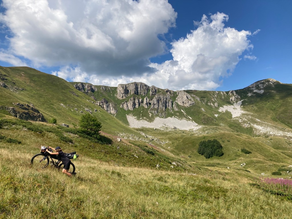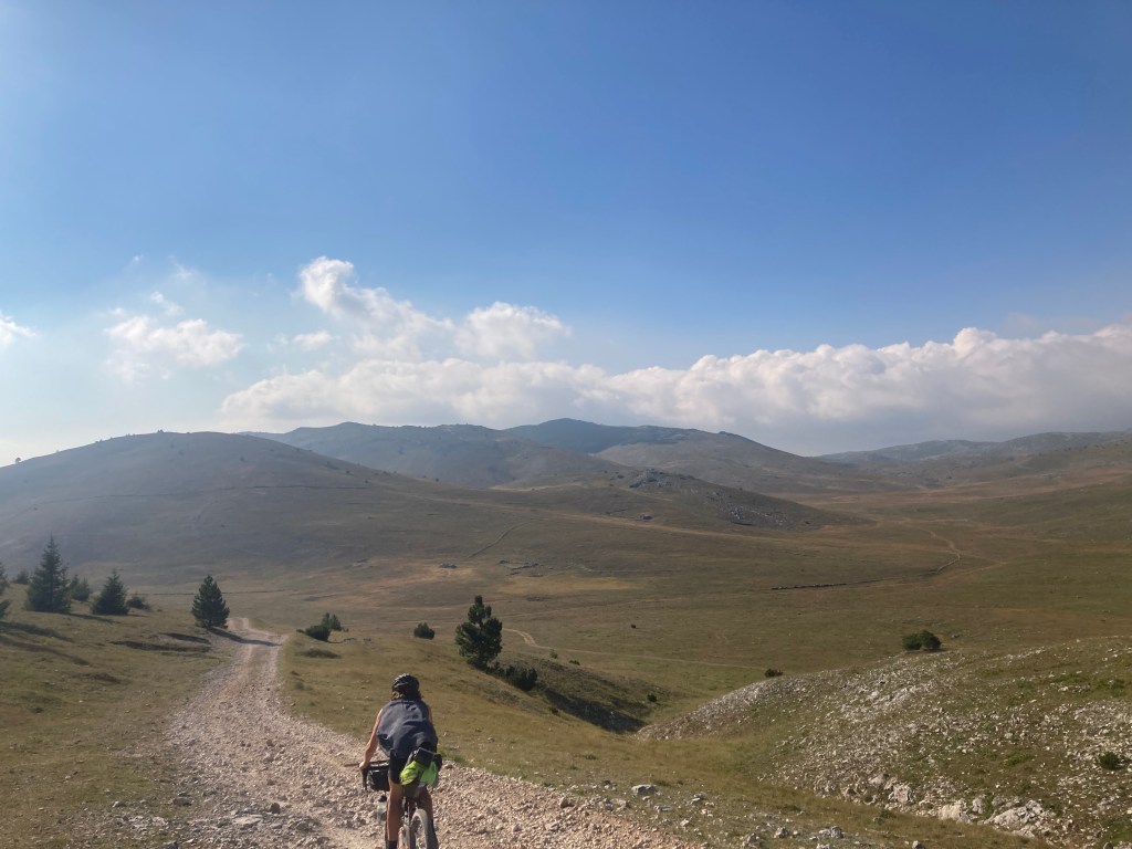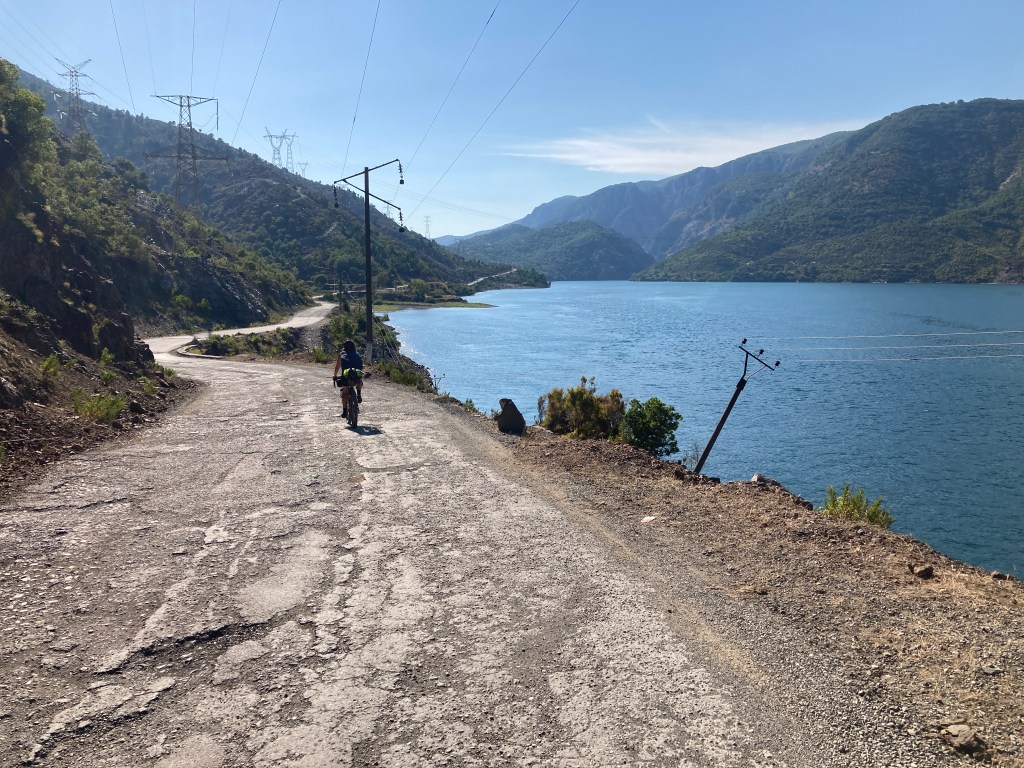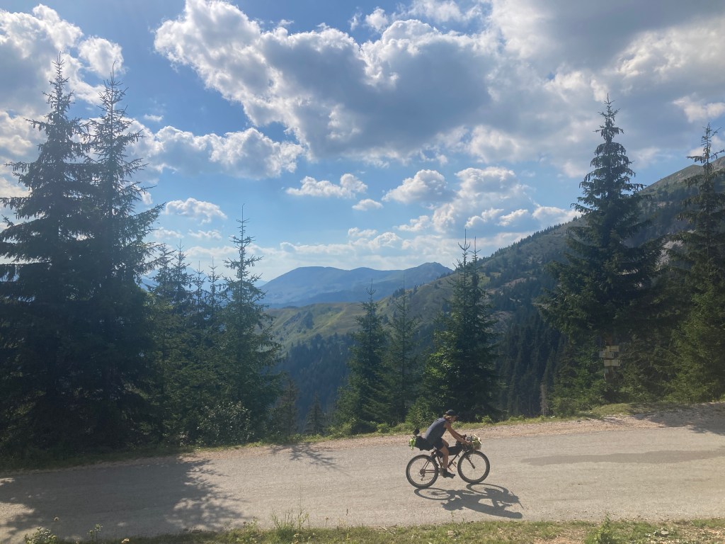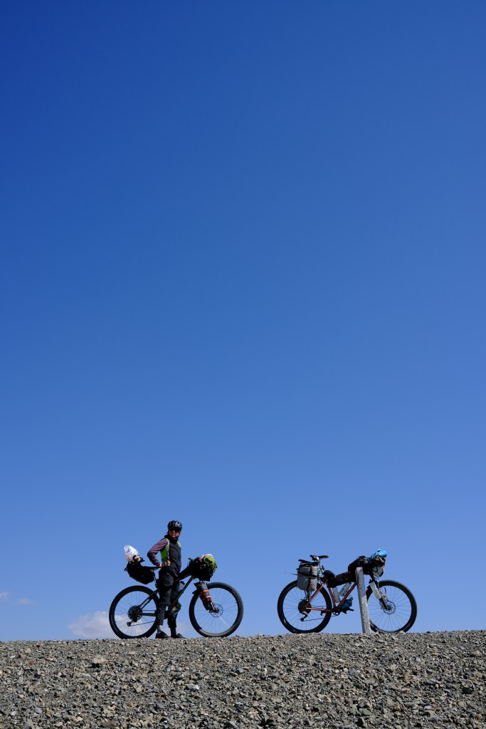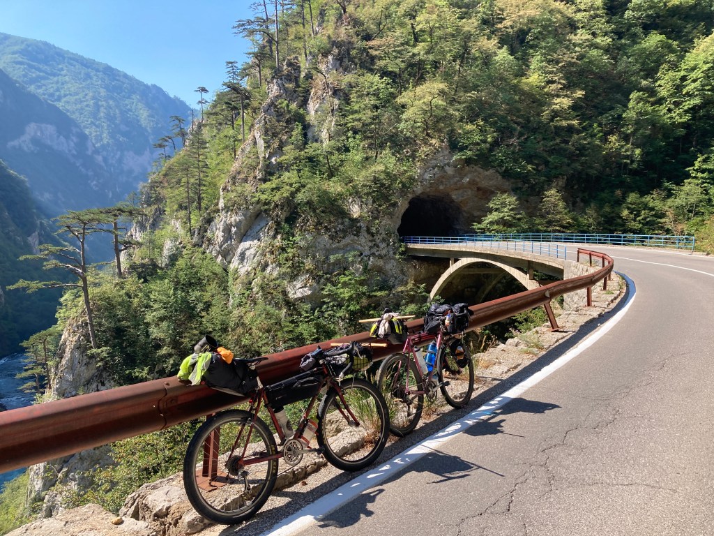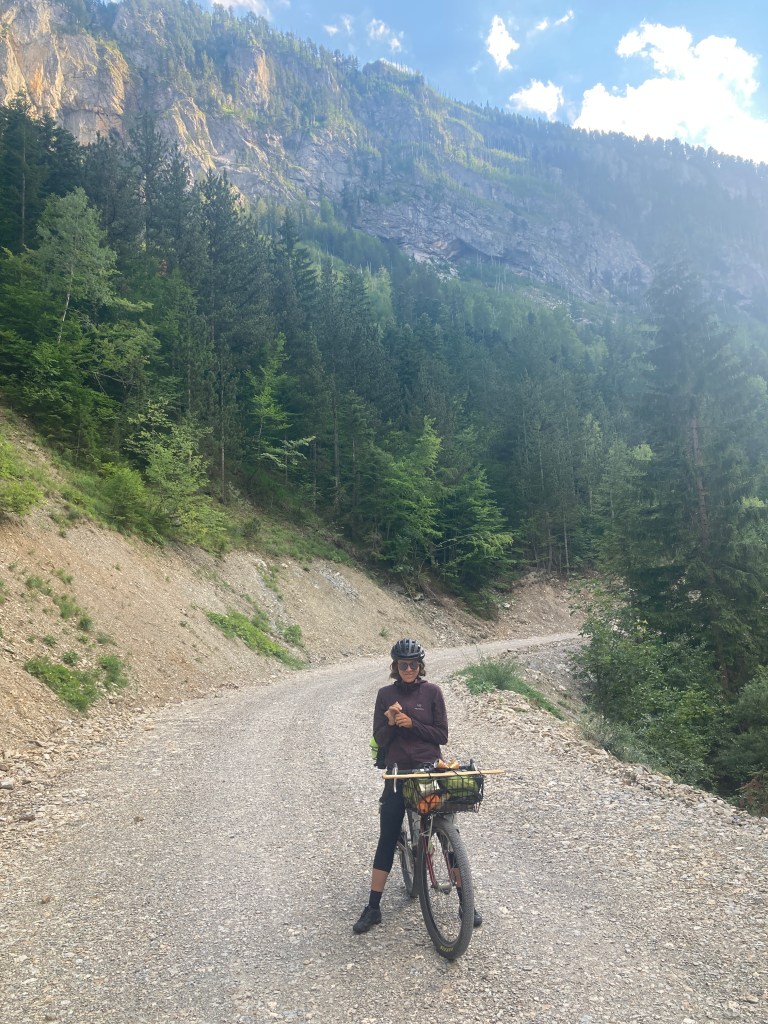 Es geht weiter bergab, doch davor tausche ich die Hörnchen an meinem Lenker noch mit Wiebkes Hörnchen – in der Hoffnung, dass sie ihre tauben Finger und schmerzenden Handgelenke in den Griff bekommt. Leider stellen sich ihre Hörnchen als nicht ergonomisch genug für ihr Problem heraus – da haben wir zuvor nicht ausreichend getestet. Es geht durch einen wunderbaren Canyon, wir fahren immer weiter hinunter und passieren dabei verschiedene Vegetationszonen. Unglaublich schön! Es ist beeindruckend, wie vielfältig die Landschaft auf unserer Reise bis zu diesem Punkt bereits ist. Unterwegs halten wir in zwei kleinen Ortschaften. Im ersten Ort, Kyzyl-Oi, trinken wir einen wässrigen Kaffee. In Kirchin Village machen wir Mittagspause. Es gibt frisch gebackenes Fladenbrot, leckeren Saft, Snickers und Nüsse. Das kleine Geschäft mit seinem bunten Blumengarten taucht einfach wie aus dem Nichts am Straßenrand auf. Später gelangen wir auf eine Asphaltstraße, die uns Richtung Osten zum Songköl bringen soll. Nach drei Tagen auf Schotterpisten pumpe ich unsere Reifen auf, damit die bevorstehenden 60 km auf Asphalt zügiger vergehen. In der nächsten größeren Stadt, Chaek, treffen wir weitere Radreisende. Dann die große Überraschung: Ich erspähe das Fahrrad meines Freundes Marin! Marin ist mit dem Rad auf dem Weg zum Start des Silkroad-Rennens – wohlgemerkt auf dem Landweg. Ich wusste von seinem Plan, hätte aber nie geglaubt, ihn zufällig zu treffen. Wir kennen uns vom Transcontinental- und Transpyrenees-Race vor ein paar Jahren. Das Wiedersehen ist rührend. Marin hat keinen Stress und entscheidet spontan, uns in die Richtung zu begleiten, aus der er gerade gekommen ist, um den Abend mit uns zu verbringen. Kurz vor der Abzweigung von der Hauptstraße in Kuyruchuk laden wir noch einmal unsere Räder mit Wasser und Lebensmitteln auf und biegen dann auf eine Schotterpiste ab – Richtung Süden, Richtung Berge, Richtung Songköl. Beim Überqueren einer Hochebene flüchten wir mit Vollgas vor einem Gewitter, während Marin mir erzählt, wie das Long-Distance-Racing immer professioneller wird und mittlerweile jeder Topfahrer und jede Topfahrerin mit einem Coach und einem strukturierten Trainingsplan arbeitet. Wiebke hält tapfer durch und bleibt an unseren Hinterrädern. Wir flüchten in einen Canyon und suchen dort, direkt an einem kleinen Wasserlauf, einen schönen Lagerplatz neben der Straße. Es gibt Pasta, Chips und Fisch aus der Dose. Wir reden lange, bevor wir schließlich in unseren Zelten in einen wohlverdienten Schlaf fallen.