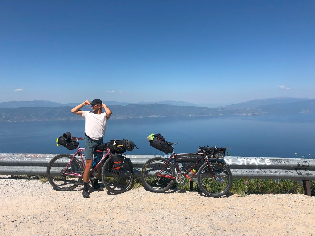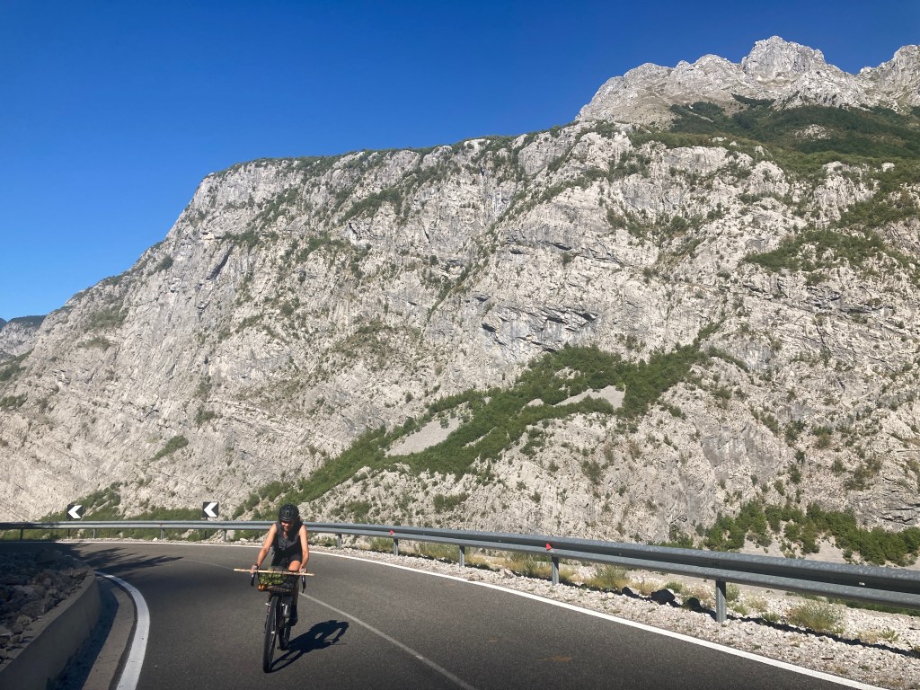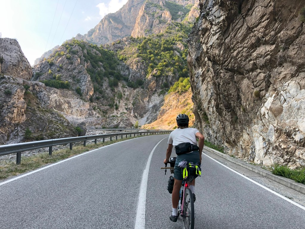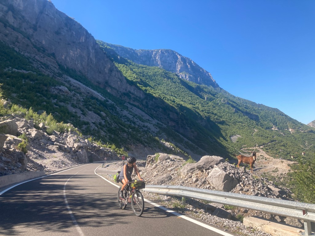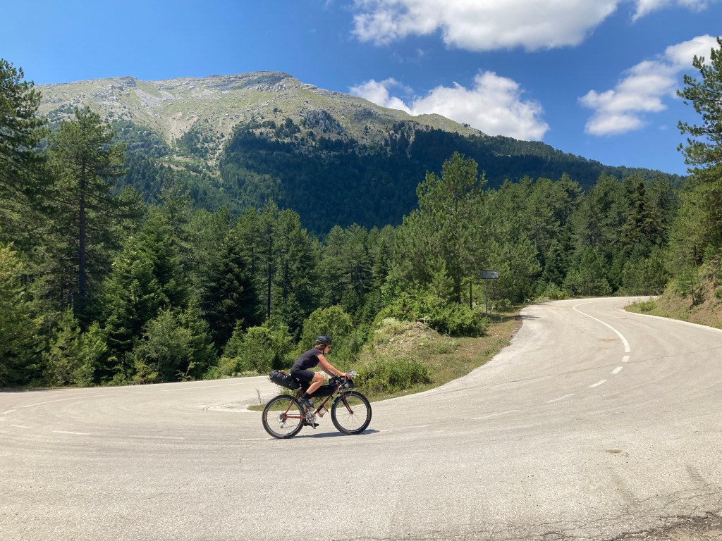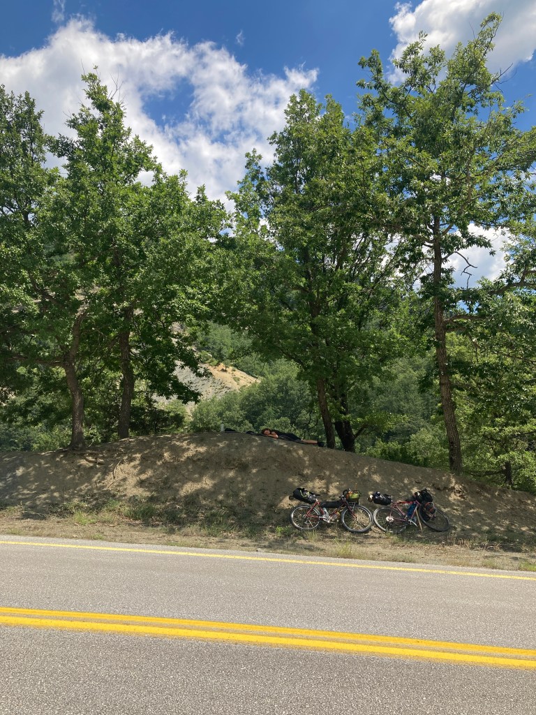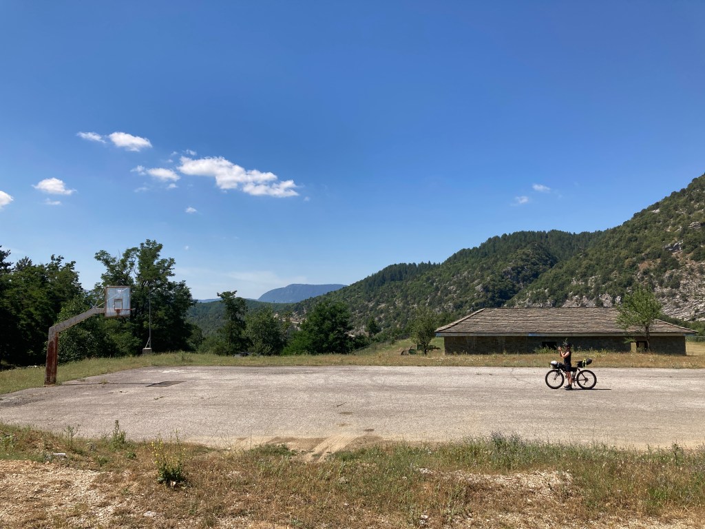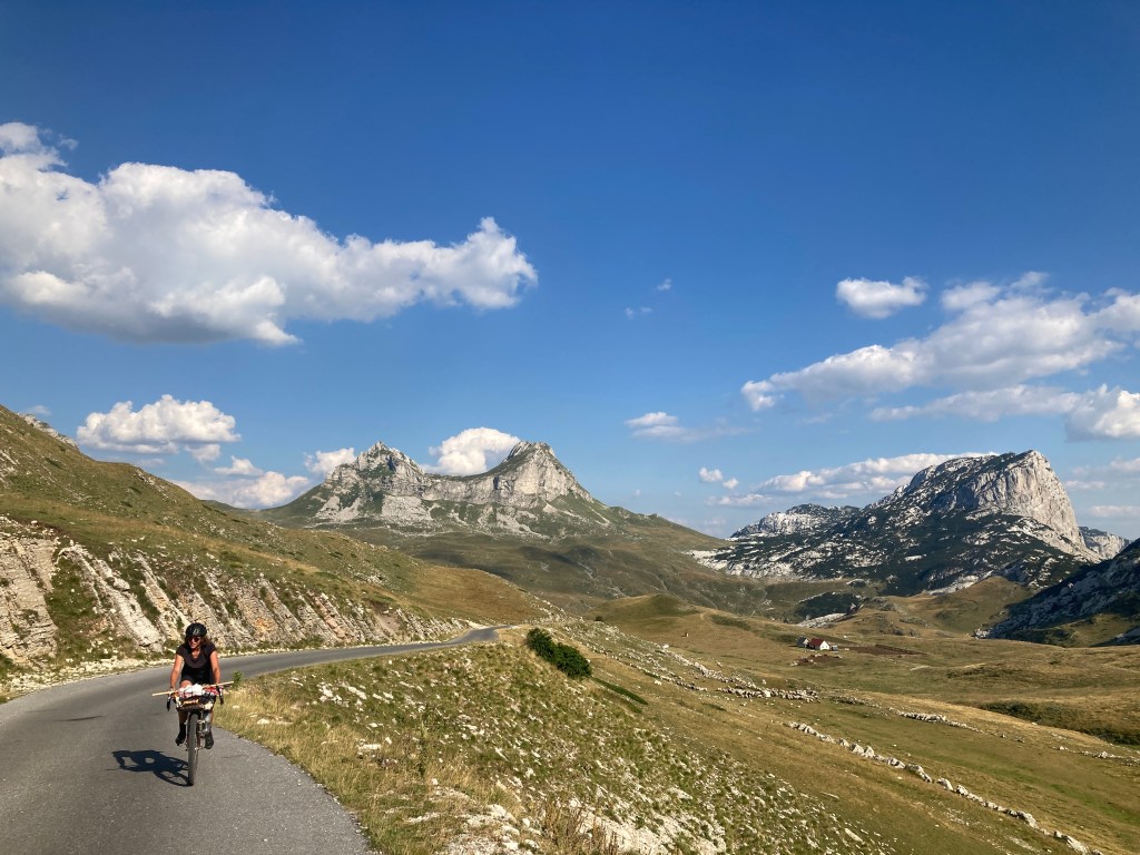 Es geht weiter bergab, doch davor tausche ich die Hörnchen an meinem Lenker noch mit Wiebkes Hörnchen – in der Hoffnung, dass sie ihre tauben Finger und schmerzenden Handgelenke in den Griff bekommt. Leider stellen sich ihre Hörnchen als nicht ergonomisch genug für ihr Problem heraus – da haben wir zuvor nicht ausreichend getestet. Es geht durch einen wunderbaren Canyon, wir fahren immer weiter hinunter und passieren dabei verschiedene Vegetationszonen. Unglaublich schön! Es ist beeindruckend, wie vielfältig die Landschaft auf unserer Reise bis zu diesem Punkt bereits ist. Unterwegs halten wir in zwei kleinen Ortschaften. Im ersten Ort, Kyzyl-Oi, trinken wir einen wässrigen Kaffee. In Kirchin Village machen wir Mittagspause. Es gibt frisch gebackenes Fladenbrot, leckeren Saft, Snickers und Nüsse. Das kleine Geschäft mit seinem bunten Blumengarten taucht einfach wie aus dem Nichts am Straßenrand auf. Später gelangen wir auf eine Asphaltstraße, die uns Richtung Osten zum Songköl bringen soll. Nach drei Tagen auf Schotterpisten pumpe ich unsere Reifen auf, damit die bevorstehenden 60 km auf Asphalt zügiger vergehen. In der nächsten größeren Stadt, Chaek, treffen wir weitere Radreisende. Dann die große Überraschung: Ich erspähe das Fahrrad meines Freundes Marin! Marin ist mit dem Rad auf dem Weg zum Start des Silkroad-Rennens – wohlgemerkt auf dem Landweg. Ich wusste von seinem Plan, hätte aber nie geglaubt, ihn zufällig zu treffen. Wir kennen uns vom Transcontinental- und Transpyrenees-Race vor ein paar Jahren. Das Wiedersehen ist rührend. Marin hat keinen Stress und entscheidet spontan, uns in die Richtung zu begleiten, aus der er gerade gekommen ist, um den Abend mit uns zu verbringen. Kurz vor der Abzweigung von der Hauptstraße in Kuyruchuk laden wir noch einmal unsere Räder mit Wasser und Lebensmitteln auf und biegen dann auf eine Schotterpiste ab – Richtung Süden, Richtung Berge, Richtung Songköl. Beim Überqueren einer Hochebene flüchten wir mit Vollgas vor einem Gewitter, während Marin mir erzählt, wie das Long-Distance-Racing immer professioneller wird und mittlerweile jeder Topfahrer und jede Topfahrerin mit einem Coach und einem strukturierten Trainingsplan arbeitet. Wiebke hält tapfer durch und bleibt an unseren Hinterrädern. Wir flüchten in einen Canyon und suchen dort, direkt an einem kleinen Wasserlauf, einen schönen Lagerplatz neben der Straße. Es gibt Pasta, Chips und Fisch aus der Dose. Wir reden lange, bevor wir schließlich in unseren Zelten in einen wohlverdienten Schlaf fallen.