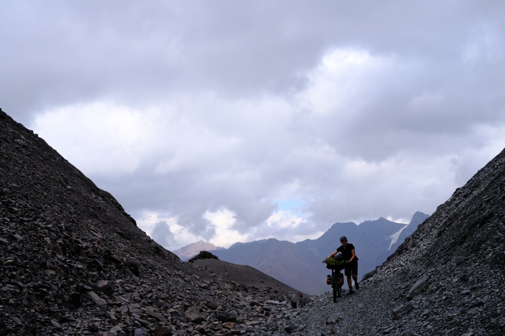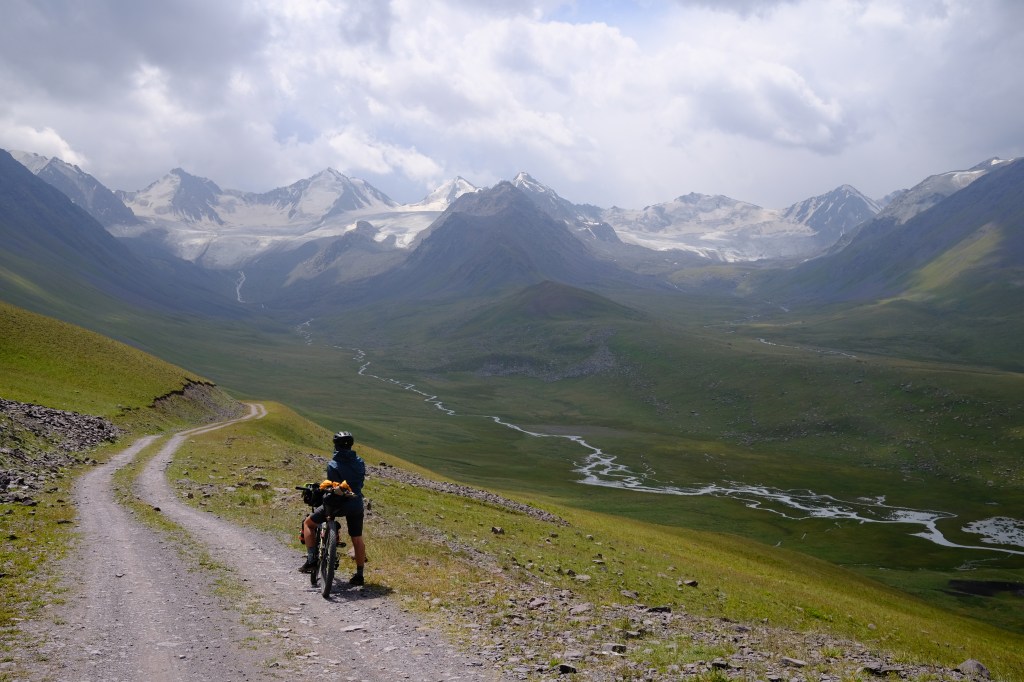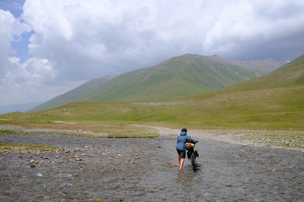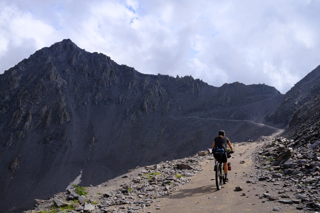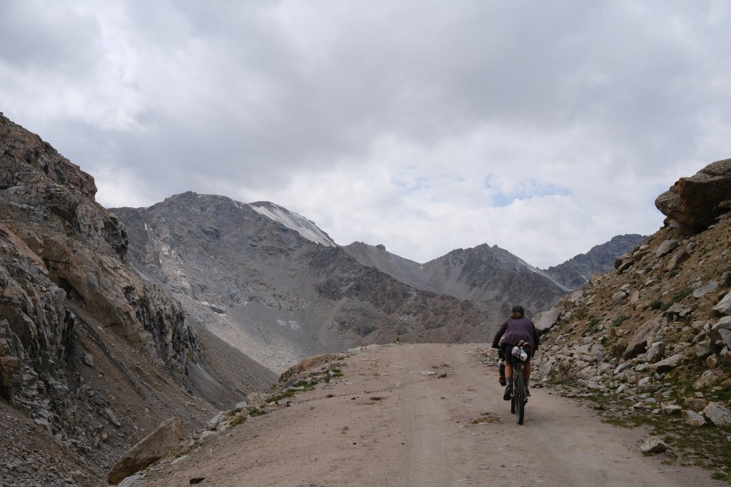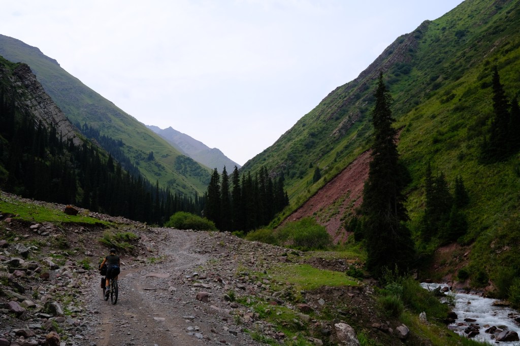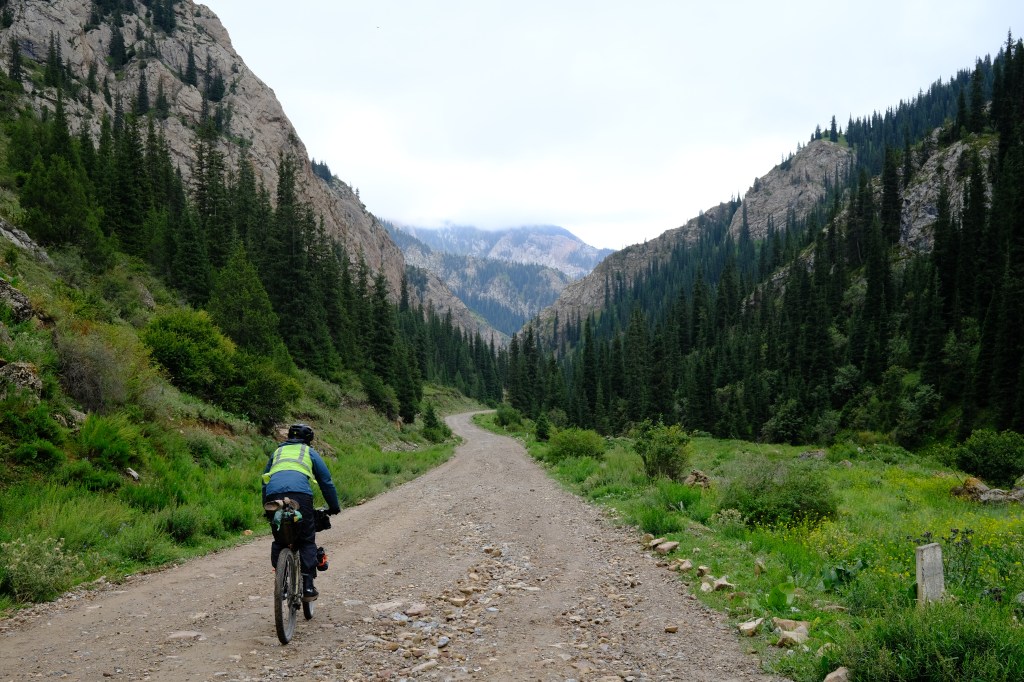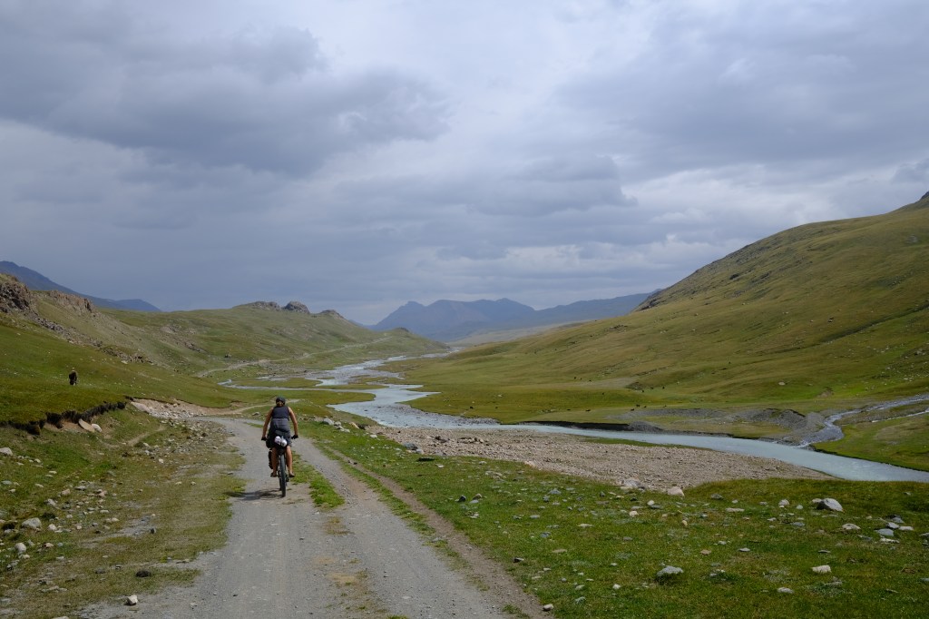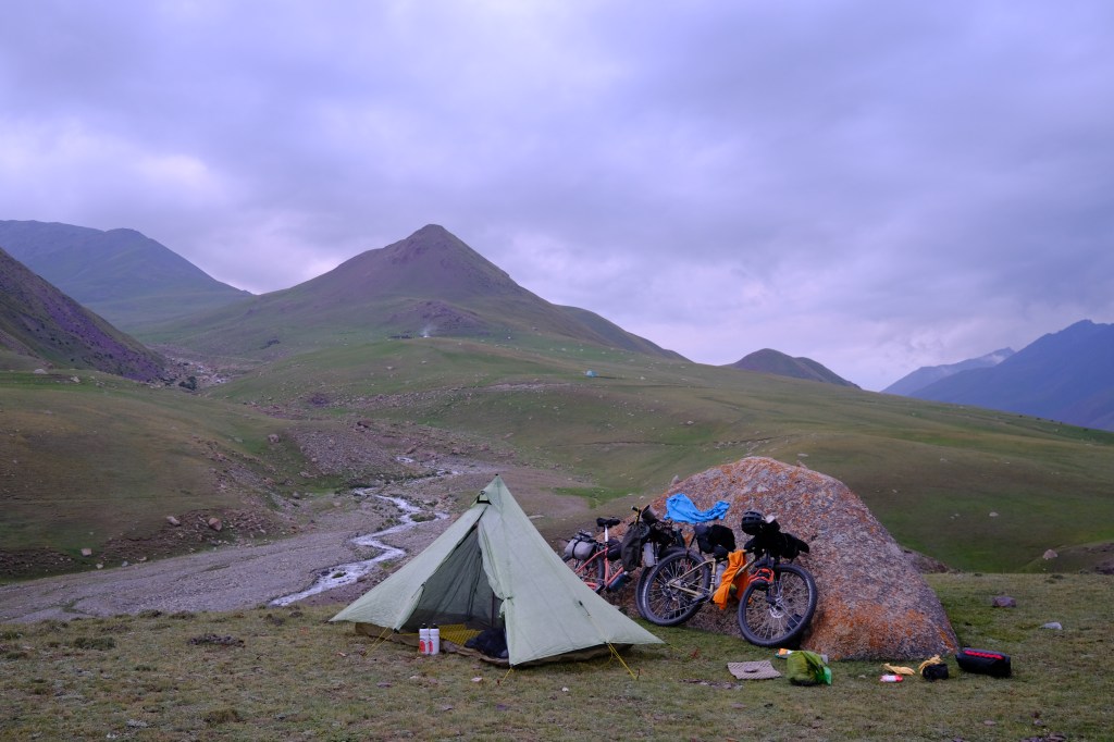 Nach einem Müslifrühstück besorgen wir uns noch Verpflegung für zwei Tage in den Bergen in einem kleinen Shop am Straßenrand – und los geht’s. Ein wenig später, immer noch an der Hauptstraße, entdecken wir einen Stand, an dem frisches Fladenbrot verkauft wird. Es wird direkt vor Ort und unter freiem Himmel gebacken – der Duft ist köstlich. Wir nehmen zwei. Dann beginnt der Anstieg. Heute erwarten uns 2200 Höhenmeter am Stück bergauf. Die Straße ist anfangs noch recht gut, wird jedoch umso kaputter, je weiter wir nach oben fahren. Schon bald müssen wir unsere Räder über die ersten verschütteten Abschnitte tragen. Lustig – auf Google Maps ist hier mal wieder eine normale Passstraße eingezeichnet. Mit einem Fahrzeug auf vier Rädern wäre an ein Weiterkommen jedoch nicht zu denken. Wiebke hat heute mehrere kleine Wutanfälle – langsam lässt die Kraft nach, sich jeden Tag aufs Neue einen riesigen Pass hinaufzuquälen. Mir hingegen macht es großen Spaß, und ich fühle mich genau am richtigen Ort. Ich versuche, Wiebke so viel positive Energie wie möglich zu senden. Die Abschnitte, in denen wir die Räder über große Steine wuchten müssen, sind die kräftezehrendsten. Je höher wir kommen, desto ungemütlicher wird das Wetter: Wolken ziehen auf, es wird kalt und windig, und immer wieder setzt Regen ein. Doch wir lassen uns davon nicht die Stimmung verderben – die Aussicht ist einmalig. Wieder schafft es Kirgistan, uns aufs Neue zu beeindrucken: mit wilden Gletschern, beeindruckenden Felsformationen und endlosen Geröllfeldern. Irgendwann erreichen wir den Kok-Ayrik Pass. Ein großes Tor markiert die Passhöhe. Hinter uns liegt der Yssykköl, vor uns erstreckt sich der Chon-Kemin-Nationalpark. Nun tröpfelt es sanft vor sich hin. Schnell ziehen wir unsere Regenhosen an, freuen uns kurz über den erreichten Gipfel und starten dann die Abfahrt. Doch lange fahren ist nicht möglich – auch hier müssen wir immer wieder schieben. Die Aussicht ist natürlich weiterhin, wenn nicht sogar noch mehr, fantastisch, aber die Abfahrt zieht sich. Aus der geplanten einen Stunde werden zweieinhalb. Immer wieder steigen wir vom Rad, schieben es oder heben es über Geröllhaufen. Als wir endlich im Tal ankommen, hat sich das Wetter weiter verschlechtert. Es regnet mittlerweile durchgehend, der Himmel ist wolkenverhangen, und es ist kalt. Wieder müssen wir einen Fluss durchqueren. Auf den ersten Blick wirkt er gar nicht so wild, doch beinahe kostet er mich mein Rad. Ich wate ohne Rad zurück und helfe Wiebke. Gemeinsam halten wir ihr Rad fest und verhindern, dass es von der Strömung mitgerissen wird. Damit hatte ich an dieser Stelle wirklich nicht gerechnet. Trotzdem beschließen wir, noch ein paar Kilometer weiterzufahren. Wir sind ohnehin nass, und jeder Kilometer, den wir heute zurücklegen, erspart uns morgen zusätzliche Anstrengung – schließlich sind es noch mindestens 60 Kilometer bis zum nächsten Dorf. Im Regen fahren wir das Tal hinaus in Richtung Westen. Es geht leicht bergab, doch heute bläst uns ein starker Gegenwind entgegen. Nach einem kurzen Zwischenanstieg und kurz bevor es dunkel wird, finden wir einen schönen Schlafplatz auf einer Lichtung mit Blick auf einen beeindruckenden Berg. Am Abend lockert die Bewölkung etwas auf und erlaubt uns wunderbare Ausblicke in alle Richtungen. Während unserer Abendroutine – Zelt aufbauen, Katzenwäsche, Schlafsack und Isomatten vorbereiten, Essen kochen – taucht plötzlich ein junges Mädchen auf einem Pferd auf. Sie beobachtet uns aus sicherer Entfernung, pflückt Kräuter und scheint sich sehr für uns zu interessieren. Erst kurz bevor es dunkel wird, schwingt sie sich auf ihr Pferd und reitet davon – eine Begegnung, die wir beide nicht vergessen werden. Wie so oft gibt es von den schönsten und intensivsten Momenten keine Fotos. Ich habe eine große Hemmung, solche Situationen durch das Zücken der Kamera zu unterbrechen. Vielmehr genieße ich sie und versuche, die Bilder in meinem Kopf abzuspeichern. In der Nacht gewittert es immer wieder in den Bergen um uns herum. Wir liegen lange wach und versuchen herauszufinden, ob die Gewitter näherkommen oder sich entfernen. Beim Radreisen habe ich schon einige unheimliche Momente während Gewittern erlebt, und ich muss zugeben, dass wir beide großen Respekt vor Blitzeinschlägen haben. Doch wir haben Glück – die Gewitter bleiben weit genug entfernt. Der Regen begleitet uns dennoch die ganze Nacht.