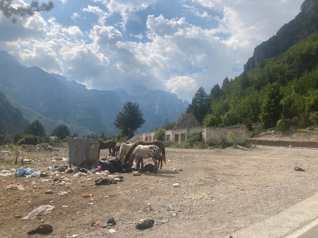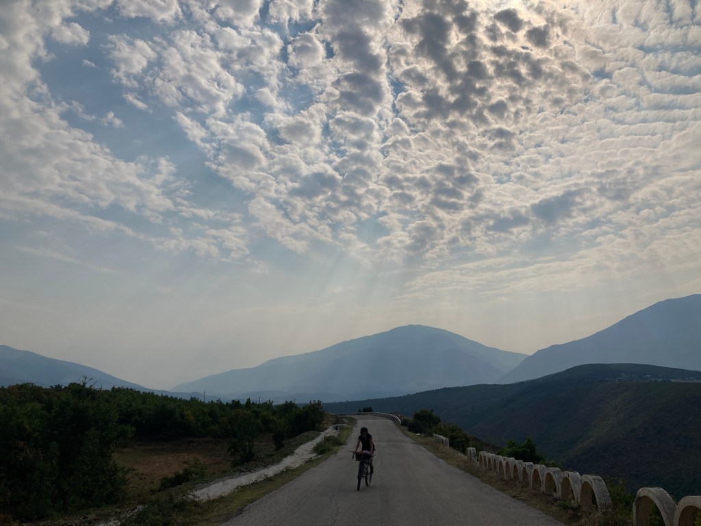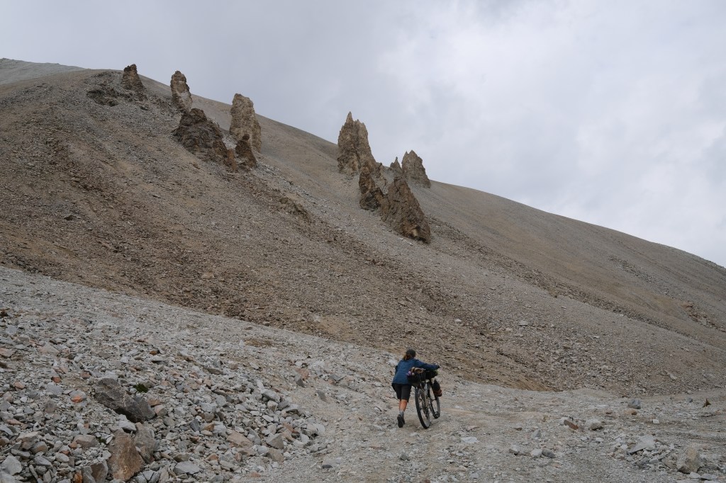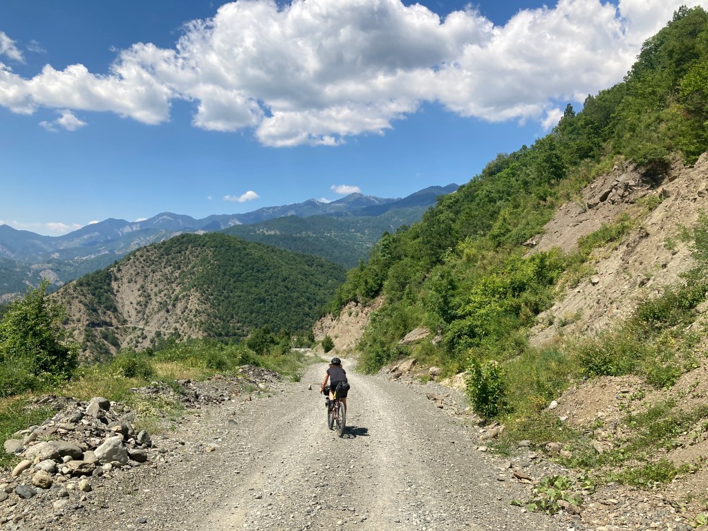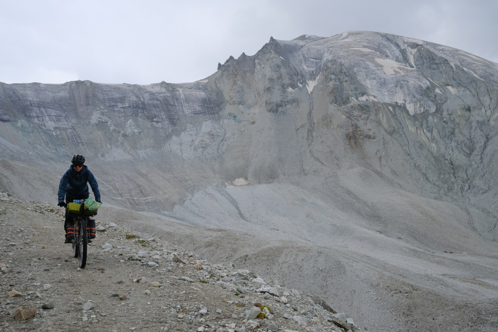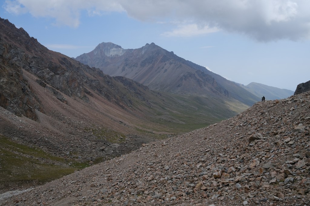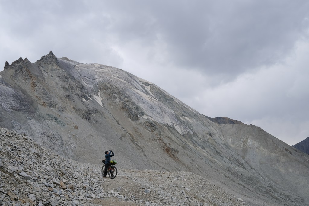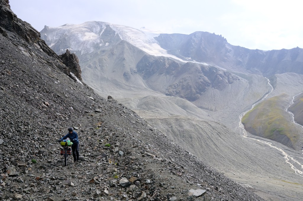 Nach einem Müslifrühstück besorgen wir uns noch Verpflegung für zwei Tage in den Bergen in einem kleinen Shop am Straßenrand – und los geht’s. Ein wenig später, immer noch an der Hauptstraße, entdecken wir einen Stand, an dem frisches Fladenbrot verkauft wird. Es wird direkt vor Ort und unter freiem Himmel gebacken – der Duft ist köstlich. Wir nehmen zwei. Dann beginnt der Anstieg. Heute erwarten uns 2200 Höhenmeter am Stück bergauf. Die Straße ist anfangs noch recht gut, wird jedoch umso kaputter, je weiter wir nach oben fahren. Schon bald müssen wir unsere Räder über die ersten verschütteten Abschnitte tragen. Lustig – auf Google Maps ist hier mal wieder eine normale Passstraße eingezeichnet. Mit einem Fahrzeug auf vier Rädern wäre an ein Weiterkommen jedoch nicht zu denken. Wiebke hat heute mehrere kleine Wutanfälle – langsam lässt die Kraft nach, sich jeden Tag aufs Neue einen riesigen Pass hinaufzuquälen. Mir hingegen macht es großen Spaß, und ich fühle mich genau am richtigen Ort. Ich versuche, Wiebke so viel positive Energie wie möglich zu senden. Die Abschnitte, in denen wir die Räder über große Steine wuchten müssen, sind die kräftezehrendsten. Je höher wir kommen, desto ungemütlicher wird das Wetter: Wolken ziehen auf, es wird kalt und windig, und immer wieder setzt Regen ein. Doch wir lassen uns davon nicht die Stimmung verderben – die Aussicht ist einmalig. Wieder schafft es Kirgistan, uns aufs Neue zu beeindrucken: mit wilden Gletschern, beeindruckenden Felsformationen und endlosen Geröllfeldern. Irgendwann erreichen wir den Kok-Ayrik Pass. Ein großes Tor markiert die Passhöhe. Hinter uns liegt der Yssykköl, vor uns erstreckt sich der Chon-Kemin-Nationalpark. Nun tröpfelt es sanft vor sich hin. Schnell ziehen wir unsere Regenhosen an, freuen uns kurz über den erreichten Gipfel und starten dann die Abfahrt. Doch lange fahren ist nicht möglich – auch hier müssen wir immer wieder schieben. Die Aussicht ist natürlich weiterhin, wenn nicht sogar noch mehr, fantastisch, aber die Abfahrt zieht sich. Aus der geplanten einen Stunde werden zweieinhalb. Immer wieder steigen wir vom Rad, schieben es oder heben es über Geröllhaufen. Als wir endlich im Tal ankommen, hat sich das Wetter weiter verschlechtert. Es regnet mittlerweile durchgehend, der Himmel ist wolkenverhangen, und es ist kalt. Wieder müssen wir einen Fluss durchqueren. Auf den ersten Blick wirkt er gar nicht so wild, doch beinahe kostet er mich mein Rad. Ich wate ohne Rad zurück und helfe Wiebke. Gemeinsam halten wir ihr Rad fest und verhindern, dass es von der Strömung mitgerissen wird. Damit hatte ich an dieser Stelle wirklich nicht gerechnet. Trotzdem beschließen wir, noch ein paar Kilometer weiterzufahren. Wir sind ohnehin nass, und jeder Kilometer, den wir heute zurücklegen, erspart uns morgen zusätzliche Anstrengung – schließlich sind es noch mindestens 60 Kilometer bis zum nächsten Dorf. Im Regen fahren wir das Tal hinaus in Richtung Westen. Es geht leicht bergab, doch heute bläst uns ein starker Gegenwind entgegen. Nach einem kurzen Zwischenanstieg und kurz bevor es dunkel wird, finden wir einen schönen Schlafplatz auf einer Lichtung mit Blick auf einen beeindruckenden Berg. Am Abend lockert die Bewölkung etwas auf und erlaubt uns wunderbare Ausblicke in alle Richtungen. Während unserer Abendroutine – Zelt aufbauen, Katzenwäsche, Schlafsack und Isomatten vorbereiten, Essen kochen – taucht plötzlich ein junges Mädchen auf einem Pferd auf. Sie beobachtet uns aus sicherer Entfernung, pflückt Kräuter und scheint sich sehr für uns zu interessieren. Erst kurz bevor es dunkel wird, schwingt sie sich auf ihr Pferd und reitet davon – eine Begegnung, die wir beide nicht vergessen werden. Wie so oft gibt es von den schönsten und intensivsten Momenten keine Fotos. Ich habe eine große Hemmung, solche Situationen durch das Zücken der Kamera zu unterbrechen. Vielmehr genieße ich sie und versuche, die Bilder in meinem Kopf abzuspeichern. In der Nacht gewittert es immer wieder in den Bergen um uns herum. Wir liegen lange wach und versuchen herauszufinden, ob die Gewitter näherkommen oder sich entfernen. Beim Radreisen habe ich schon einige unheimliche Momente während Gewittern erlebt, und ich muss zugeben, dass wir beide großen Respekt vor Blitzeinschlägen haben. Doch wir haben Glück – die Gewitter bleiben weit genug entfernt. Der Regen begleitet uns dennoch die ganze Nacht.