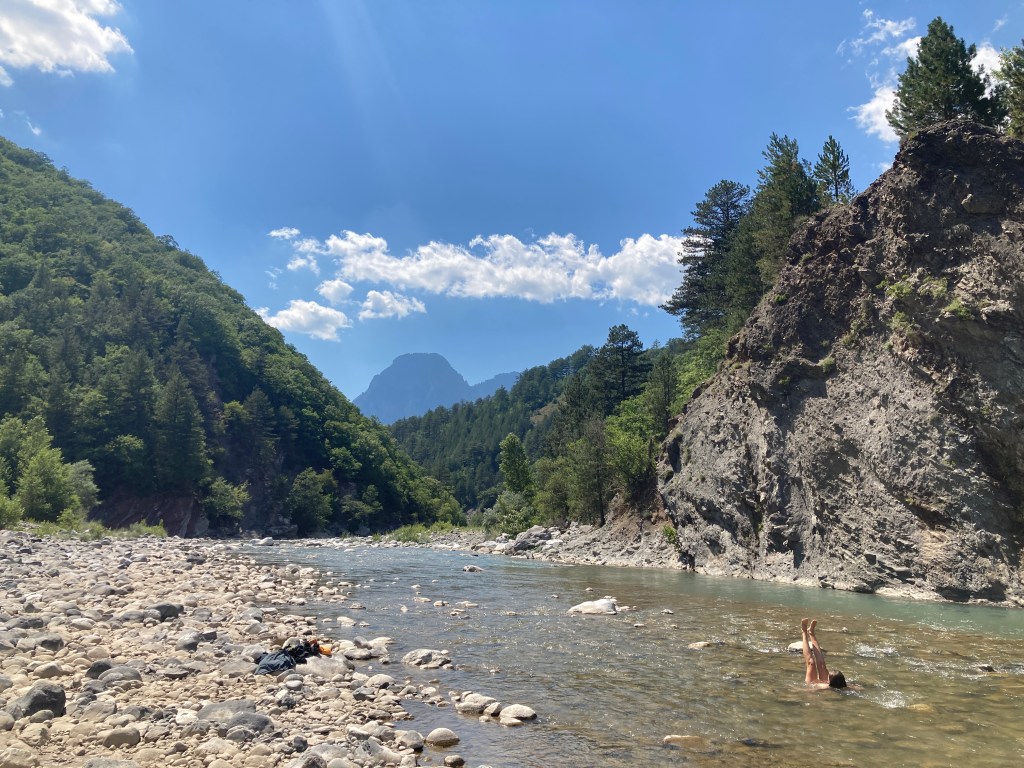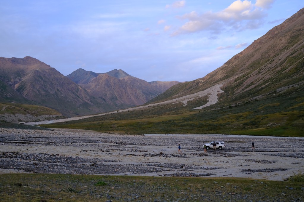 Es nähert sich ein Geländewagen von der anderen Seite des zerstörten Straßenabschnitts. Wir können es kaum fassen, er schafft seinen Weg durch wildes Wasser und Steine. Es sind Kanadier in einem geliehenen Landcruiser und sie wissen definitiv, was sie tun. Sehr kalkuliert und mit der richtigen Technik schaffen sie es ans andere „Ufer“. Für uns eine spannende Show. Die Kanadier bestätigen uns auch, dass diese Stelle die wildeste ist und wir nach der Überquerung kein Problem haben sollten, über den Tossor Pass zum Yssyköl zu radeln. Später kommt noch ein Südtiroler Pärchen, die beiden haben auch einen Landcruiser, einen Offroad-getunten, allerdings mit besseren Reifen, Höherlegung und extra Lichtern. Auch sie beobachten wir und freuen uns mit ihnen, als sie das Hindernis sicher überwunden haben. Claus ist mit seinem Auto schon seit vielen Monaten unterwegs im Nahen und Fernen Osten. Seine Partnerin begleitet ihn ein paar Wochen zwischendurch. Ich verfolge ihn bis heute auf Instagram und freue mich immer wieder über tolle Bilder und Videos von seiner Reise. Sehr gute Begegnungen auch für uns – nun wissen wir, dass die Straße über den Pass für uns gut passierbar ist.
