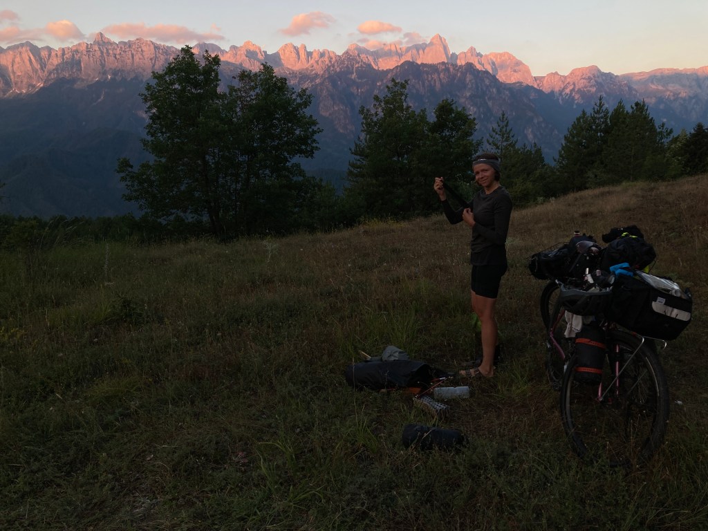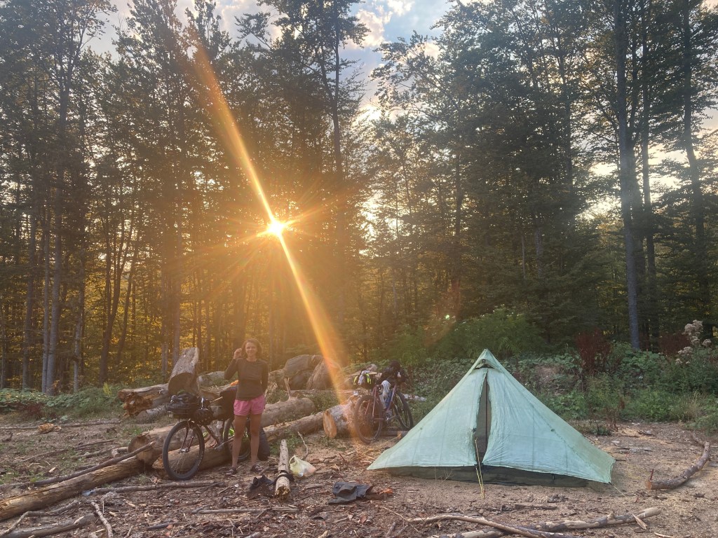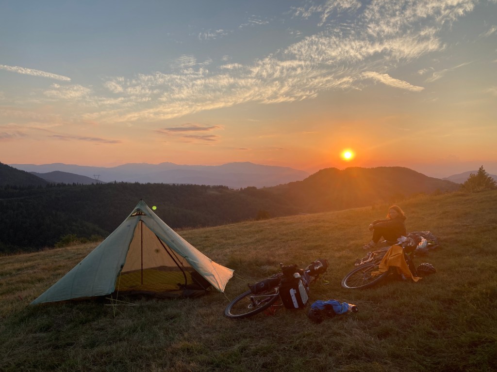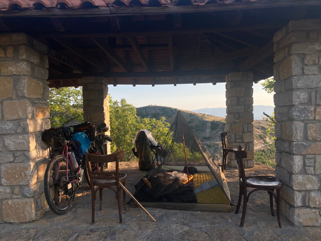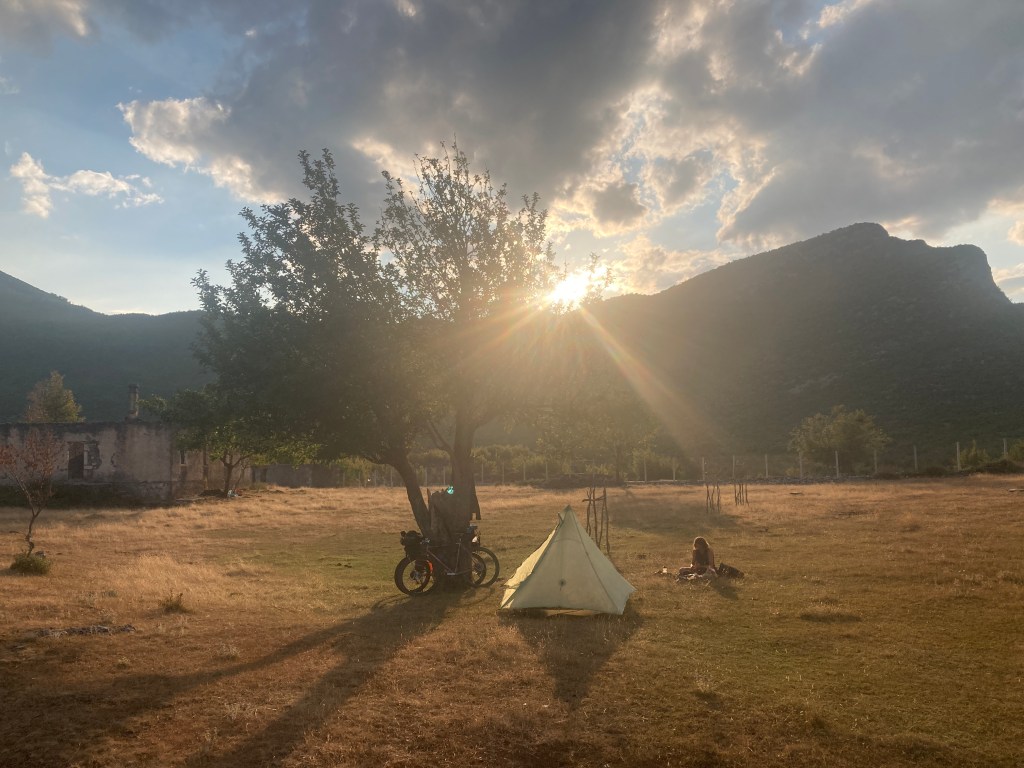 Nach dem wir unser Essen aufgegessen haben fahren wir etwas vom Dorf weg und bauen mit idyllischen Ausblick unser Zelt auf.