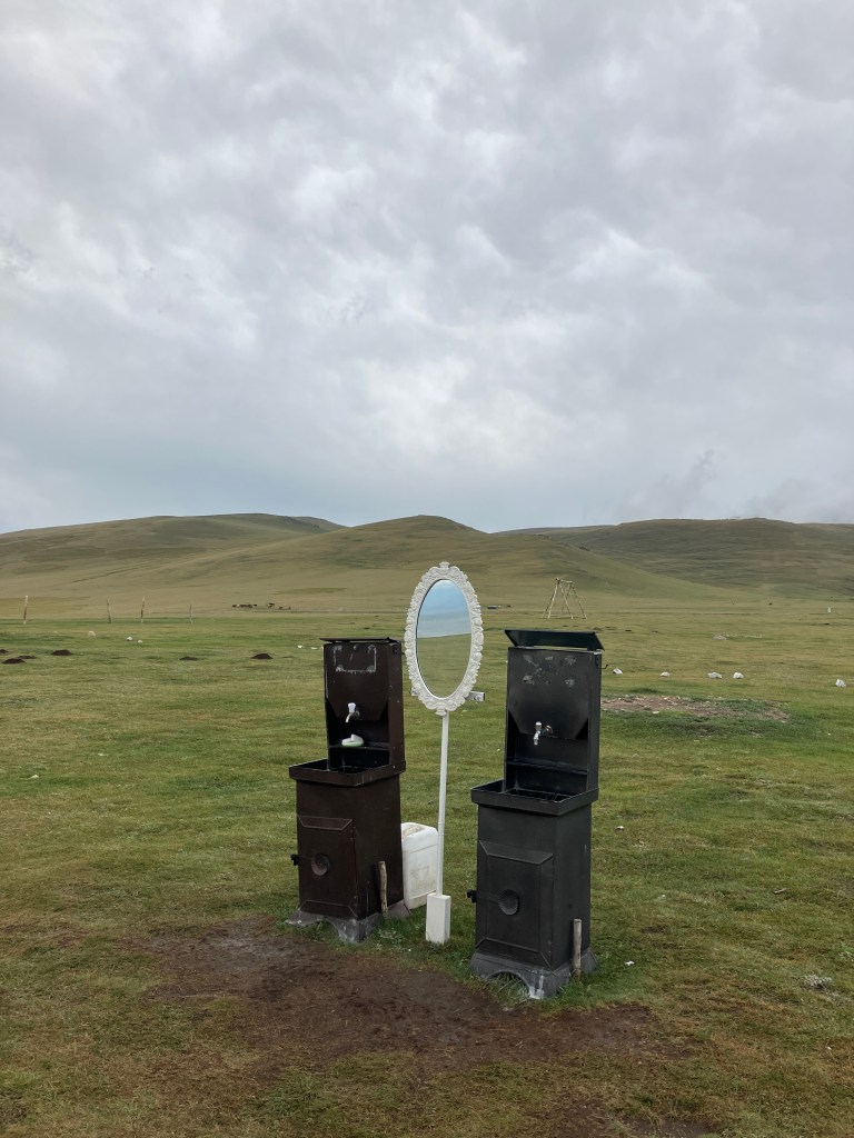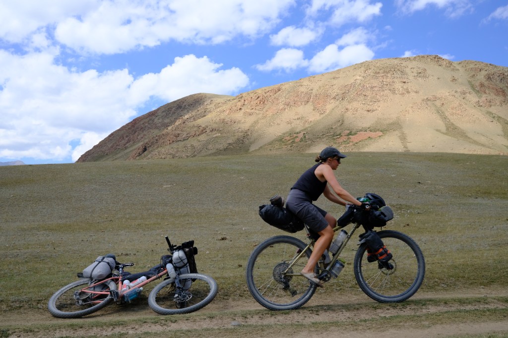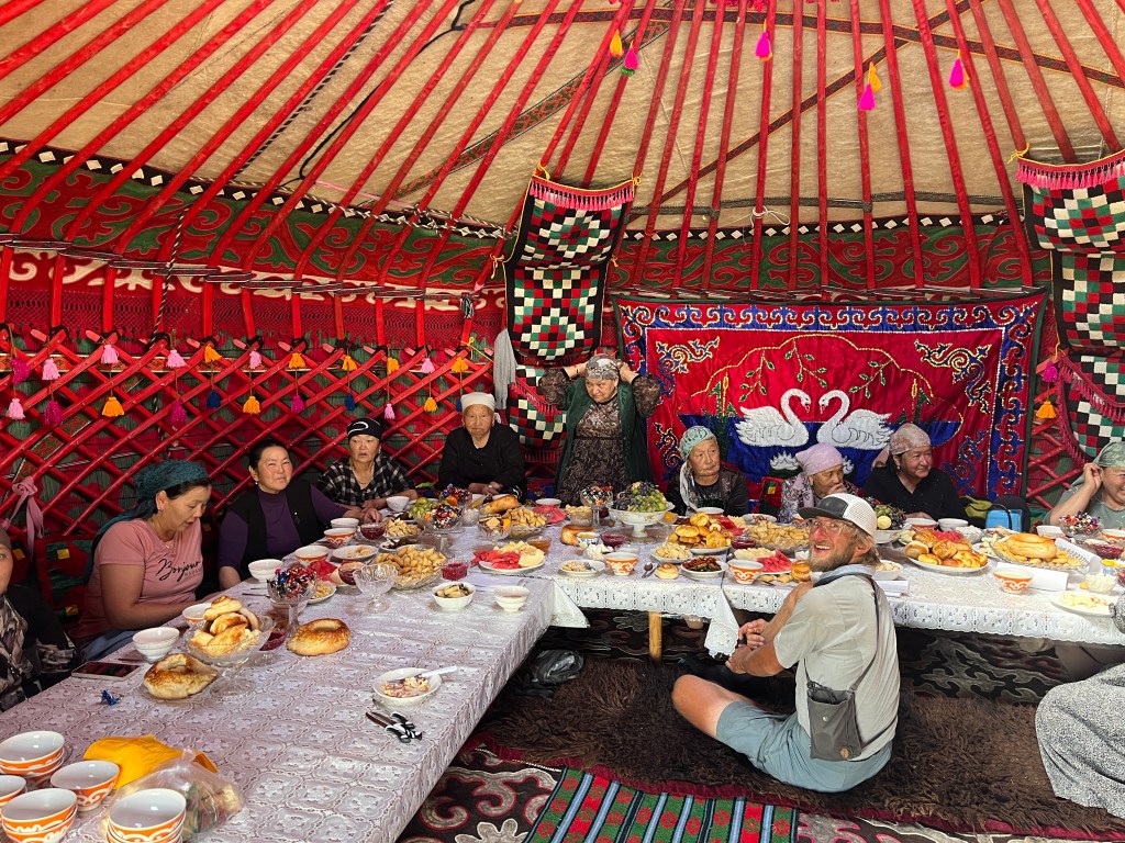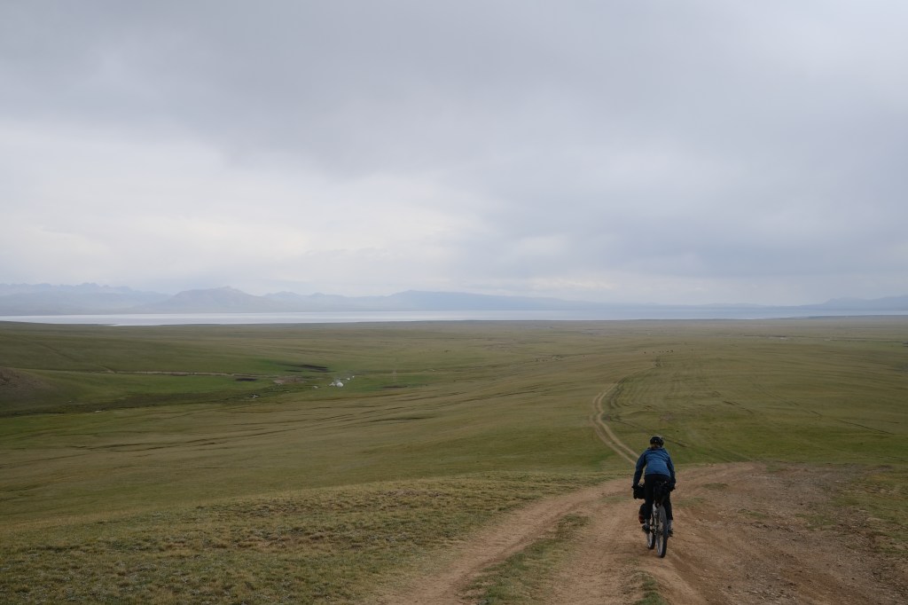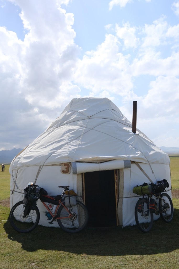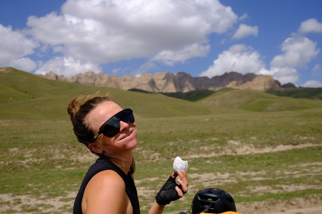 Wir verabschieden Marin, und er fährt weiter in seine eigentliche Richtung nach Bischkek. Wir folgen dem immer steiler werdenden Canyon, bis wir auf 3200 m über einen Pass fahren – beziehungsweise schieben, die letzten Meter sind extrem steil und das Wetter wird zunehmend schlechter. Auf der Passhöhe treffen wir einen Kirgisen auf einem Motorrad, mit dem wir uns kurz mit wenigen englischen Wörtern unterhalten. Wir sprechen auch über das Alter unserer Frauen, und er findet es äußerst amüsant, dass Wiebke ein paar Jahre älter ist als ich. Er erzählt, dass seine Frau zehn Jahre jünger sei als er – so gehöre sich das. Haha, andere Länder, andere Sitten. Wiebke genießt derweil ihr neues Leibgericht: getrockneten und geräucherten Käse, der extrem salzig ist. Ich mag ihn nicht so sehr. Die Abfahrt beginnt sanft rollend über Grashügel hinab in Richtung Songköl, vorbei an riesigen gemischten Herden aus Schafen, Pferden und Kühen. Als wir über die Ebene am See entlangfahren, kommen johlend drei junge Kirgisen auf uns zugeritten – und werfen uns ein kopfloses Schaf vor die Füße! Wir wissen nicht recht, ob es sich um ein traditionelles Ritual handelt oder was diese Geste zu bedeuten hat. Später lese ich, dass es eine Disziplin der Kyrgyz Games ist und die Jungs vermutlich geübt haben – oder uns einfach einen Schrecken einjagen wollten. Hat nicht funktioniert, zumindest nicht mit dem Schreck, aber spannend war es trotzdem. Wir fahren mehrere Kilometer am See entlang und erleben die nächste Überraschung: Wir treffen Sam und Bella. Auch Sam kenne ich vom Transcontinental Race vor vielen Jahren. Zunächst erkennen wir uns nicht, doch schnell kommen wir auf unsere gemeinsame Vergangenheit zu sprechen. Nach der Begegnung mit Marin am Vortag ist dieses Wiedersehen erst recht kaum zu glauben. Wir tauschen uns aus und teilen unsere aktuellen Kontaktdaten. Leider fahren sie in die entgegengesetzte Richtung, und so trennen sich unsere Wege wieder – bis wir uns Monate später in Innsbruck erneut treffen. Wir halten an einem der vielen Jurtcamps und buchen eine Jurte für die Nacht, direkt am Fuße des „Peak Connewitz“. Angeblich wurde der Berg von Freunden aus Dresden-Connewitz so benannt, und der Name hat sich auf allen OpenStreetMaps gehalten. Es gibt außerdem leckeres Essen, eine Dusche (= ein Eimer mit kaltem Wasser und einer Schöpfkelle) und ein Plumsklo. Die Erfahrung ist spannend, aber wir entscheiden danach, dass wir das Wildcampen bevorzugen.