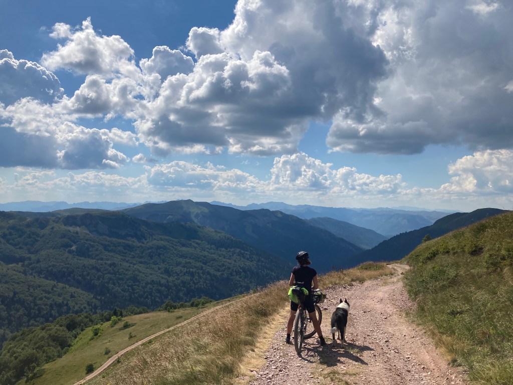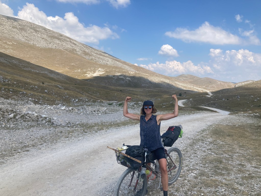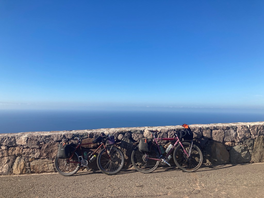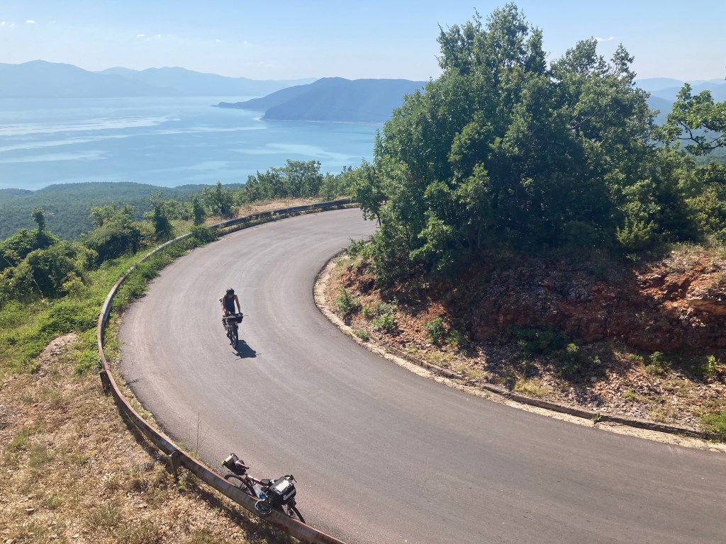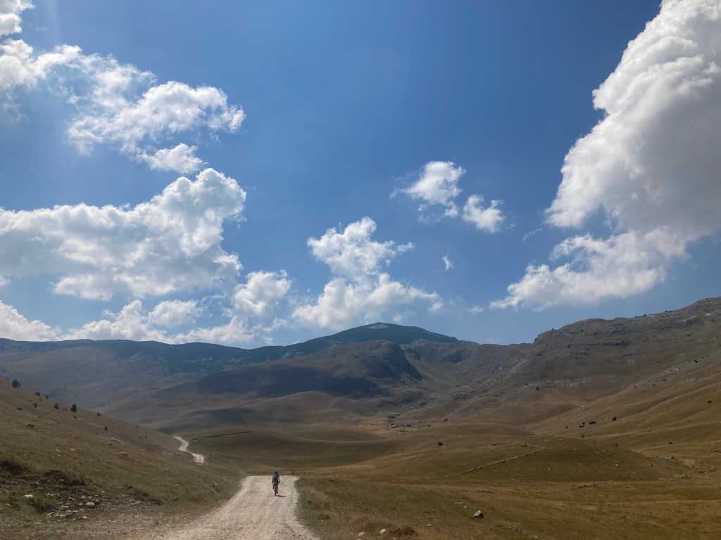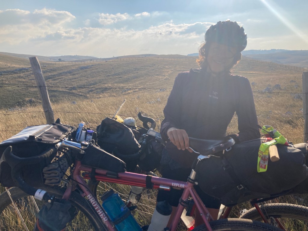 Wir verabschieden Marin, und er fährt weiter in seine eigentliche Richtung nach Bischkek. Wir folgen dem immer steiler werdenden Canyon, bis wir auf 3200 m über einen Pass fahren – beziehungsweise schieben, die letzten Meter sind extrem steil und das Wetter wird zunehmend schlechter. Auf der Passhöhe treffen wir einen Kirgisen auf einem Motorrad, mit dem wir uns kurz mit wenigen englischen Wörtern unterhalten. Wir sprechen auch über das Alter unserer Frauen, und er findet es äußerst amüsant, dass Wiebke ein paar Jahre älter ist als ich. Er erzählt, dass seine Frau zehn Jahre jünger sei als er – so gehöre sich das. Haha, andere Länder, andere Sitten. Wiebke genießt derweil ihr neues Leibgericht: getrockneten und geräucherten Käse, der extrem salzig ist. Ich mag ihn nicht so sehr. Die Abfahrt beginnt sanft rollend über Grashügel hinab in Richtung Songköl, vorbei an riesigen gemischten Herden aus Schafen, Pferden und Kühen. Als wir über die Ebene am See entlangfahren, kommen johlend drei junge Kirgisen auf uns zugeritten – und werfen uns ein kopfloses Schaf vor die Füße! Wir wissen nicht recht, ob es sich um ein traditionelles Ritual handelt oder was diese Geste zu bedeuten hat. Später lese ich, dass es eine Disziplin der Kyrgyz Games ist und die Jungs vermutlich geübt haben – oder uns einfach einen Schrecken einjagen wollten. Hat nicht funktioniert, zumindest nicht mit dem Schreck, aber spannend war es trotzdem. Wir fahren mehrere Kilometer am See entlang und erleben die nächste Überraschung: Wir treffen Sam und Bella. Auch Sam kenne ich vom Transcontinental Race vor vielen Jahren. Zunächst erkennen wir uns nicht, doch schnell kommen wir auf unsere gemeinsame Vergangenheit zu sprechen. Nach der Begegnung mit Marin am Vortag ist dieses Wiedersehen erst recht kaum zu glauben. Wir tauschen uns aus und teilen unsere aktuellen Kontaktdaten. Leider fahren sie in die entgegengesetzte Richtung, und so trennen sich unsere Wege wieder – bis wir uns Monate später in Innsbruck erneut treffen. Wir halten an einem der vielen Jurtcamps und buchen eine Jurte für die Nacht, direkt am Fuße des „Peak Connewitz“. Angeblich wurde der Berg von Freunden aus Dresden-Connewitz so benannt, und der Name hat sich auf allen OpenStreetMaps gehalten. Es gibt außerdem leckeres Essen, eine Dusche (= ein Eimer mit kaltem Wasser und einer Schöpfkelle) und ein Plumsklo. Die Erfahrung ist spannend, aber wir entscheiden danach, dass wir das Wildcampen bevorzugen.