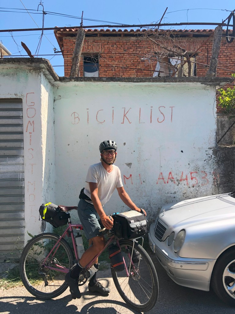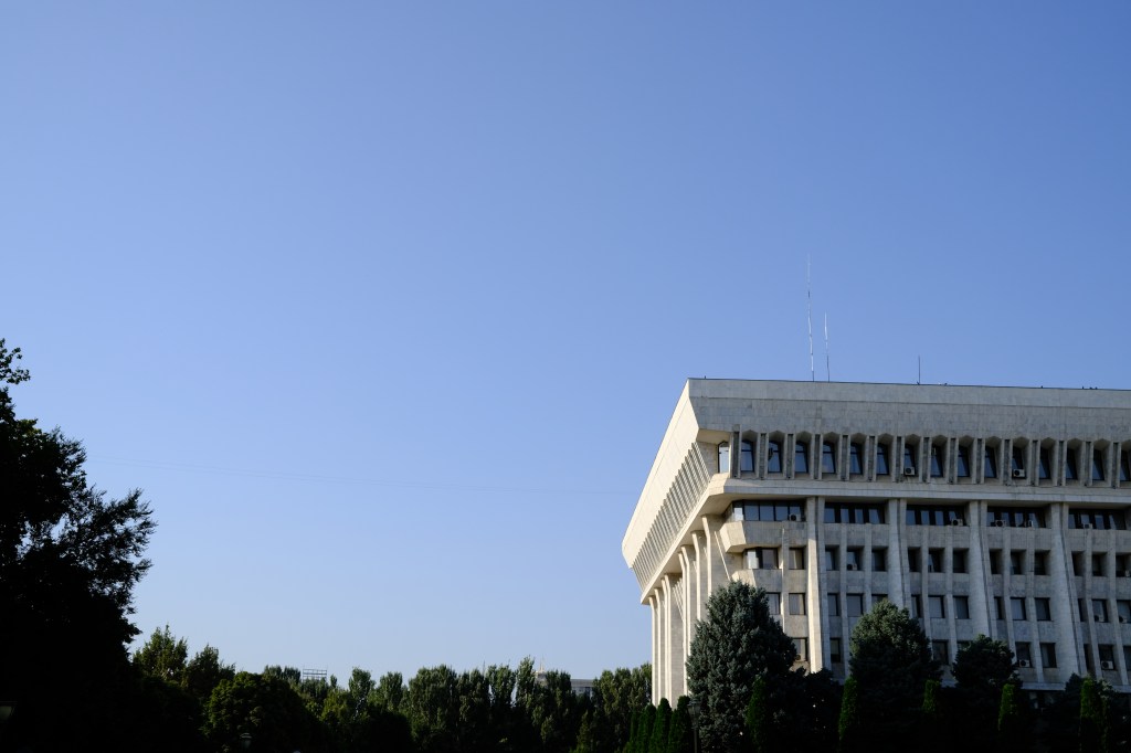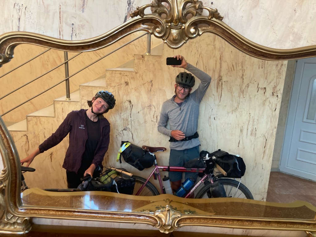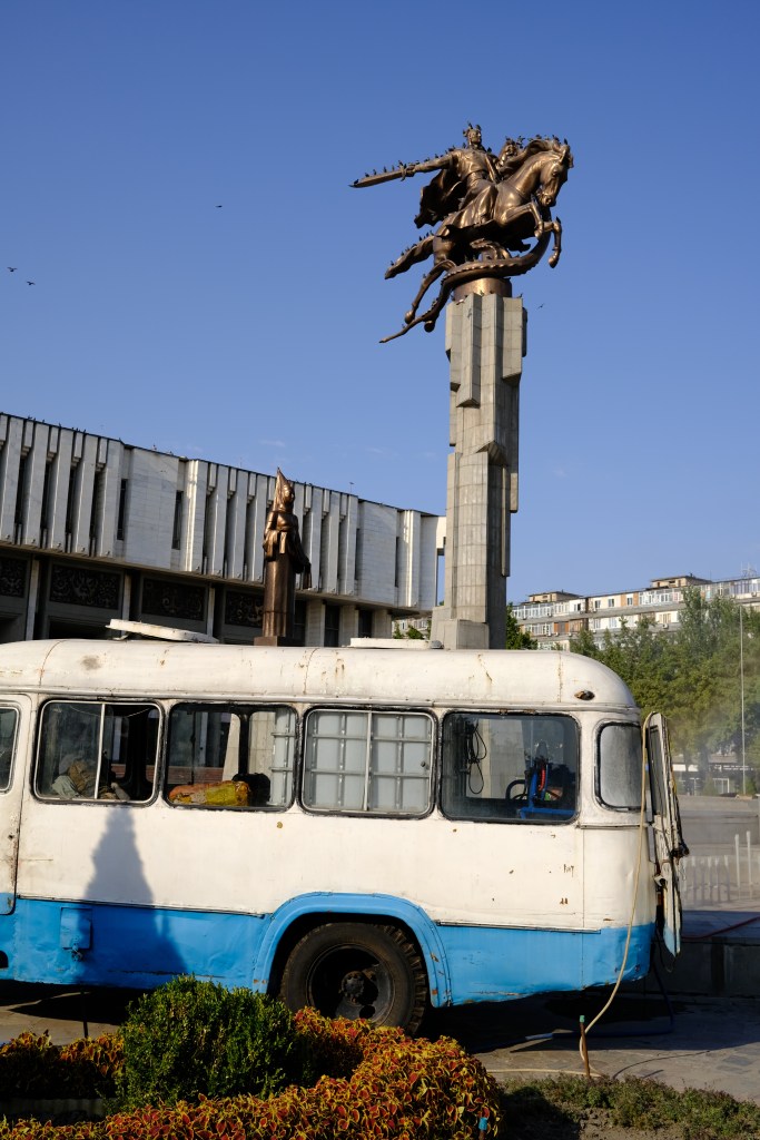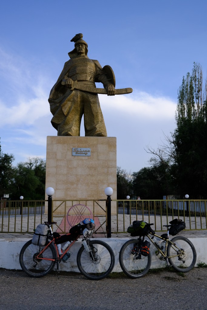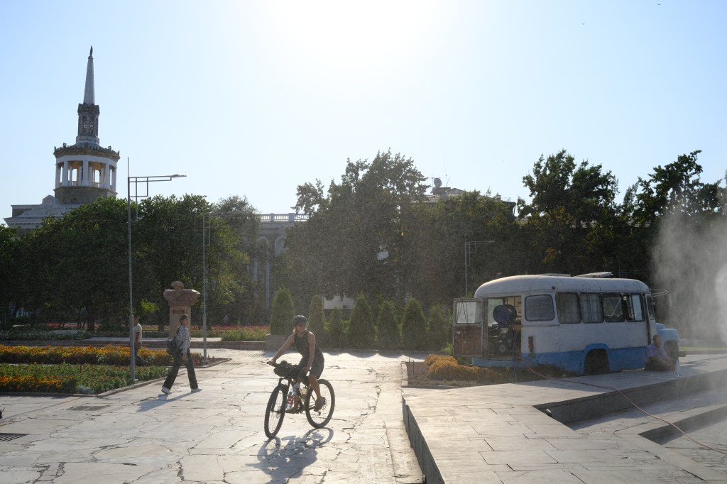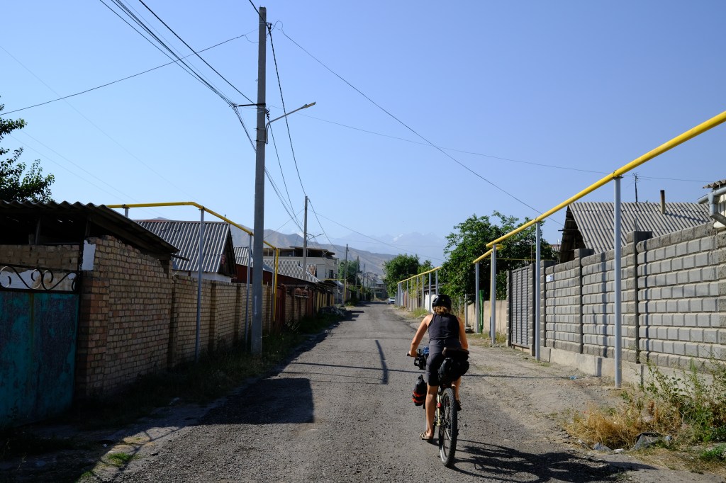 Ankunft in Bischkek auf einem kleinen Flughafen. Wir sind in einem muslimischen Land gelandet, und es sind fast nur Männer zu sehen. Wir bekommen viele Taxiangebote, ich verhandle mit einem Fahrer dessen Bruder uns schlussendlich ins eine Stunde entfernte Stadtzentrum von Bischkek bringt. Unterwegs halten wir an, um Geld zu wechseln, damit wir das Taxi bezahlen können. Um 6 Uhr morgens kommen wir im Hotel an und bauen als Erstes die Räder auf. Danach können wir einchecken und schlafen zunächst bis Mittag, um den Jetlag etwas zu entschärfen. Am Nachmittag fahren wir eine Runde mit den Rädern durch die Stadt auf der Suche nach etwas zu essen. Zu unserer Überraschung gibt es sogar bestens ausgebaute Radwege! Außerdem organisieren wir ein paar Dinge. Wiebke holt Gas für unseren Kocher in einem Outdoorgeschäft, während ich draußen auf die Räder aufpasse. Danach kaufe und registriere ich zwei SIM-Karten für uns (10 € für beide mit unbegrenztem Internet für einen Monat!), und wir schauen uns in der Stadt um. In einem kirgisischen Restaurant gibt es Manti und Laghman. Wir verlieben uns sofort in die beiden Gerichte. Ich bin überwältigt vom sowjetischen Baustil. Alles ist sehr protzig und massiv gebaut, eine Materialschlacht vom Feinsten. Wir treffen viele Teenager auf Fixies, was mich sehr an meine Jugend in Chemnitz erinnert. Am Abend machen wir die Räder für den nächsten Morgen zur Abfahrt fertig und gehen früh ins Bett.