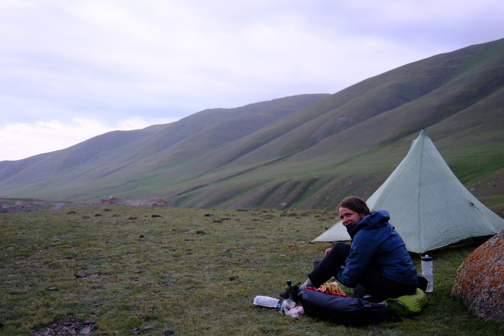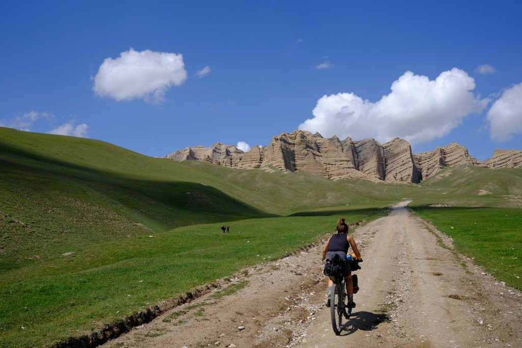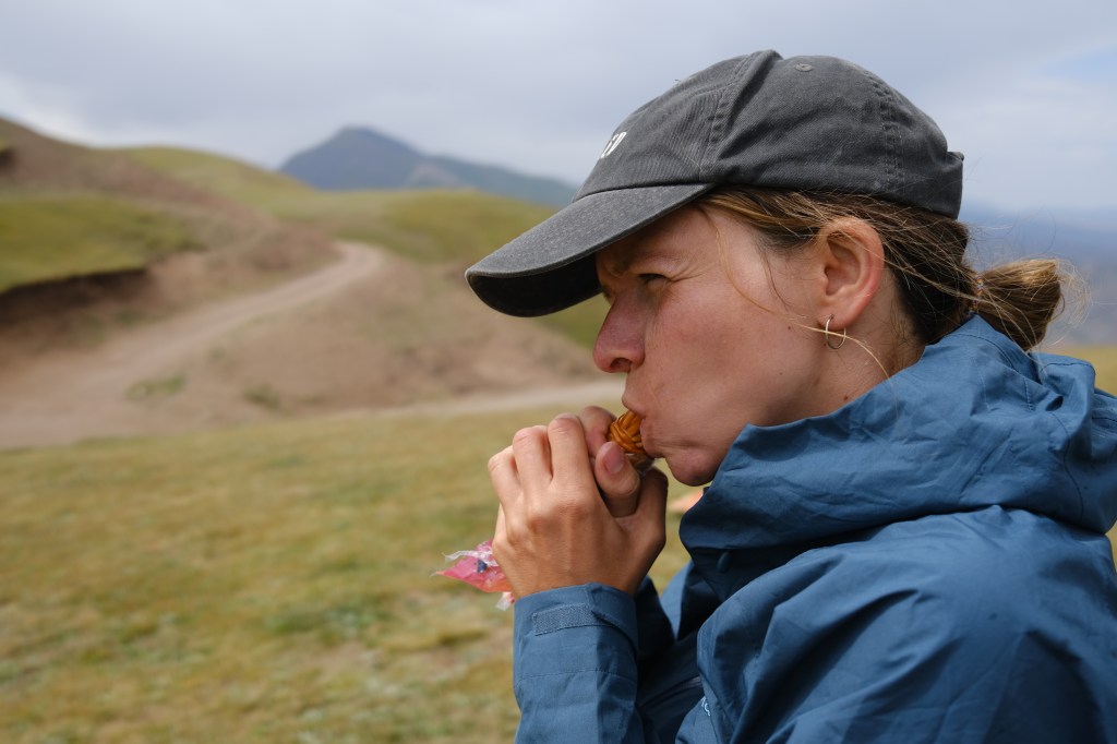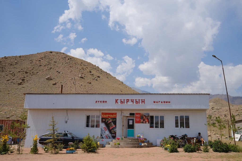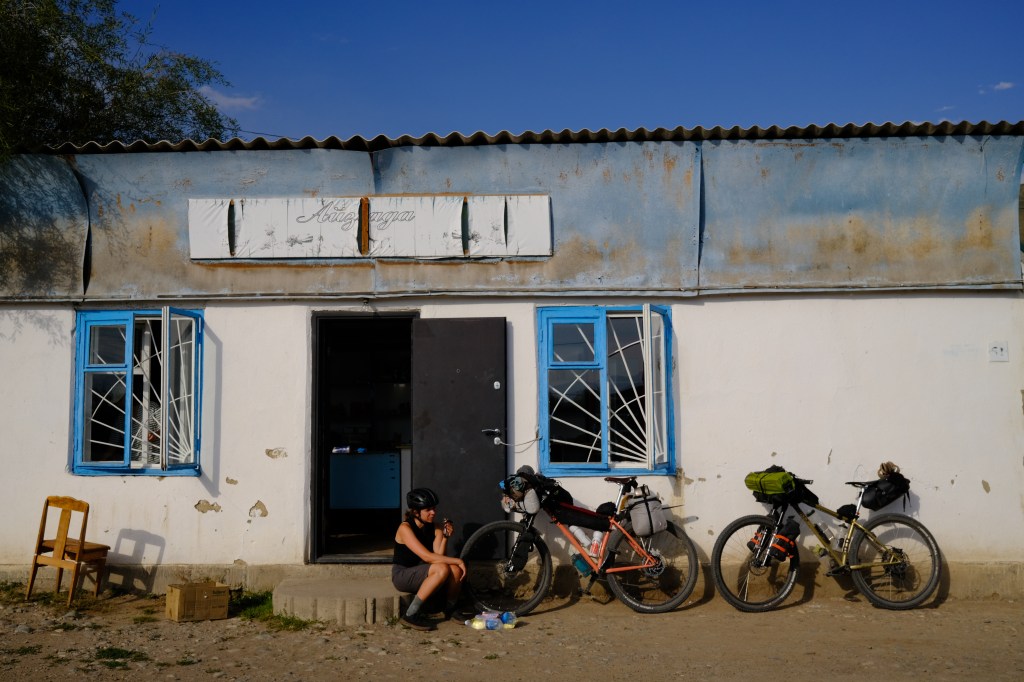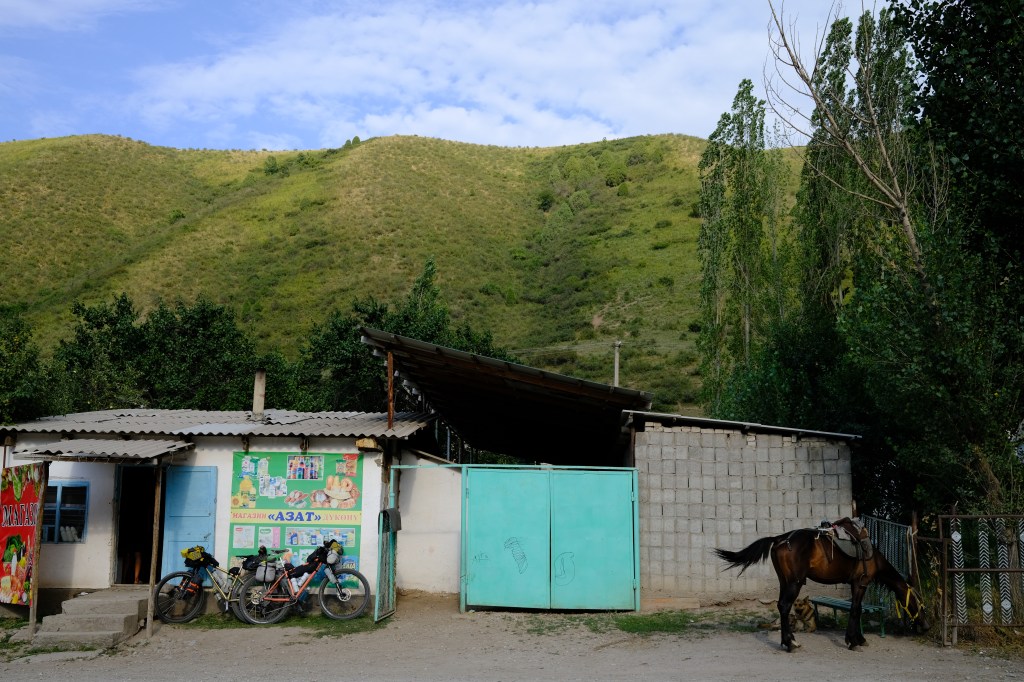 Auf dem Weg aus der Stadt suchen wir uns einen großen Supermarkt und füllen dort all unsere Vorräte auf; Wasser, Snacks, Reis, Trockenfrüchte und Nüsse. Extrem viel Kapazität haben wir ohnehin nicht. Gleichzeitig wissen wir auch noch nicht, wie gut die Geschäfte in den dünner besiedelten Regionen bestückt sind. Schwer beladen verlassen wir die Stadt über einen ersten kleinen Pass. Es ist sehr heiß, schließlich liegt Bischkek auf 800 m. Für die Mittagspause machen wir es uns bequem im Schatten eines Baumes. Im Dorf Kegeti suchen wir später einen kleinen Laden und werden direkt mit der Realität konfrontiert. Ich bin überfordert und finde im ersten Moment gar nichts Brauchbares; es gibt zum Großteil nur Süßigkeiten und abgelagertes Gemüse. Wiebke ist zum Glück kreativer und stellt uns ein paar nette Mahlzeiten zusammen. Wenigstens wissen wir jetzt, dass wir in den vielen kleinen Ortschaften nicht allzu viel erwarten dürfen, was die Lebensmittelvielfalt angeht. Als wir vor dem Laden sitzen und kalte Limonade genießen, wird Wiebke von einem älteren Kirgisen mit einem Blumenstrauß beschenkt. Später treffen wir einen Japaner, der sich gerade auf das anstehende Silk Road Mountain Race vorbereitet. Er hat einen kaputten Reifen und schiebt schon seit mehreren Stunden sein Rad den Kegeti Pass hinunter, den Pass, den wir als Nächstes überqueren möchten. Er freut sich sehr uns zu sehen, und ist trotz der Situation in der er sich befindet total positiv. Von dort hat er es nicht mehr weit in die Zivilisation. Wir fahren weiter das Tal hinauf Richtung Pass, bis die Dämmerung einsetzt, und finden einen schönen Schlafplatz, vom Wind geschützt hinter einem großen Stein.