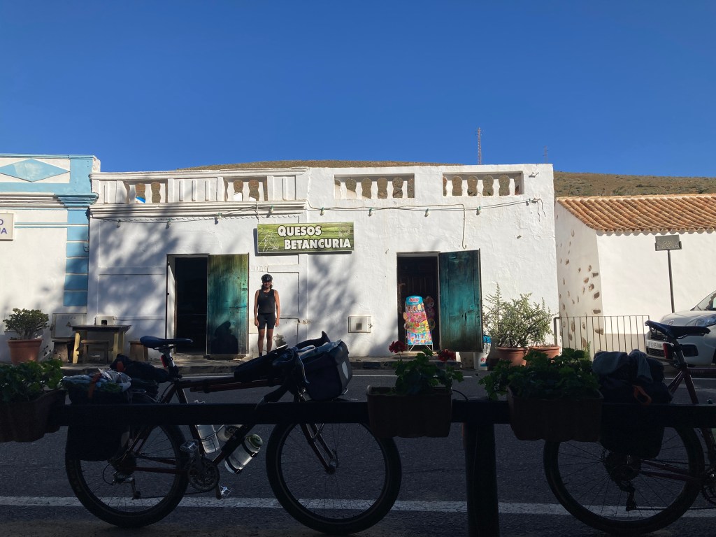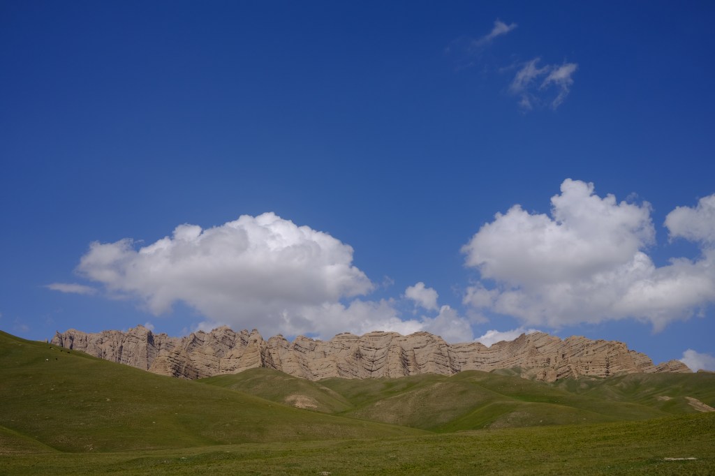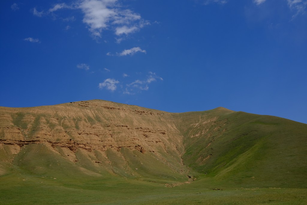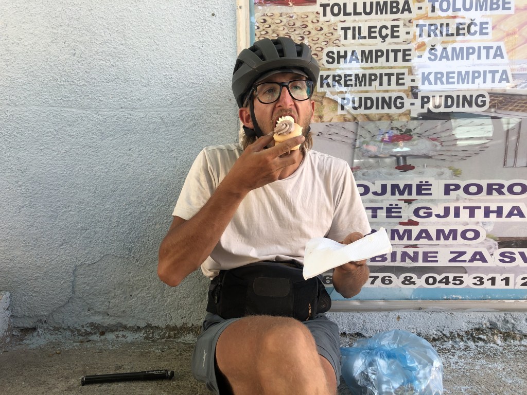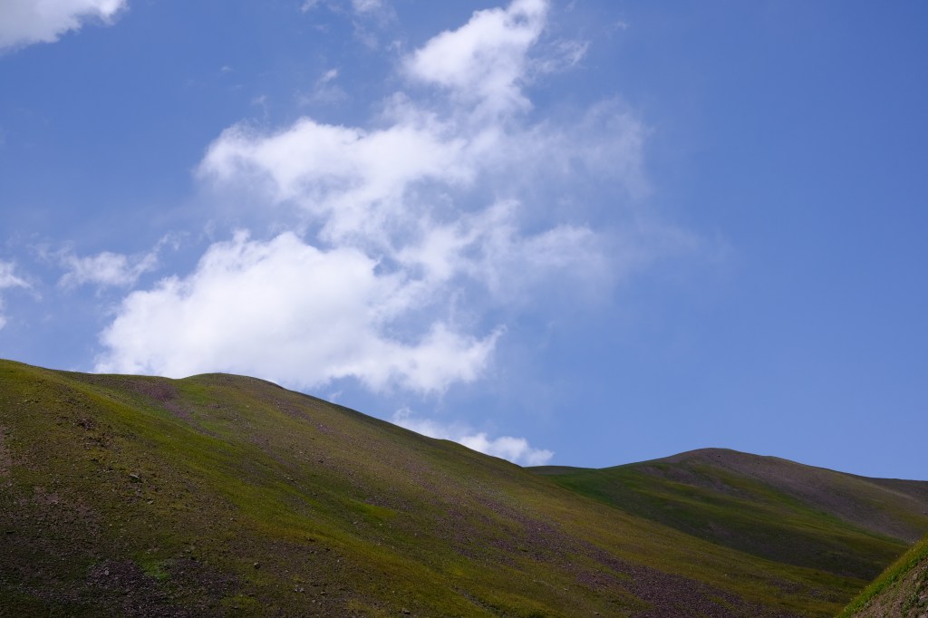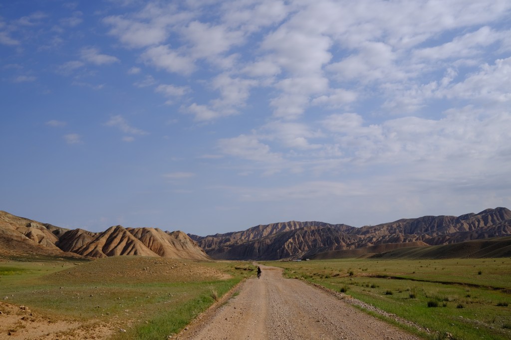 Auf dem Weg aus der Stadt suchen wir uns einen großen Supermarkt und füllen dort all unsere Vorräte auf; Wasser, Snacks, Reis, Trockenfrüchte und Nüsse. Extrem viel Kapazität haben wir ohnehin nicht. Gleichzeitig wissen wir auch noch nicht, wie gut die Geschäfte in den dünner besiedelten Regionen bestückt sind. Schwer beladen verlassen wir die Stadt über einen ersten kleinen Pass. Es ist sehr heiß, schließlich liegt Bischkek auf 800 m. Für die Mittagspause machen wir es uns bequem im Schatten eines Baumes. Im Dorf Kegeti suchen wir später einen kleinen Laden und werden direkt mit der Realität konfrontiert. Ich bin überfordert und finde im ersten Moment gar nichts Brauchbares; es gibt zum Großteil nur Süßigkeiten und abgelagertes Gemüse. Wiebke ist zum Glück kreativer und stellt uns ein paar nette Mahlzeiten zusammen. Wenigstens wissen wir jetzt, dass wir in den vielen kleinen Ortschaften nicht allzu viel erwarten dürfen, was die Lebensmittelvielfalt angeht. Als wir vor dem Laden sitzen und kalte Limonade genießen, wird Wiebke von einem älteren Kirgisen mit einem Blumenstrauß beschenkt. Später treffen wir einen Japaner, der sich gerade auf das anstehende Silk Road Mountain Race vorbereitet. Er hat einen kaputten Reifen und schiebt schon seit mehreren Stunden sein Rad den Kegeti Pass hinunter, den Pass, den wir als Nächstes überqueren möchten. Er freut sich sehr uns zu sehen, und ist trotz der Situation in der er sich befindet total positiv. Von dort hat er es nicht mehr weit in die Zivilisation. Wir fahren weiter das Tal hinauf Richtung Pass, bis die Dämmerung einsetzt, und finden einen schönen Schlafplatz, vom Wind geschützt hinter einem großen Stein.