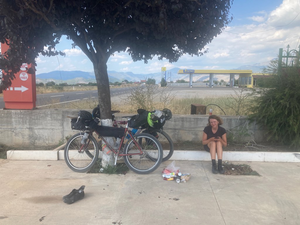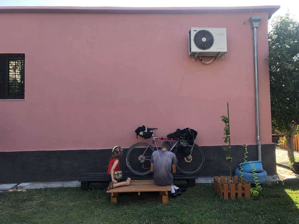 Nach einem Frühstück in der Unterkunft geht es weiter. Wiebke hatte leider keinen Appetit, also halten wir extra nochmal am Supermarkt und holen Salzbrezeln, damit sie wenigstens etwas isst. Ich spüre schon an den ersten Kilometern, dass es ihr heute nicht gut geht. Wir schaffen es 35 km aus Naryn heraus in Richtung Osten, bis Wiebke vom Rad kippt und sich mehrmals komplett entleert. Es schaltet in ihr um, und auf einen Schlag wird ihr alle restliche Energie aus dem Körper geraubt. Ich baue schnell das Zelt auf, damit sie kurz im Schatten liegen kann, während ich überlege, wie wir uns aus der Situation so kräfteschonend wie möglich retten können. Wir wissen von einer Unterkunft in dem Dorf Tash-Bashat, ein paar Kilometer vor uns. Alternativ könnten wir 35 km zurück nach Naryn fahren. In Wiebkes Zustand entscheiden wir uns für die kürzere Strecke nach Tash-Bashat. Ich schiebe Wiebke so viel es geht, wir rasten erneut im Schatten eines Baumes und schaffen es schließlich zu einem sehr gemütlichen Gästehaus in einem, wie auch sonst üblichen, sehr heruntergekommenen Dorf. Eine Oase am genau richtigen Ort – außerdem der letzte Ort, bevor es für über 100 km bis zum Yssyköl nichts mehr gibt. Was für ein Glück für Wiebke. Sie verbringt den restlichen Tag im Bett. Ich führe ein langes und wichtiges Arbeitstelefonat und besuche den Tante-Emma-Laden im Dorf. Abends gibt’s für mich leckeres Essen, gekocht von den Betreibern des Gästehauses. Wiebke bleibt lethargisch im Bett liegen, ohne Appetit.