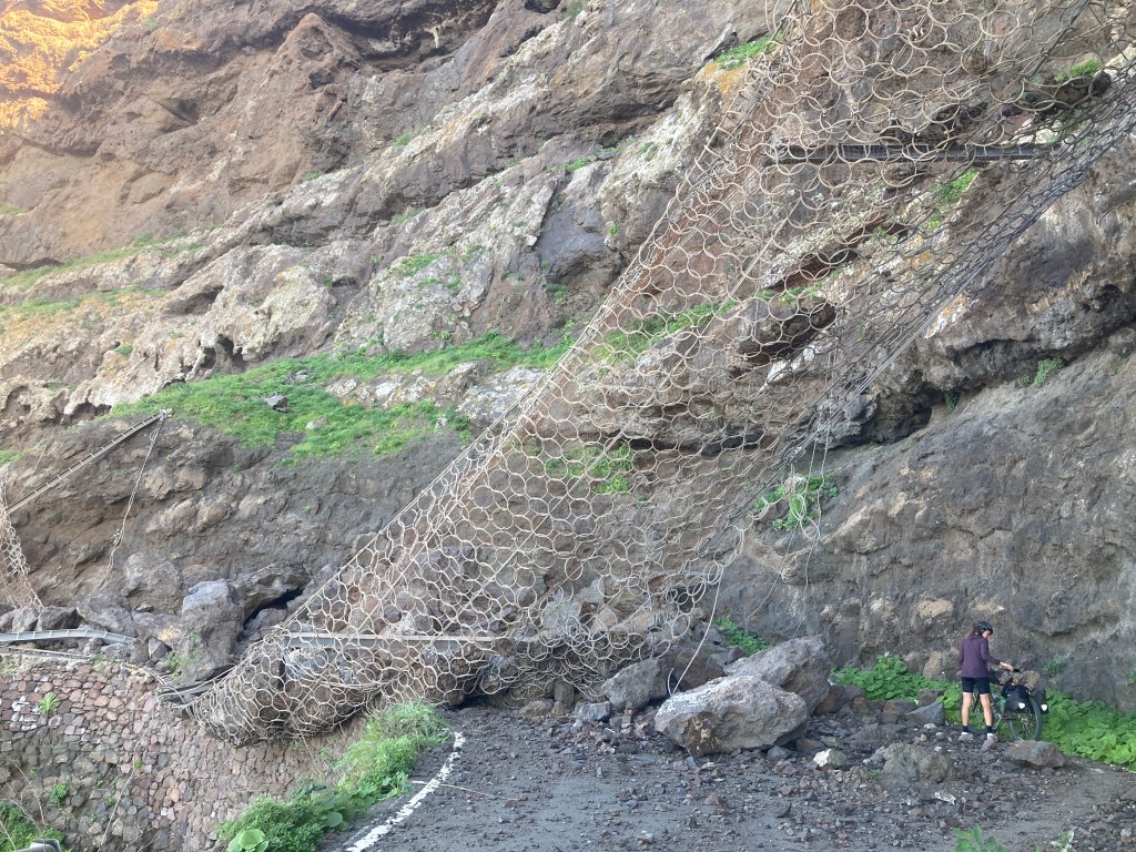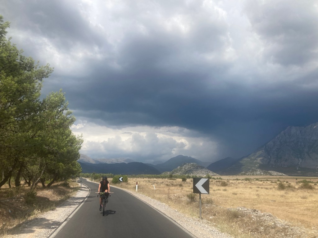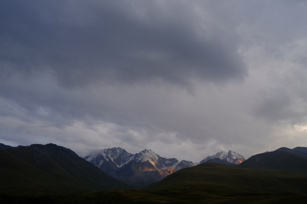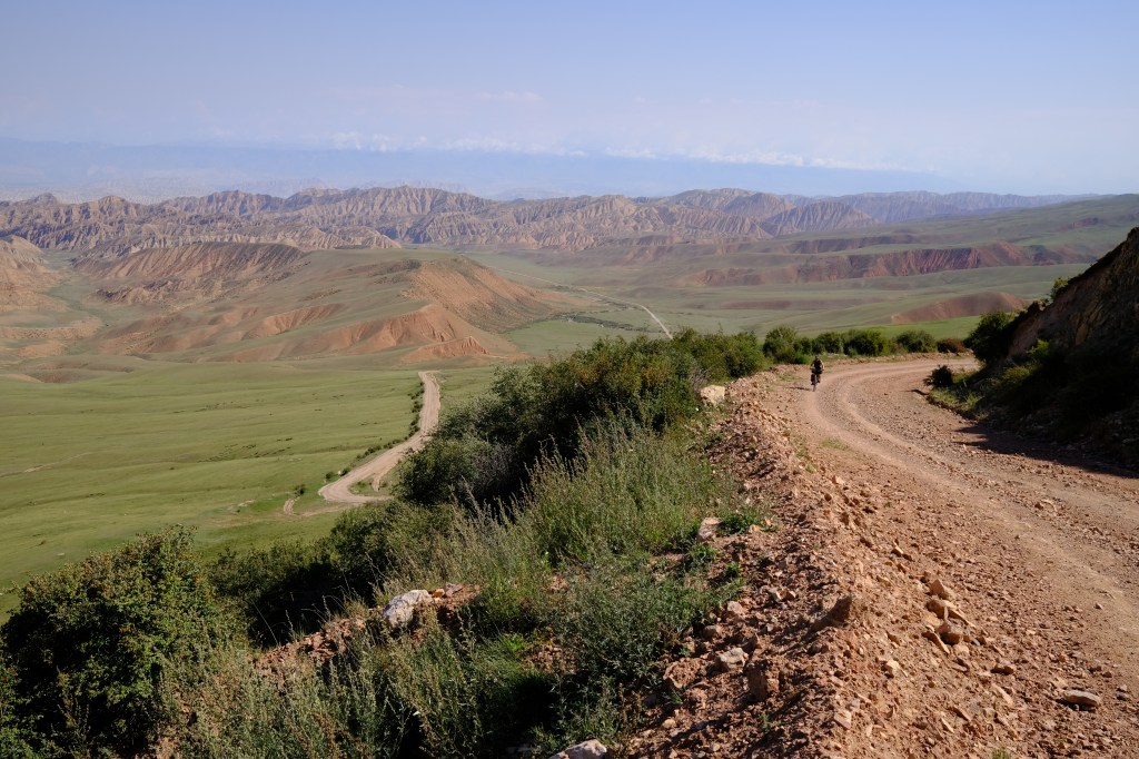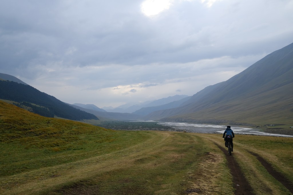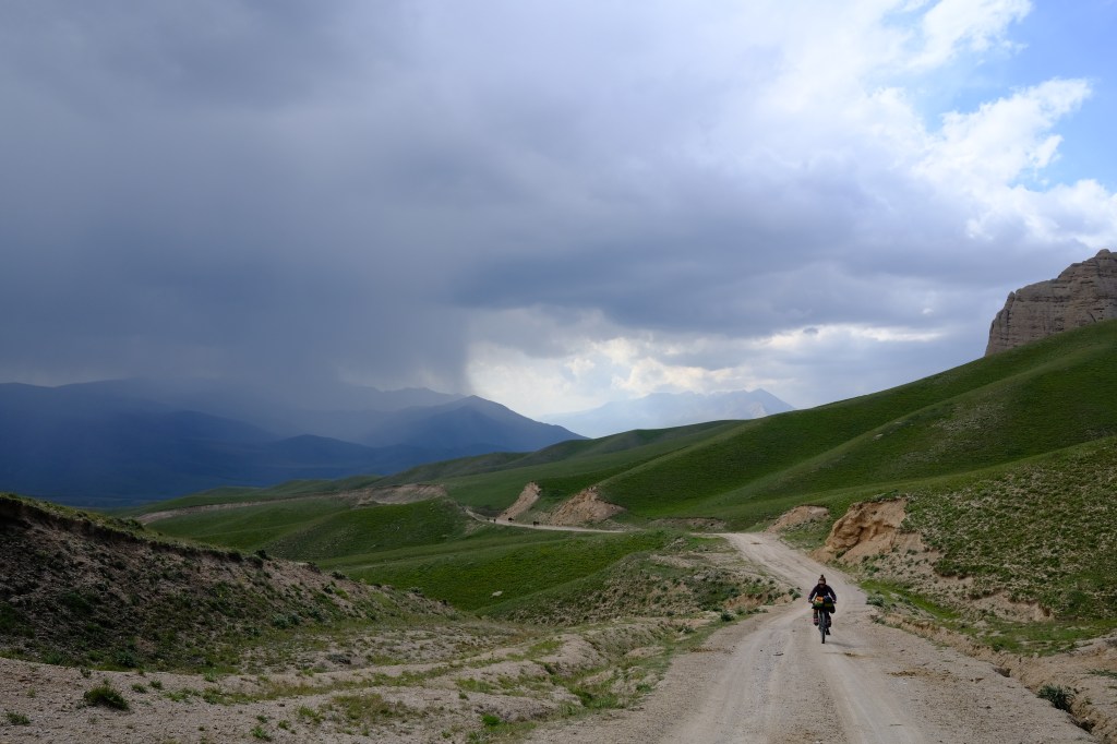 Wir gehen zum Frühstück in den dafür vorgesehenen Raum im Gästehaus und finden unseren Tisch mit drei Tellern vorbereitet. Wir freuen uns schon auf den unbekannten Gast. Es ist der Eigentümer des Hotels. Die folgende Unterhaltung ist sehr spannend. Seine Frau ist Ärztin in Deutschland. Den Winter verbringt er bei ihr. Das Hotel läuft nun im zweiten Sommer. Er hat hier viel Persönliches eingebracht und selbst gebaut. Man spürt auch den westlichen Touch. Er erzählt uns, dass er in der Vergangenheit politisch aktiv war und bis heute versucht, das kirgisische Zeitgeschehen zu beeinflussen. Sein Hauptthema ist die Bekämpfung der Korruption, für seinen Einsatz musste er sogar schon mehrere Jahre im Exil leben. Mit dem Gästehaus versucht er, seinem Heimatort neues und modernes Leben einzuhauchen. Als wir uns aufs Fahrrad schwingen, merkt Wiebke, dass sie wieder ganz die Alte ist, uns sollte also eine Weiterfahrt nichts im Weg stehen. Russische Elektrolyte wirken noch ;). Noch im Dorf begegnen wir zwei Russen auf Rädern. Ich freue mich auf einen Austausch über die aktuelle Weltpolitik, da ich es liebe, in andere Perspektiven einzutauchen, leider scheitert es an der Sprache. Sie sprechen nur rudimentäres Englisch und wir leider immer noch kein Russisch. Wir fahren unser Tempo weiter und sie versuchen offensichtlich krampfhaft, an unseren Hinterrädern zu bleiben, schaffen es aber nicht. Der folgende Canyon ist sehr schön. Den ganzen Tag geht es auf und ab (wir machen fast identische Höhen- wie Tiefenmeter). Irgendwann fahren wir aus dem Canyon heraus auf eine Hochebene. Das Licht ist fantastisch… Gegen Abend kommen wir an die Kreuzung, wo wir uns zwischen dem Tossor Pass und dem Barskoon Pass entscheiden müssen. Wir entscheiden uns für den Tossor Pass, in diese Richtung sieht es irgendwie netter aus. Außerdem haben wir langsam genug von der Hochebene und wollen wieder auf eine Passstraße. Zum Barskoon Pass sind es aber nochmal eine halbe Tagesdistanz über eine Hochebene. Vor ein paar Tagen gab es ein gröberes Unwetter, das gleiche, von dem uns die Lada-Reisenden im Gästehaus erzählt haben. Ein Teil des Seitenarms vom Fluss, der aus den Bergen ins Tal strömt, hat ein Feld der Verwüstung angerichtet und die Straße zerstört. Dort angekommen schlagen wir unser Zelt auf. Auf den ersten Blick sind wir nicht sicher, ob wir den Fluss sicher überqueren können und fragen uns, ob wir uns für den richtigen Pass entschieden haben. Wir verschieben die Entscheidung, ob und in welche Richtung wir weiterfahren, auf morgen und genießen den Abend. Außerdem bekommen wir noch eine Show geboten.