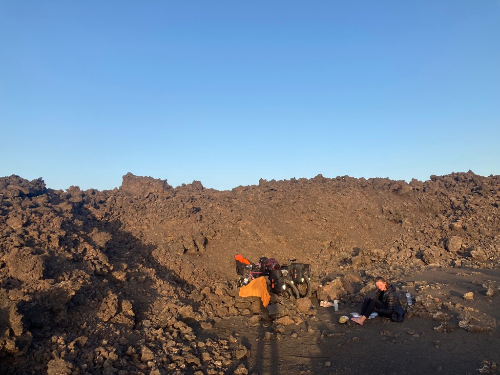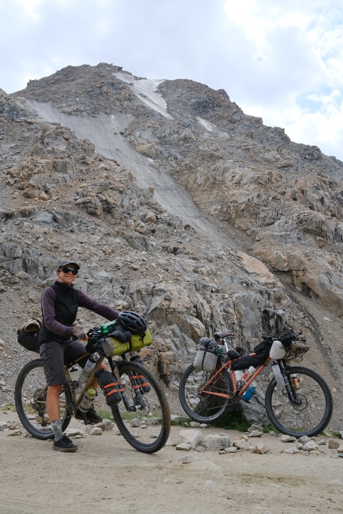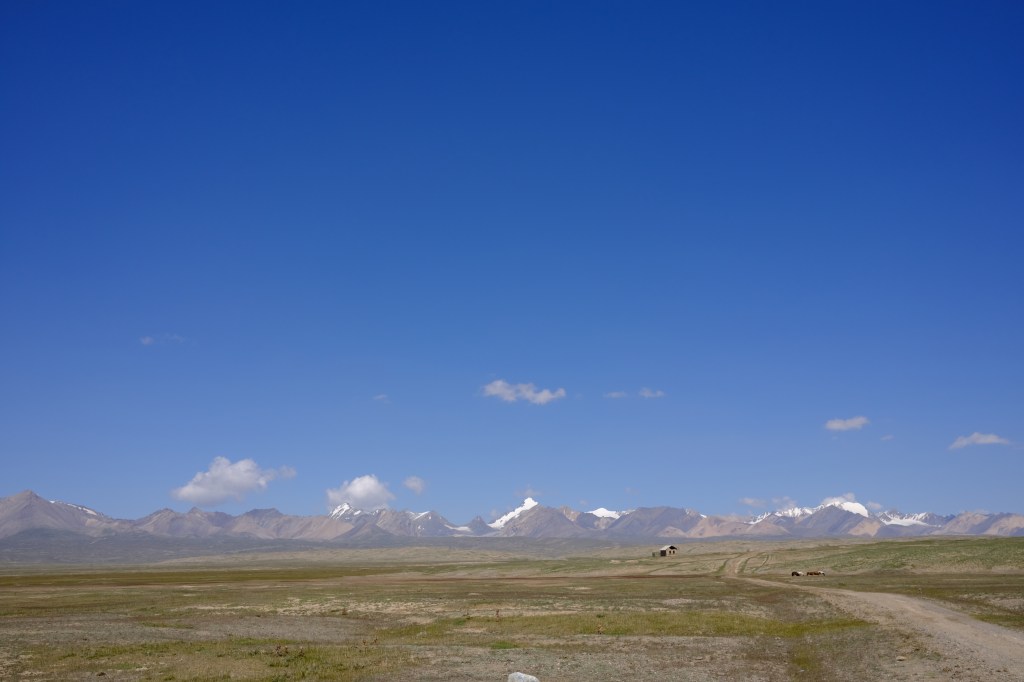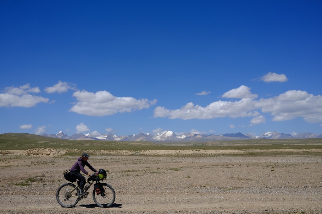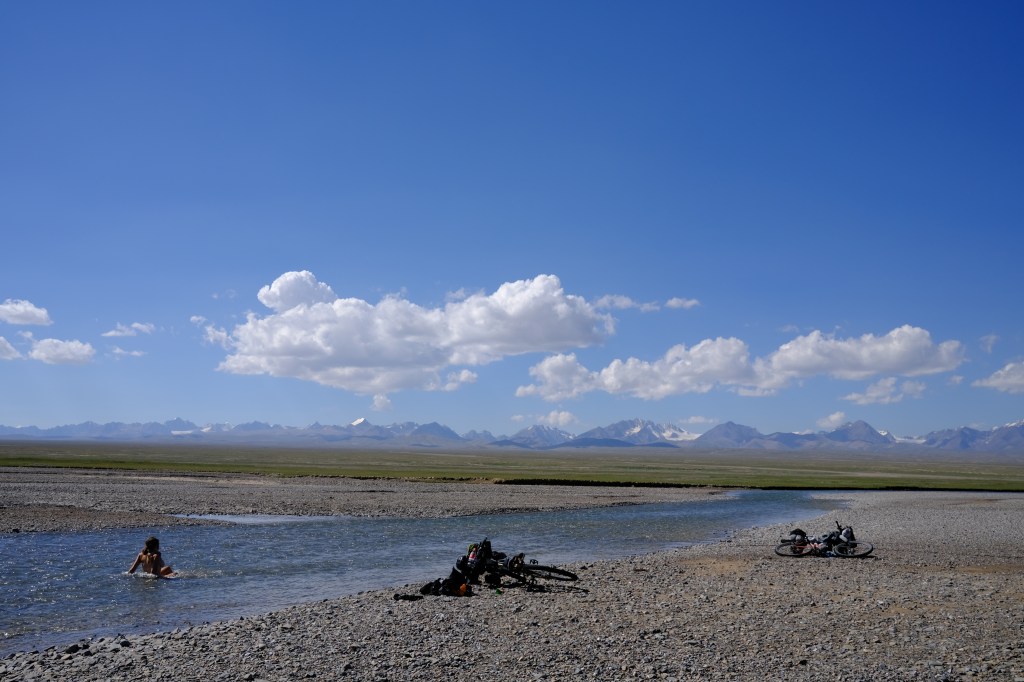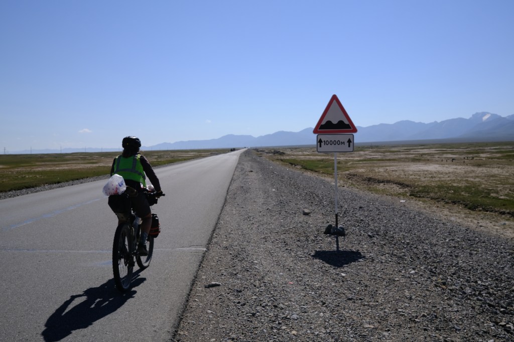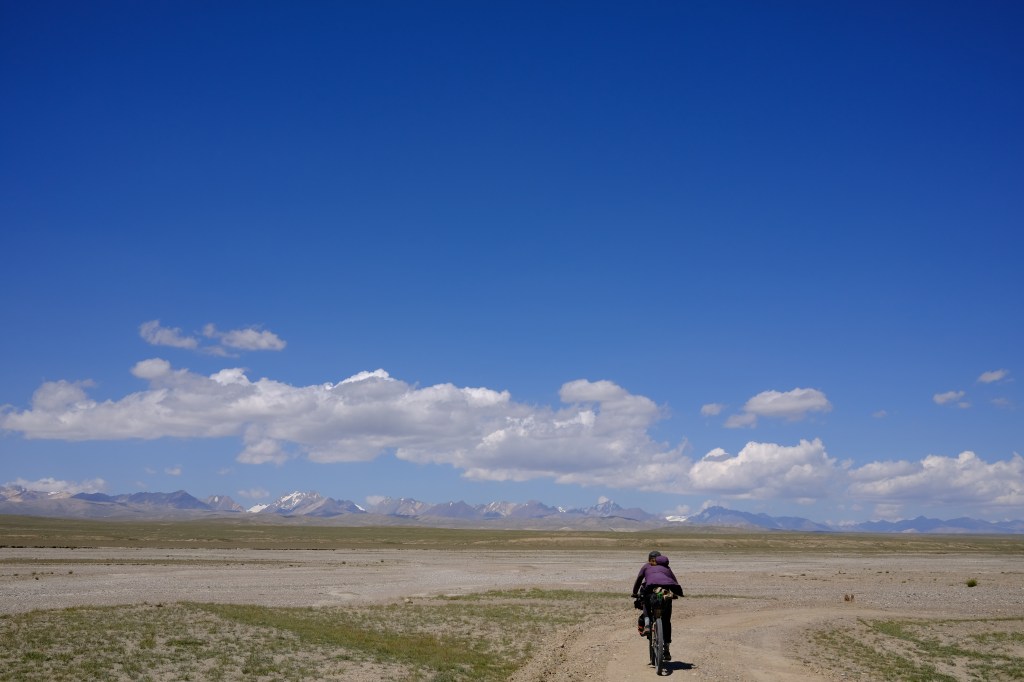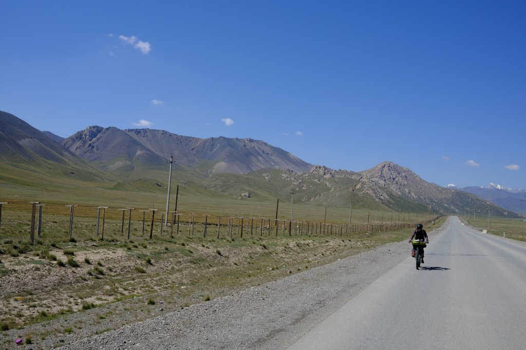 Wiebke hat heute einen schweren Start. Ich muss viel Rücksicht nehmen und warte immer wieder auf sie auf dem Weg nach oben. Genau, wir fahren mal wieder einen Pass hinauf. Dafür sind die Aussichten in alle Richtungen großartig: in eine Richtung schneebedeckte Berge, in die andere Richtung Wüste. Wir erreichen Mels Pass zur Mittagszeit, wo wir von drei Kirgisen zum Melonen- und Dosenfischessen eingeladen werden. Dazu gibt es frisch gebackenes Fladenbrot und Cola. Wir unterhalten uns mit der Übersetzungs-App über Kirgistan, Deutschland und deutsche Autos. Es sind drei Brüder, das Brot ist vom ältesten gebacken. Sie lieben Mercedes Sprinter, und er fragt, ob ich ihm einen Sprinter organisieren kann. Ich erkläre ihm, dass die Sprinter-Modelle, die sie in Kirgistan fahren, schon lange von viel neueren Modellen abgelöst wurden und die neuen bei weitem nicht mehr so haltbar und praktisch wie die alten sind. Gute alte Sprinter sind in Deutschland so teuer wie neue; darüber hat er gestaunt und sich gefreut, dass er einen alten guten Sprinter fährt. Wir fahren ein kleines Stück bergab. An einem Fluss wäscht sich Wiebke die Haare, darauf hat sie sich schon eine Weile gefreut. Wir nutzen den gleichen Fluss auch zum Auffüllen unserer Wasserflaschen. Danach fahren wir weiter über den Kulak Pass und entkommen mal wieder knapp dem nachmittäglichen Gewitter. Am Nachmittag gelangen wir auf den Chinese Highway, eine Art Bundesstraße, auf der quasi nur Lkw zwischen China und Kirgistan verkehren. Die Lkw überholen uns zum Glück mit sehr viel Abstand. Wiebke ist mittlerweile sehr erschöpft, aber wir müssen noch ein Stück. Ich schiebe sie immer wieder, mit einer Hand auf ihrem Rücken, mit der anderen am Lenker, und drücke auf die Pedale, was geht. Wir haben uns für diesen Abschnitt entschieden, was bedeutet, dass wir eine gewisse Strecke zurücklegen müssen, sonst geht uns lange vor Ankunft im nächsten Ort das Essen aus. Wiebke hat also leider keine Wahl und muss durchziehen. Irgendwann erreichen wir einen Militärcheckpoint; hier darf man nur mit einem Permit weiterfahren, da es von hier auf Asphalt nur noch nach China geht und sonst nirgendwohin. Gleichzeitig ist der Grenzübergang aber nur für den Warenverkehr geöffnet. Wir haben uns schon vorher um das Permit gekümmert. Kurz vor der Grenze kann man von der Asphaltstraße abbiegen und auf Schotter über eine gewaltige Hochebene zurück in die Zivilisation fahren, entlang der chinesischen Grenze. Und genau das haben wir vor. Am Checkpoint fragen wir nach Wasser, und der Polizist „beschlagnahmt“ prompt mehrere 500-ml-Wasserflaschen von chinesischen Lastwagenfahrern und streckt sie uns entgegen. Außerdem finden wir noch einen Container, wo eine alte Frau Cola und Brot verkauft. Es gibt wirklich genau nur Cola und Brot; wir nehmen beides, essen ein Stück des Brotes, und weiter geht die Fahrt in Richtung chinesische Grenze. Wir pedalieren noch ein paar Kilometer in den Sonnenuntergang und finden einen Schlafplatz 100 Meter neben der Straße auf 3000 m mit Blick auf schneebedeckte Berge.