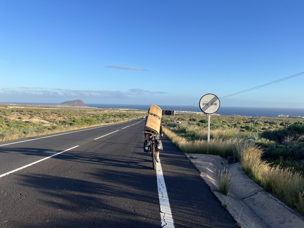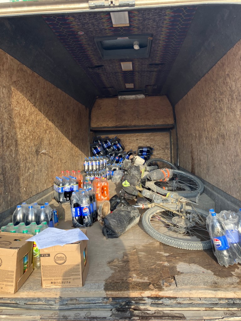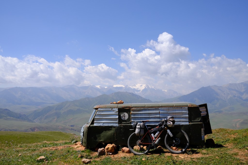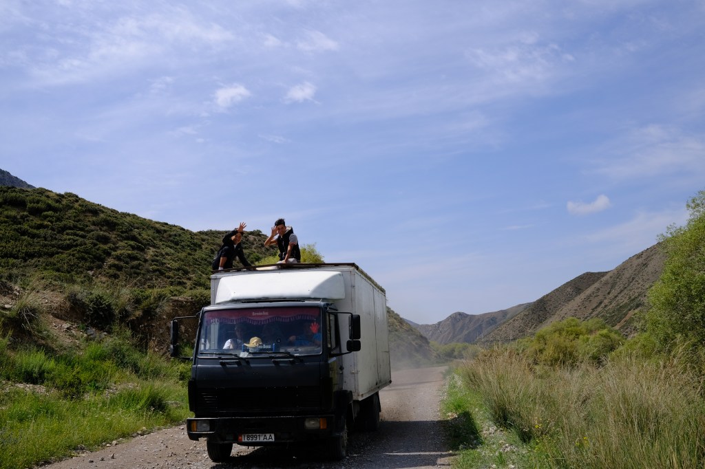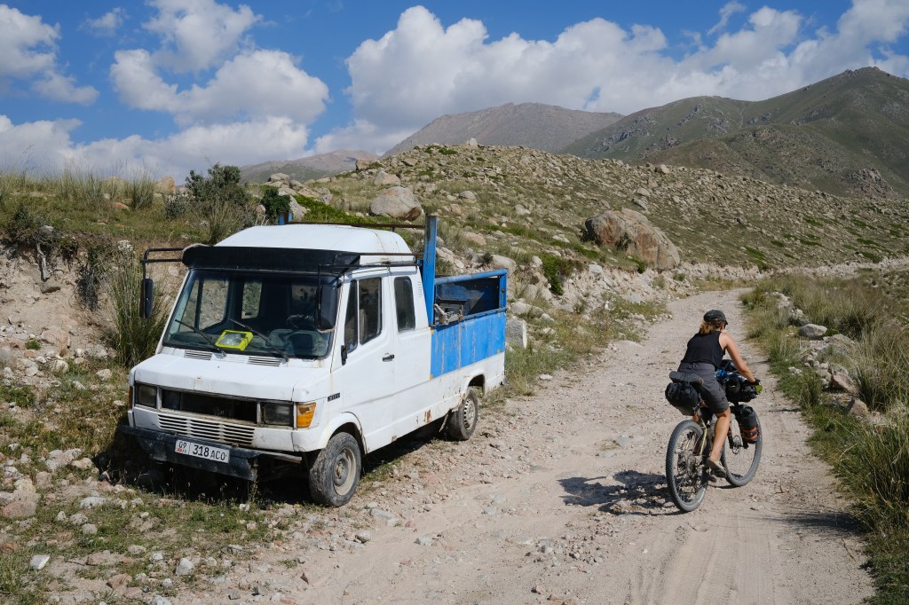 Nach dem Frühstück gibt es heute also erstmal nasse Füße. In der Früh fließt deutlich weniger Wasser, und wir kommen gut durch den Fluss. Danach geht es gemächlich hinauf zum Torrso-Pass auf 3900 m. Es ist wieder unglaublich schön und einsam. Wir treffen nur wenige Menschen – heute dafür sogar mal ein paar Radreisende, darunter ein britisches Pärchen auf einem Tandem. Sie sind in Almaty gestartet und wollen den gesamten Indischen Subkontinent hinunterfahren. Nach ein paar Schiebepassagen mit überwältigender Aussicht erreichen wir den Pass und kochen uns endlich eine schöne Portion Instant-Nudeln, um dann gestärkt die Abfahrt über 2000 Höhenmeter in Angriff zu nehmen. Unzählige Kehren rollen wir hinunter – es ist wunderschön, und wir durchqueren mal wieder mehrere verschiedene Vegetationszonen. Unten angekommen suchen wir einen Supermarkt und gönnen uns Müsli mit Milch und viel Schokolade! Dafür müssen wir ein paar Kilometer auf der Hauptstraße entlang des Yssykköl fahren, wo zum ersten Mal auf unserer Reise nennenswerter Auto- und Lkw-Verkehr herrscht. Die kirgisischen Autofahrer sind nicht gerade fahrradfreundlich – das muss man einfach so sagen. Wir überlegen nicht lange und entscheiden uns, den Abschnitt nach Karakol per Mitfahrgelegenheit zu überbrücken. Ehrlich gesagt wollen wir uns die bisher einsamen 1.000 zurückgelegten Kilometer nicht mit einer 100 km langen Fahrt auf der Hauptstraße kaputtmachen. Wiebke organisiert einen Stift und beginnt, „Karakol“ auf einen Pappkarton zu schreiben. Doch bevor sie fertig ist, kommen schon ein paar Jungs auf uns zu, die gerade den Laden mit Getränken beliefern, und bieten uns eine Mitfahrgelegenheit an. Wir legen die Räder in den geräumigen Laderaum des uralten Mercedes Düdo und nehmen in der Fahrerkabine Platz. Mit uns reisen drei Lieferanten – insgesamt sind wir also fünf Personen. Es gibt allerdings nur drei Sitzplätze, aber das wird schon irgendwie passen. Schlussendlich klettert Wiebke in die provisorische Schlafkabine über dem Cockpit, und wir Männer sitzen zu viert nebeneinander auf der Dreier-Sitzbank. Unterwegs halten wir noch an zwei weiteren Märkten und helfen, die Getränke ins Geschäft zu tragen. Danach geht es zwei Stunden lang weiter über eine schlechte Straße nach Karakol. Wir versuchen, uns über eine Übersetzungs-App zu unterhalten – eine köstliche Erfahrung. Ich sitze neben dem Fahrer und beobachte, wie er immer im höchsten Gang Vollgas gibt, bis wir 120 km/h erreichen. Nach einer Weile springt der Gang heraus, und der Fahrer lässt den Transporter ausrollen, bis wir auf 60 km/h abgebremst sind. Dann „würgt“ er den Gang wieder hinein und gibt erneut Vollgas – bis der Gang wieder herausspringt. So geht es die ganze Fahrt über die Überlandstraße hinweg. Während der Fahrt buchen wir uns ein Zimmer in Karakol und werden sogar direkt bis vor die Tür der Unterkunft gefahren. Der Transporter wird mit zwei abisolierten Kabeln ausgemacht, die links aus dem Armaturenbrett ragen und dafür kurz aneinandergehalten werden. Leider gibt es einen Buchungsfehler, und wir müssen uns noch eine andere Unterkunft suchen. Doch kurze Zeit später stehen wir unter einer Dusche und liegen im Bett. Karakol ist eine der größeren Städte in Kirgistan und bietet dementsprechend viele kostengünstige Übernachtungsmöglichkeiten.