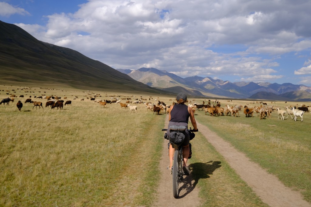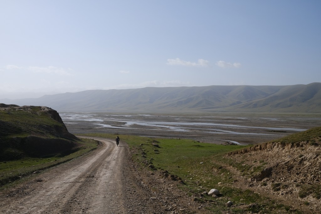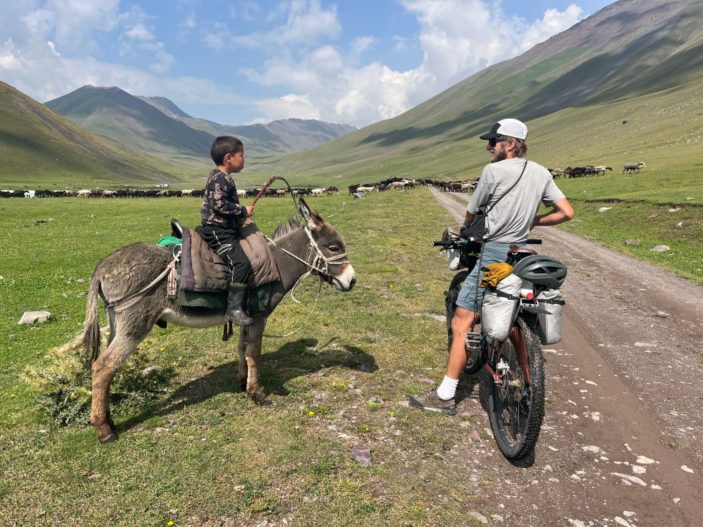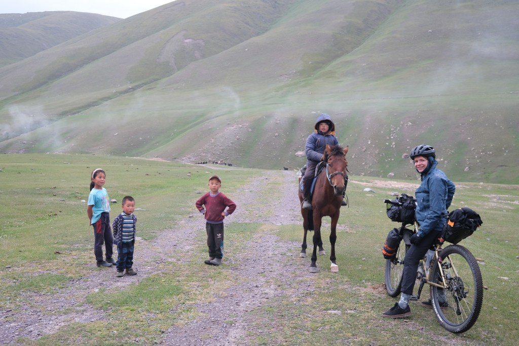 Heute müssen wir nur über einen kleineren Pass, den Karakol Pass auf 3.455 m. Danach sollte es für 2.000 hm und 150 km bergab gehen. Hört sich eigentlich ganz entspannt an. Wir lernen allerdings schnell, dass alles viel weiter ist und viel länger dauert, als es auf der Karte wirkt. Am Pass angekommen, ist es sehr kalt und windig. Die Abfahrt beginnt mit mehreren Flussdurchquerungen, bei denen wir unsere Schuhe ausziehen und mit Sandalen den Fluss überqueren. Danach werden die Füße getrocknet und aufgewärmt und wieder in die trockenen Radschuhe gesteckt. Am ersten Tag habe ich mich noch gefragt, warum wir diesmal so viel Zeug dabei haben. Nach dem Regen am Kegeti Pass gestern und dem starken Wind heute verstehe ich, dass man hier gerne mindestens eine Schicht mehr am Körper trägt zum Radfahren als bei uns zu Hause mitten in Europa. Zum ersten Mal ziehe ich es vor, eine lange Hose zum Radreisen zu tragen. Wir fahren an vielen Nomaden, ihren Jurten und unzähligen Tieren vorbei, zumeist halb wild gehalten, ohne einen Zaun weit und breit. Wir treffen Kinder im Grundschulalter, die alleine von ihrem Pferd oder Esel eine riesige Schafsherde hüten. Anderswo kommen Kinder aus den Lagern gerannt, die sich oft mehrere 100 Meter von der Straße entfernt befinden. Sie erkennen uns oft lange, bevor wir sie erkennen, und starten ihren Lauf, um uns an der Straße den Weg zu versperren. Oft kennen sie drei Wörter auf Englisch: „Hello“, „Chocolat?“ und „Money?“. Wir haben leider keine Schokolade, wir haben nicht einmal Schokolade für uns selbst, sondern nur Trockenfrüchte. Damit geben sie sich auch zufrieden, auch wenn sie oft mehr von uns erwartet hätten.