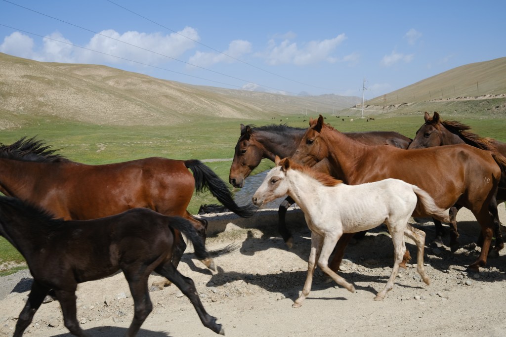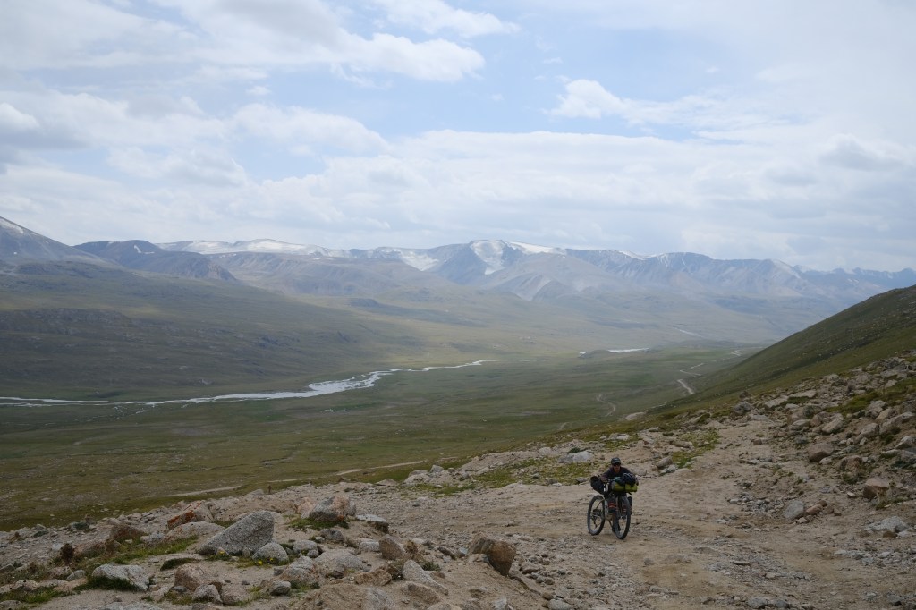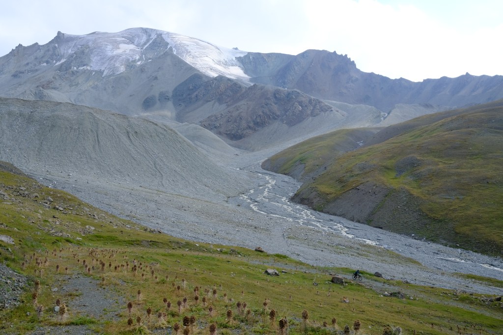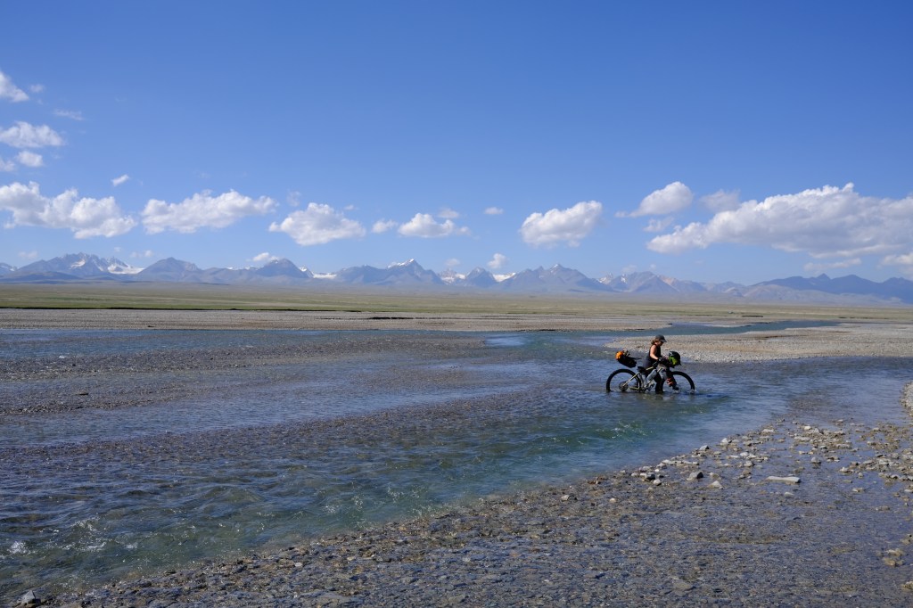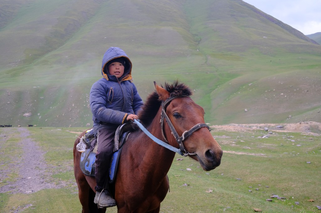 Heute müssen wir nur über einen kleineren Pass, den Karakol Pass auf 3.455 m. Danach sollte es für 2.000 hm und 150 km bergab gehen. Hört sich eigentlich ganz entspannt an. Wir lernen allerdings schnell, dass alles viel weiter ist und viel länger dauert, als es auf der Karte wirkt. Am Pass angekommen, ist es sehr kalt und windig. Die Abfahrt beginnt mit mehreren Flussdurchquerungen, bei denen wir unsere Schuhe ausziehen und mit Sandalen den Fluss überqueren. Danach werden die Füße getrocknet und aufgewärmt und wieder in die trockenen Radschuhe gesteckt. Am ersten Tag habe ich mich noch gefragt, warum wir diesmal so viel Zeug dabei haben. Nach dem Regen am Kegeti Pass gestern und dem starken Wind heute verstehe ich, dass man hier gerne mindestens eine Schicht mehr am Körper trägt zum Radfahren als bei uns zu Hause mitten in Europa. Zum ersten Mal ziehe ich es vor, eine lange Hose zum Radreisen zu tragen. Wir fahren an vielen Nomaden, ihren Jurten und unzähligen Tieren vorbei, zumeist halb wild gehalten, ohne einen Zaun weit und breit. Wir treffen Kinder im Grundschulalter, die alleine von ihrem Pferd oder Esel eine riesige Schafsherde hüten. Anderswo kommen Kinder aus den Lagern gerannt, die sich oft mehrere 100 Meter von der Straße entfernt befinden. Sie erkennen uns oft lange, bevor wir sie erkennen, und starten ihren Lauf, um uns an der Straße den Weg zu versperren. Oft kennen sie drei Wörter auf Englisch: „Hello“, „Chocolat?“ und „Money?“. Wir haben leider keine Schokolade, wir haben nicht einmal Schokolade für uns selbst, sondern nur Trockenfrüchte. Damit geben sie sich auch zufrieden, auch wenn sie oft mehr von uns erwartet hätten.