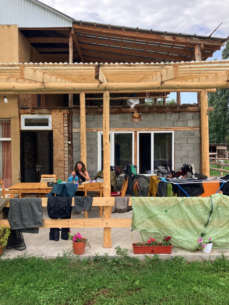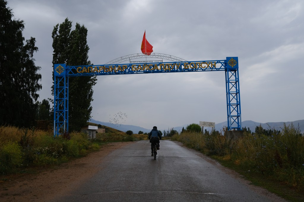 Es regnet nach wie vor. Wir krabbeln aus dem Zelt ins Nasse, trinken schnell einen Instantkaffee und essen dazu einen Keks. Widerwillig packen wir alles zusammen – mittlerweile ist alles nass. Wir machen uns nicht mehr die größte Mühe, irgendetwas trocken zu halten, sondern vertrauen darauf, dass wir im Laufe des Tages bei hoffentlich besserem Wetter unsere Ausrüstung trocknen können. Wir setzen unsere Fahrt das Tal hinaus fort, heute mit Rückenwind, aber tief hängenden Wolken, wenig Aussicht, Regen und kalten Temperaturen. Gegen Mittag erreichen wir das Dorf Kaindy, wo wir eine Stunde in einer Bushaltestelle verbringen, um den Starkregen vorbeiziehen zu lassen. Nicht weit entfernt finden wir ein Guesthouse und entscheiden uns, den restlichen Tag dort zu verbringen – die Wetteraussichten für den Nachmittag sind nicht besser, und auch morgen soll es den ganzen Tag regnen. Als wir ankommen, werden wir von einer sehr netten Familie empfangen. Die Frau betreibt das Guesthouse, der Mann hat alles selbst gebaut. Es gibt eine große überdachte Terrasse und einen Garten. Die Zimmer sind gemütlich – hier können wir entspannt zwei Nächte verbringen und das schlechte Wetter vorbeiziehen lassen, bevor wir zurück nach Bischkek radeln. Wir breiten all unsere Sachen zum Trocknen aus, kaufen im Dorfladen ein Bier und genießen es auf der Terrasse. Beim Abendessen treffen wir auf eine weitere Gruppe deutscher Reisender – drei ältere Frauen mit einem privaten kirgisischen Guide, der ausgezeichnet Deutsch spricht. Wir lauschen gespannt dem Gespräch und schnappen einige interessante Informationen über das Land auf. Das hausgemachte Essen, ein Drei-Gänge-Menü, schmeckt hervorragend. In einem richtigen Bett zu schlafen und ein Dach über dem Kopf zu haben, fühlt sich großartig an – draußen regnet und stürmt es die ganze Nacht.