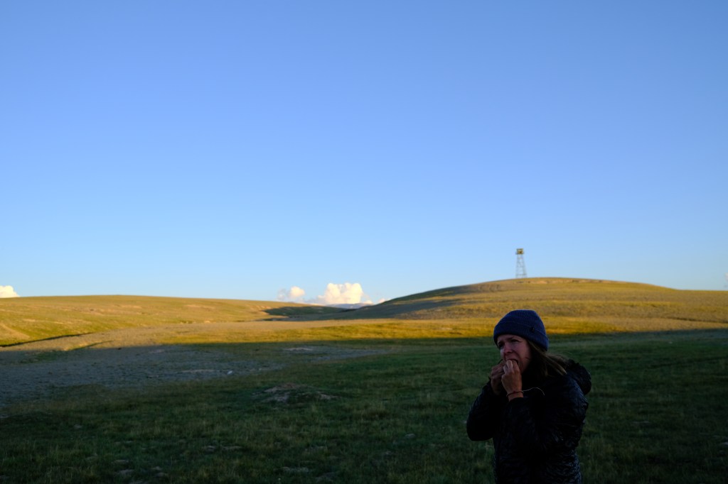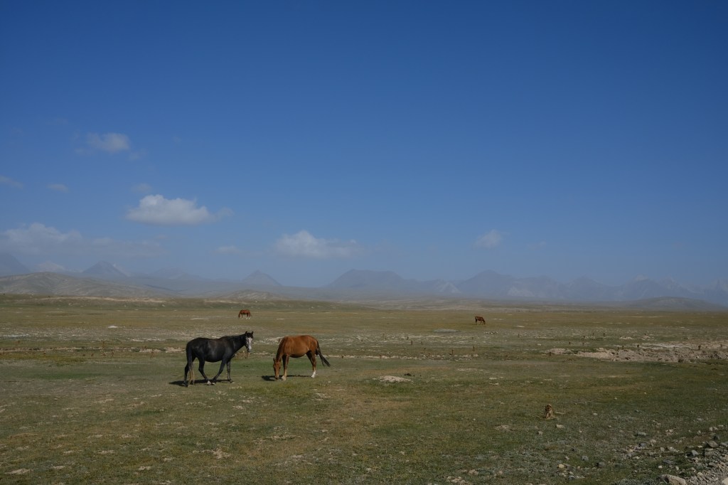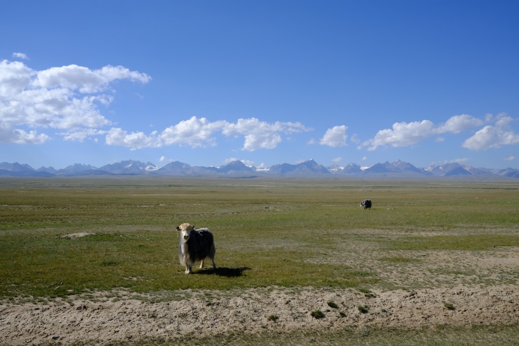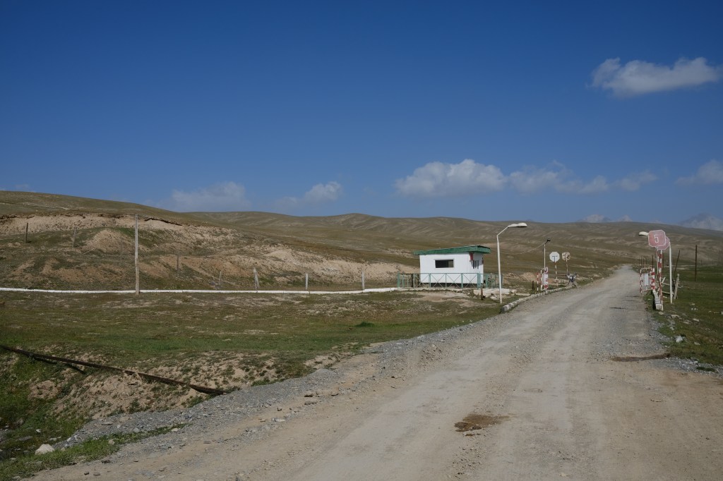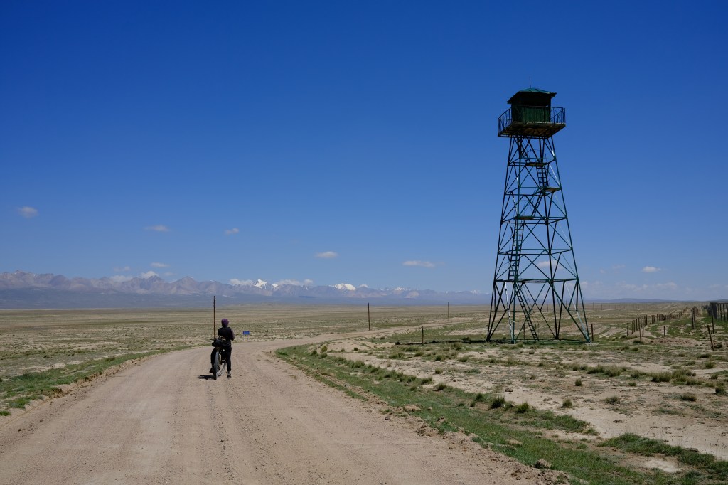 Nach einer kalten Nacht, wir haben nur dünne Schlafsäcke dabei und müssen dementsprechend alles anziehen was wir sonst dabei haben, geht es weiter auf dem Chinese Highway in Richtung Grenze. Dazwischen gibt es einen Abschnitt, der über 10 km einfach nur geradeaus geht; dieser Abschnitt scheint nie zu enden. Rechts neben der Straße werden Bohrungen durchgeführt. Angekommen an der chinesischen Grenze hoffen wir noch auf Wasser oder einen kleinen Imbiss. Die Tankstelle, die auf Google Maps eingezeichnet ist, scheint schon länger nicht mehr in Betrieb zu sein. Wir halten wieder Lkw-Fahrer an, fragen nach Wasser und erhalten mehrere Flaschen – ein wohltuendes Backup. Obwohl wir einen Wasserfilter dabei haben, wollen wir wirklich nur im Notfall darauf zurückgreifen und so viel wie möglich Wasser aus verlässlichen Quellen beziehen. An der Grenze wechseln wir wieder ins einsame Territorium. Auf uns warten rund 100 km absolute Einsamkeit auf einer Hochebene über 3000 m. Wir treffen über viele Kilometer niemanden, sogar Tiere sind rar. Irgendwann stoßen wir auf Yaks! Sie sehen mit ihrem zotteligen Fell furchteinflößend aus, stellen sich aber als sehr scheu heraus. Zum Mittag gibt es Nudelsuppe. Wir durchqueren trockene Flussbetten und radeln den ganzen Tag mit leichtem Gegenwind, dafür immer etwas bergab. Plötzlich tut sich ein wunderschöner, breiter, flacher Fluss auf. Wir baden, waschen und filtern Wasser; das Wasser ist herrlich und so klar, wie es nur geht – für uns eine Definition von verlässlicher Wasserquelle. Wir schieben die Räder durch den Haupt- und mehrere Seitenarme des Flusses. Nach einem Tag in Einsamkeit tauchen wieder sehr vereinzelt Höfe auf, und wir beobachten zwei Kirgisen, wie sie parallel zu uns auf ihren Pferden in die gleiche Richtung reiten. Am Abend müssen wir eine Entscheidung treffen: Fahren wir die extra Runde zum Kol’Su oder nicht? Der See ist quasi einer der Sehenswürdigkeiten in Kirgistan. Dementsprechend würden uns eine Vielzahl von Geländewagen mit Pauschaltouristen erwarten, sowie ein extra Tag Fahrzeit ohne wirkliche Möglichkeit, Verpflegung aufzuladen; unser Essen ist leider fast komplett aufgebraucht. Es gibt ein Jurten-Camp, aber wir haben weder Bargeld noch Lust, uns das zu gönnen nach der Erfahrung im letzten Jurt Camp. Außerdem ist nur noch ein Tag gutes Wetter gemeldet. Wir entscheiden uns gegen den See und gegen am darauf folgenden Regentag im Lehmmatsch die 120 km nach Naryn zu fahren. Wir werden direkt dorthin fahren und den angekündigten Schlechtwettertag als Ruhetag nutzen. Als Tagesabschluss klettern wir auf einen der vielen Wachtürme zwischen der kirgisisch-chinesischen Grenze und genießen die Aussicht. Wir überlegen kurz, oben auf dem Turm zu schlafen, aber er stellt sich als komplett von Vögeln vollgeschissen heraus. Wir bauen das Zelt mit Abstand am Fuße des Turms auf und schlafen hervorragend.