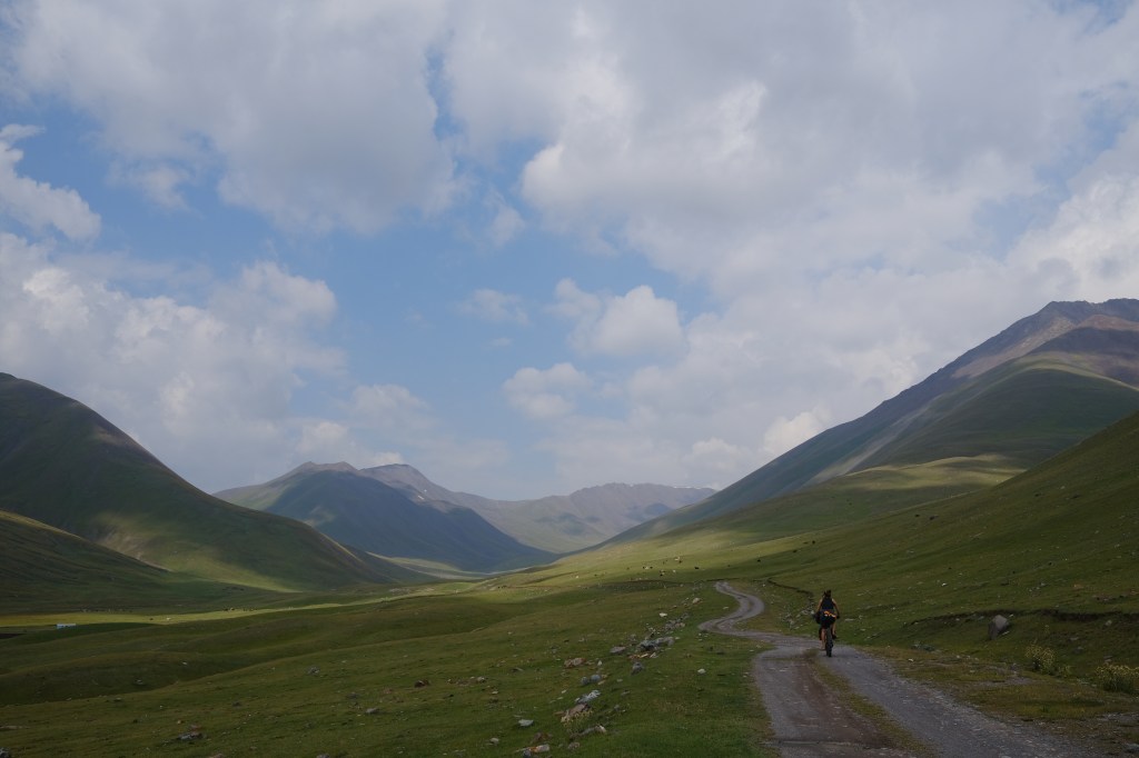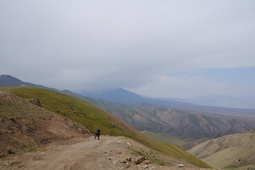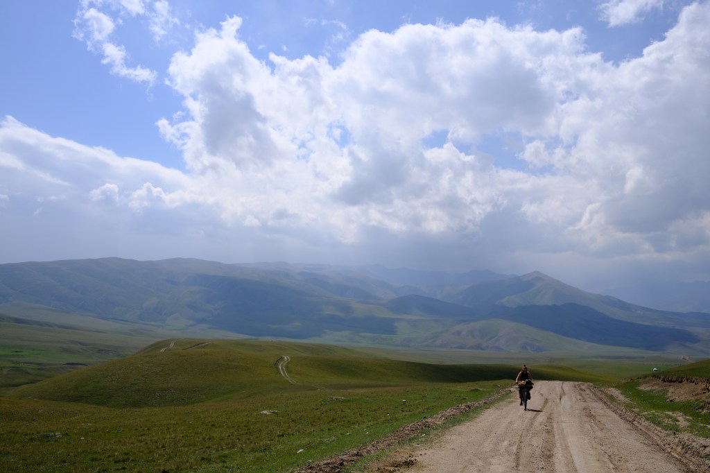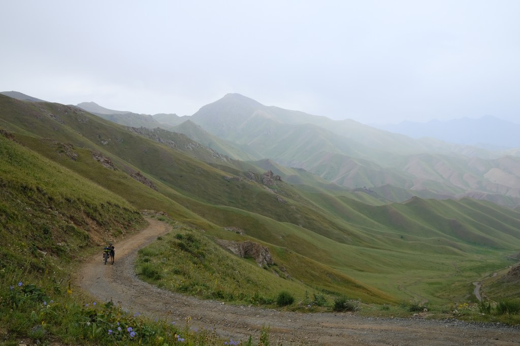 Als wir aufwachen, regnet es. Wir bleiben bis 8 Uhr liegen. Nach einem kurzen Frühstück treffen wir bereits nach wenigen Kilometern auf vier Kirgisen, drei Frauen und einen Mann. Die vier halten ein Psychologieseminar ab und laden uns auf Melone und Brot ein. Wir unterhalten uns so gut es geht. Sie sprechen nur sehr spärliches Englisch, wir sprechen weder Russisch noch Kirgisisch. Trotzdem haben wir eine großartige Zeit. Was für ein Willkommen für uns! Der Anstieg zum Kegeti Pass zieht sich. Lange nach der Mittagszeit sind wir noch immer nicht auf Passhöhe. Dazwischen beobachten wir Kirgisen, die mit ihren alten, auseinanderfallenden Autos mit extrem schlechten Reifen im Schotter stecken bleiben und sich wieder befreien. Es nieselt, und wir entscheiden uns, das Zelt aufzubauen für eine Pause. Es gibt Brot, Käse und danach einen kurzen Mittagsschlaf. Nachdem wir das Zelt wieder abgebaut haben, kommen uns zwei Italiener auf Rädern entgegen. Sie erzählen uns, dass gestern und heute die einzigen Regentage auf ihrer 30-tägigen Reise waren. Na dann hoffen wir mal dass es bei uns auch so wenig regnet die nächsten Wochen. Die letzten paar hundert Höhenmeter zum Pass müssen wir schieben. Die Straße ist kaputt und für Fahrzeuge unpassierbar. Mit guter Stimmung und umgeben von Wolke kommen wir auf unserem ersten Pass der Reise auf 3.800 m an. Wir haben seit gestern schon 4.000 Höhenmeter zurückgelegt. Auf der Abfahrt filtern wir Wasser und duschen an einem eiskalten Bach. Es regnet die ganze Zeit leicht. Am Fuße des Passes treffen wir auf eine Herde Pferde und auf Nomadenkinder, die von ihrer Jurte zu uns gerannt kommen. Wir schenken ihnen getrocknete Pflaumen. Eine Kurve weiter bauen wir unser Zelt auf einer Wiese gleich neben der Straße auf. Um uns herum ist eine unbeschreibliche Landschaft: Berge, wilde Bäche und Flüsse, riesige Wiesen, wie bei „Herr der Ringe“, dazwischen mehrere Nomadenvölker mit ihren Tierherden. Inzwischen hat es aufgehört zu regnen, wir kochen Reis (der leider verbrennt) und würzen mit Knoblauch, Salz und Olivenöl. Ein Klassiker, der uns schon auf vielen Radreisen versorgt hat. Mehr haben wir eh nicht dabei. Als wir ins Bett gehen wollen, kommen die vier Kinder von zuvor gemeinsam mit ihrer Mutter zu unserem Lagerplatz. Sie schenken uns fermentierte Pferdemilch und lassen uns aus ihrer Süßigkeitentüte wählen. Damit heißen sie uns willkommen in ihrem Land. Kurz danach schiebt sich eine riesige Schafsherde direkt an uns vorbei. Weiter weg treiben auch andere Nomaden ihre Herden für die Nacht Richtung Jurten.