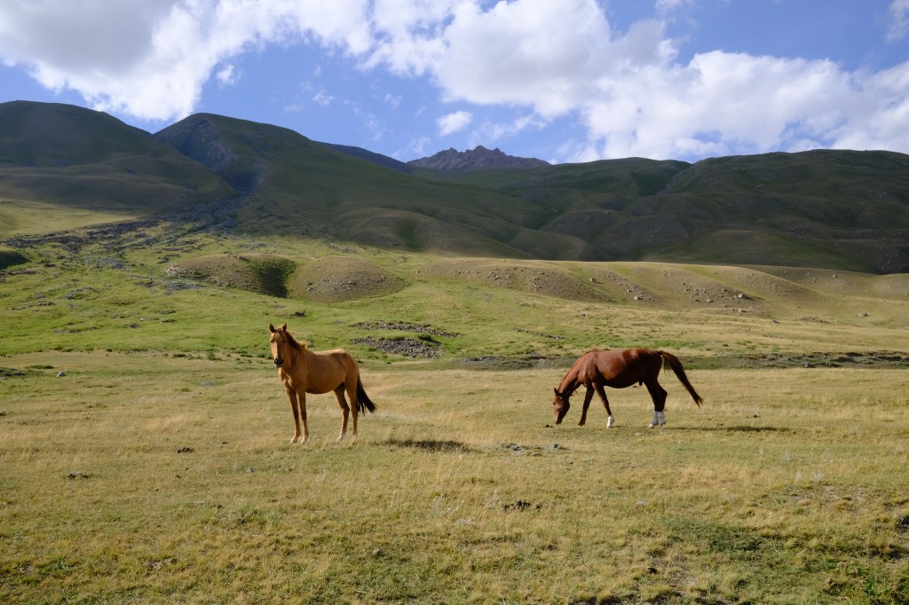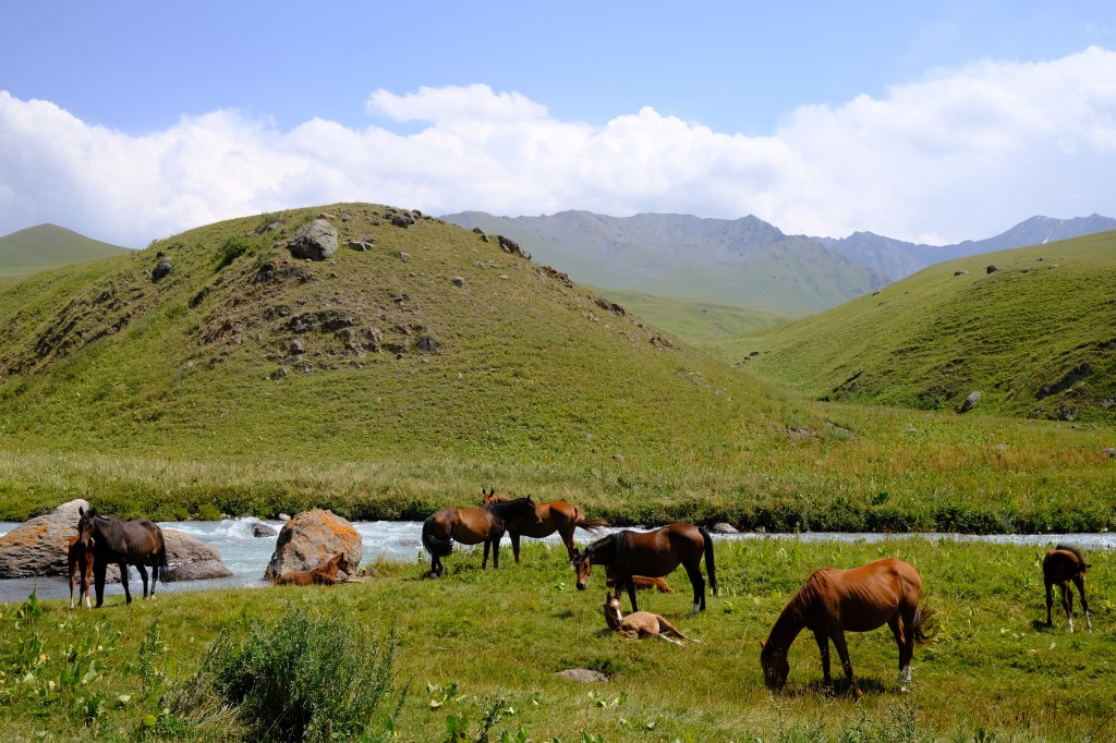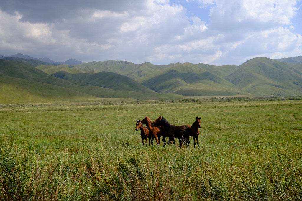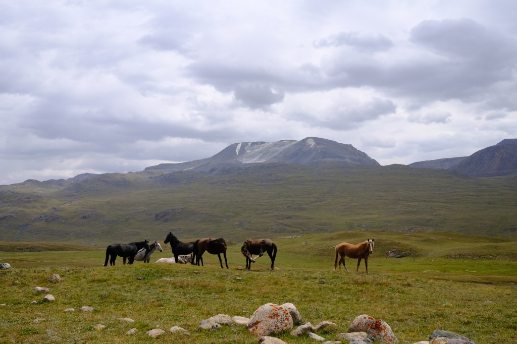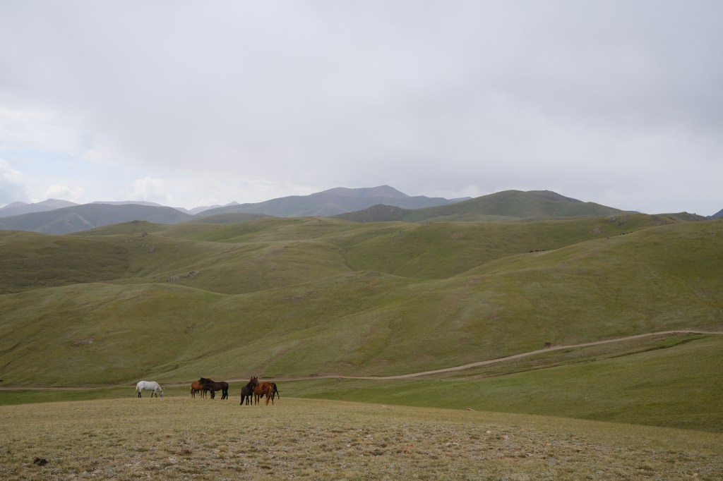 Als wir aufwachen, regnet es. Wir bleiben bis 8 Uhr liegen. Nach einem kurzen Frühstück treffen wir bereits nach wenigen Kilometern auf vier Kirgisen, drei Frauen und einen Mann. Die vier halten ein Psychologieseminar ab und laden uns auf Melone und Brot ein. Wir unterhalten uns so gut es geht. Sie sprechen nur sehr spärliches Englisch, wir sprechen weder Russisch noch Kirgisisch. Trotzdem haben wir eine großartige Zeit. Was für ein Willkommen für uns! Der Anstieg zum Kegeti Pass zieht sich. Lange nach der Mittagszeit sind wir noch immer nicht auf Passhöhe. Dazwischen beobachten wir Kirgisen, die mit ihren alten, auseinanderfallenden Autos mit extrem schlechten Reifen im Schotter stecken bleiben und sich wieder befreien. Es nieselt, und wir entscheiden uns, das Zelt aufzubauen für eine Pause. Es gibt Brot, Käse und danach einen kurzen Mittagsschlaf. Nachdem wir das Zelt wieder abgebaut haben, kommen uns zwei Italiener auf Rädern entgegen. Sie erzählen uns, dass gestern und heute die einzigen Regentage auf ihrer 30-tägigen Reise waren. Na dann hoffen wir mal dass es bei uns auch so wenig regnet die nächsten Wochen. Die letzten paar hundert Höhenmeter zum Pass müssen wir schieben. Die Straße ist kaputt und für Fahrzeuge unpassierbar. Mit guter Stimmung und umgeben von Wolke kommen wir auf unserem ersten Pass der Reise auf 3.800 m an. Wir haben seit gestern schon 4.000 Höhenmeter zurückgelegt. Auf der Abfahrt filtern wir Wasser und duschen an einem eiskalten Bach. Es regnet die ganze Zeit leicht. Am Fuße des Passes treffen wir auf eine Herde Pferde und auf Nomadenkinder, die von ihrer Jurte zu uns gerannt kommen. Wir schenken ihnen getrocknete Pflaumen. Eine Kurve weiter bauen wir unser Zelt auf einer Wiese gleich neben der Straße auf. Um uns herum ist eine unbeschreibliche Landschaft: Berge, wilde Bäche und Flüsse, riesige Wiesen, wie bei „Herr der Ringe“, dazwischen mehrere Nomadenvölker mit ihren Tierherden. Inzwischen hat es aufgehört zu regnen, wir kochen Reis (der leider verbrennt) und würzen mit Knoblauch, Salz und Olivenöl. Ein Klassiker, der uns schon auf vielen Radreisen versorgt hat. Mehr haben wir eh nicht dabei. Als wir ins Bett gehen wollen, kommen die vier Kinder von zuvor gemeinsam mit ihrer Mutter zu unserem Lagerplatz. Sie schenken uns fermentierte Pferdemilch und lassen uns aus ihrer Süßigkeitentüte wählen. Damit heißen sie uns willkommen in ihrem Land. Kurz danach schiebt sich eine riesige Schafsherde direkt an uns vorbei. Weiter weg treiben auch andere Nomaden ihre Herden für die Nacht Richtung Jurten.