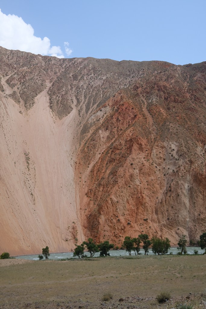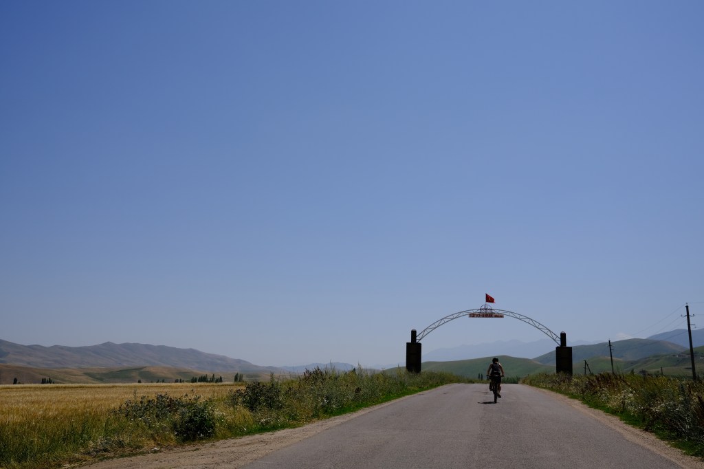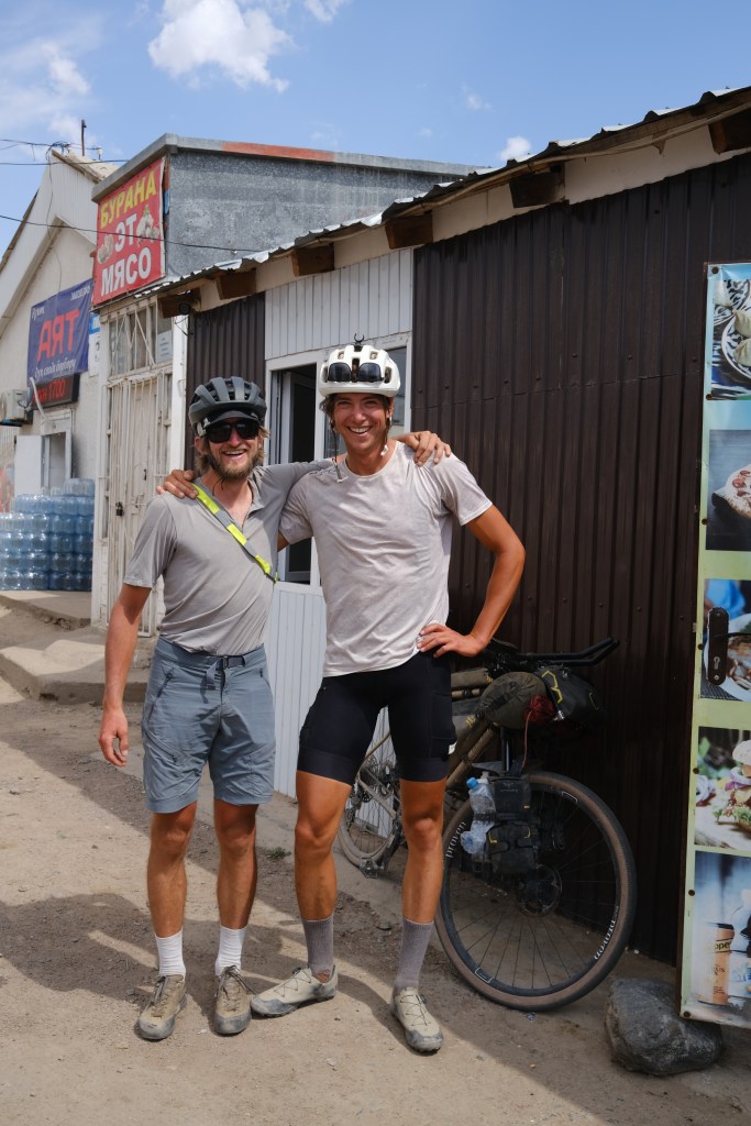 Einmal kommt ein Junge sogar von sehr weit her gerannt. Er gibt alles, als würde er um sein Leben rennen. Wir können ihn mehrere Minuten beobachten und treffen uns wie in einem Film zur gleichen Zeit an der Straße. Er, total erschöpft, fragt schnaufend wieder nach Schokolade. Wir können ihm leider trotzdem nur getrocknete Pflaumen anbieten, mehr haben wir nicht, und die Strecke bis zum nächsten Ort ist noch weit. Die Abfahrt zieht sich über den ganzen restlichen Tag; kleinere Anstiege, die auf dem Höhenprofil nicht erkennbar waren, ziehen sich lange. Wir verlieren trotzdem langsam an Höhe, und es wird wieder so heiß wie vor zwei Tagen in der Ebene um Bishkek. Schließlich finden wir mal wieder einen schattenspendenden Baum für eine Pause am Nachmittag. Ein paar Stunden später, einem schweren Gewitter entkommen und mit durchgerüttelten Handgelenken kommen wir am Abend in Kojomkul an, der ersten Ortschaft seit zwei Tagen, wo wir wissen, dass es Verpflegungsmöglichkeiten geben sollte. Wir haben Glück, und der Laden, den wir erst beim zweiten Vorbeifahren erkennen, schließt direkt nach unserem Einkauf. Das Dorf sieht aus, als wäre es zur Hälfte verlassen, und dies ist die einzige Möglichkeit für Verpflegung. Danach fahren wir an den Dorfrand und waschen uns im Fluss. An einem Kriegerdenkmal kochen wir Nudeln, diesmal mit Käse als Extra. Natürlich kommen uns auch wieder Kinder besuchen. Über unsere Übersetzungs-App verhandelt einer von ihnen mit uns; er möchte Taschen, unsere Telefone oder irgendetwas anderes geschenkt bekommen. Wir geben ihnen unseren halben Käse – sie spucken ihn sofort wieder aus. Wir lernen, doch lieber ein paar Schokoriegel extra dabei zu haben, das Snickers was wir ihnen außerdem geben wird schnell verputzt.